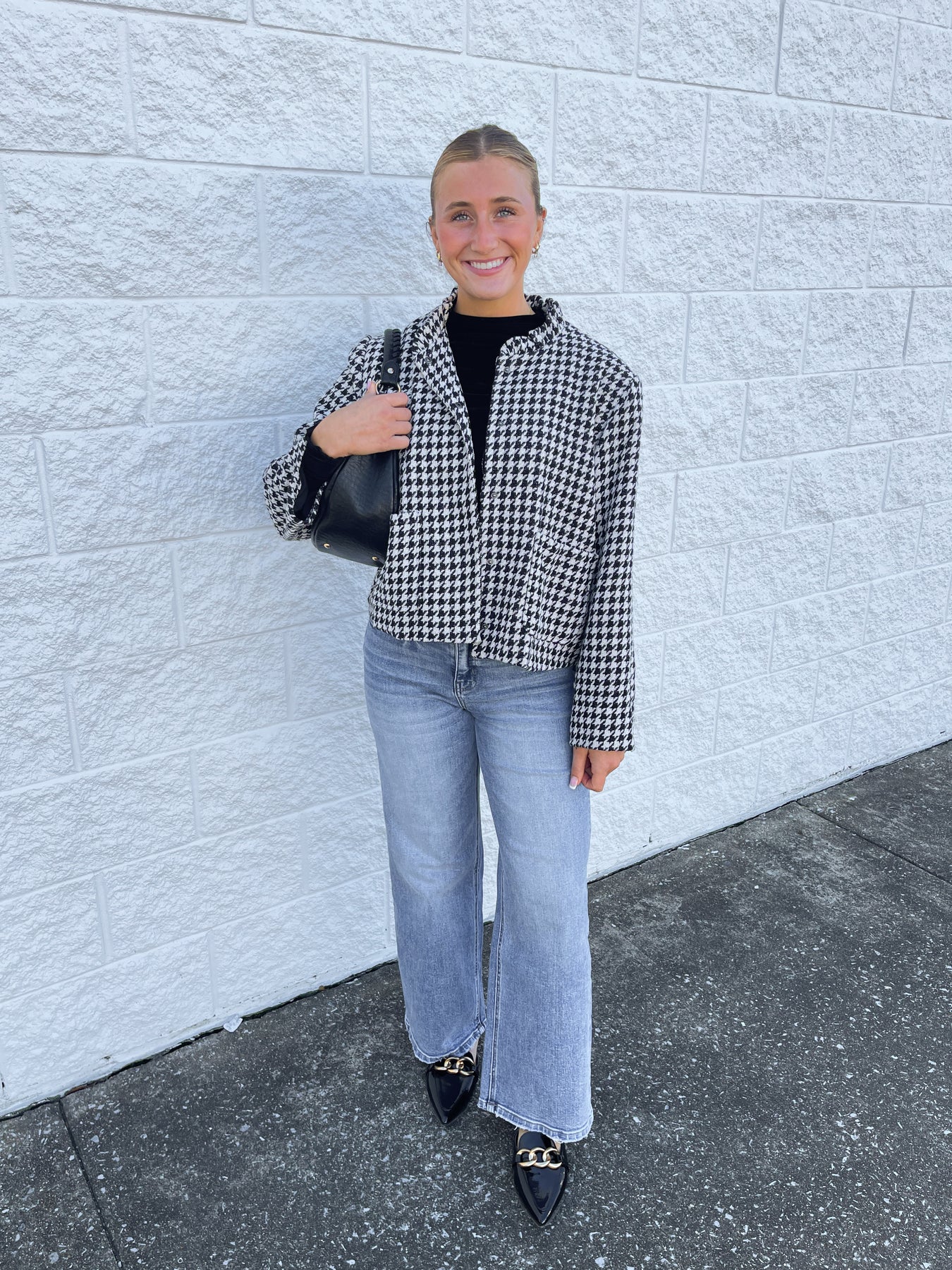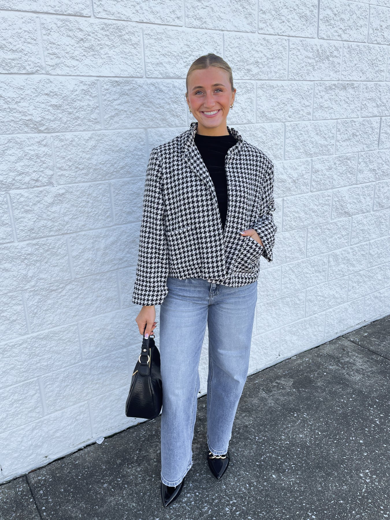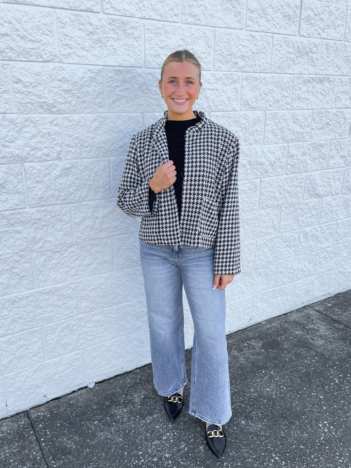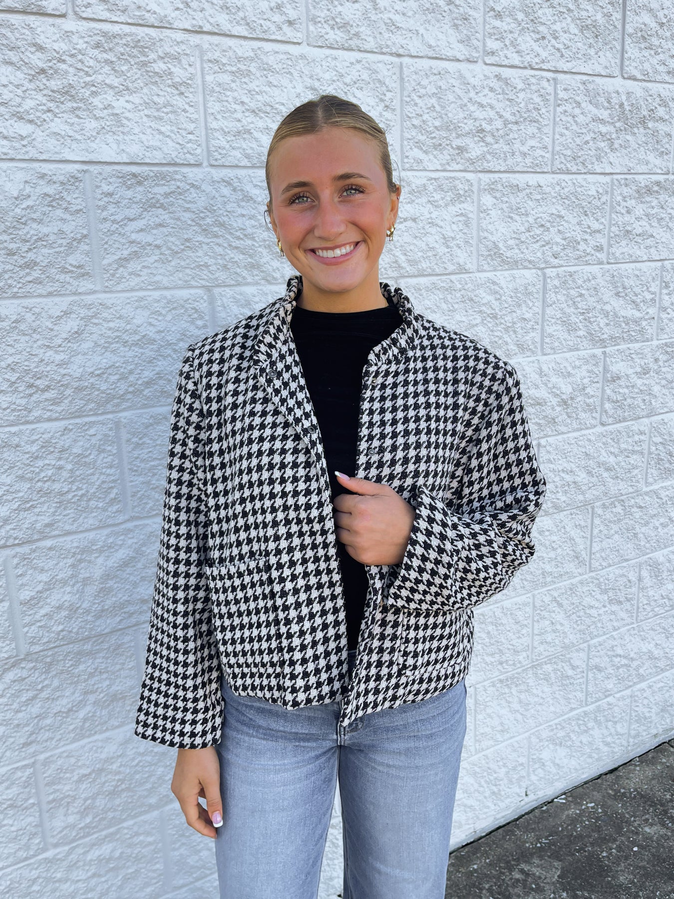 Elevate your fall and winter style with the Glam Black Plaid Jacket! Featuring a stunning black and white houndstooth pattern, a playful ruffle collar, and chic buttons along the bodice, this trendy jacket adds a touch of dressy flair to any outfit. Perfect for turning heads with effortless charm.