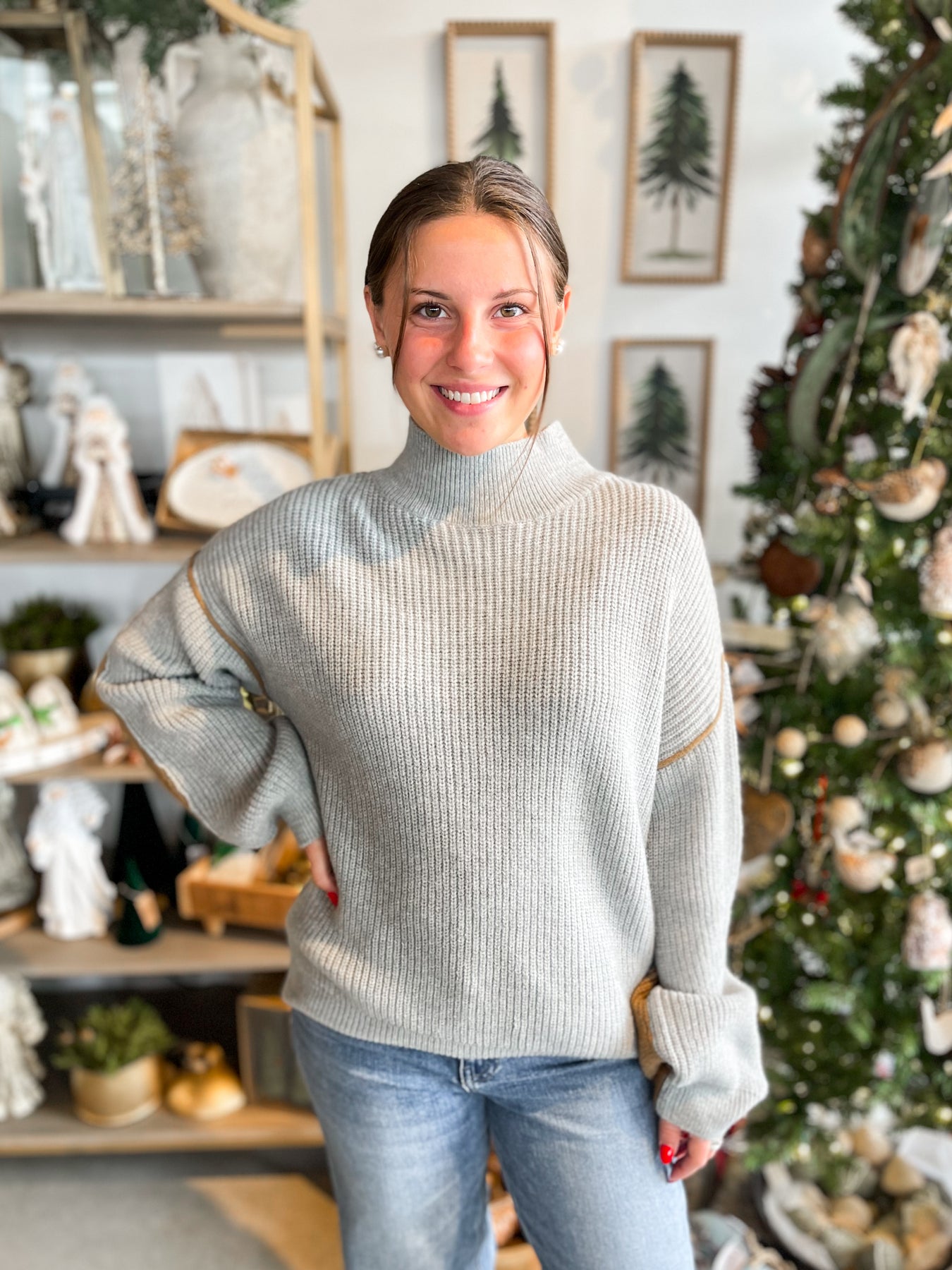 Stay cozy and cute in our Grey Mock Neck Sweater. The two-toned design and soft material add a playful touch to this must-have winter staple. Perfect for adding a touch of quirk to your wardrobe!