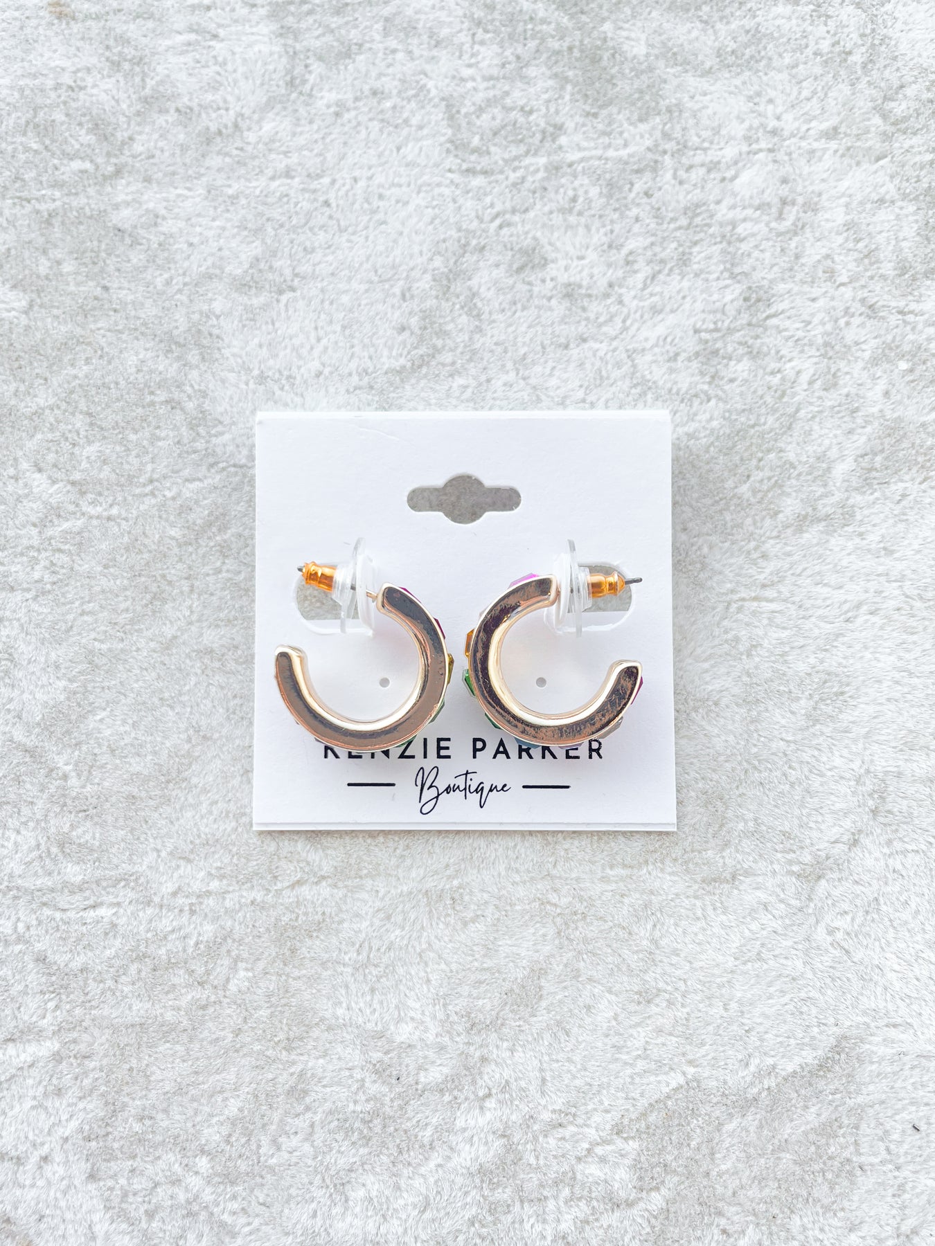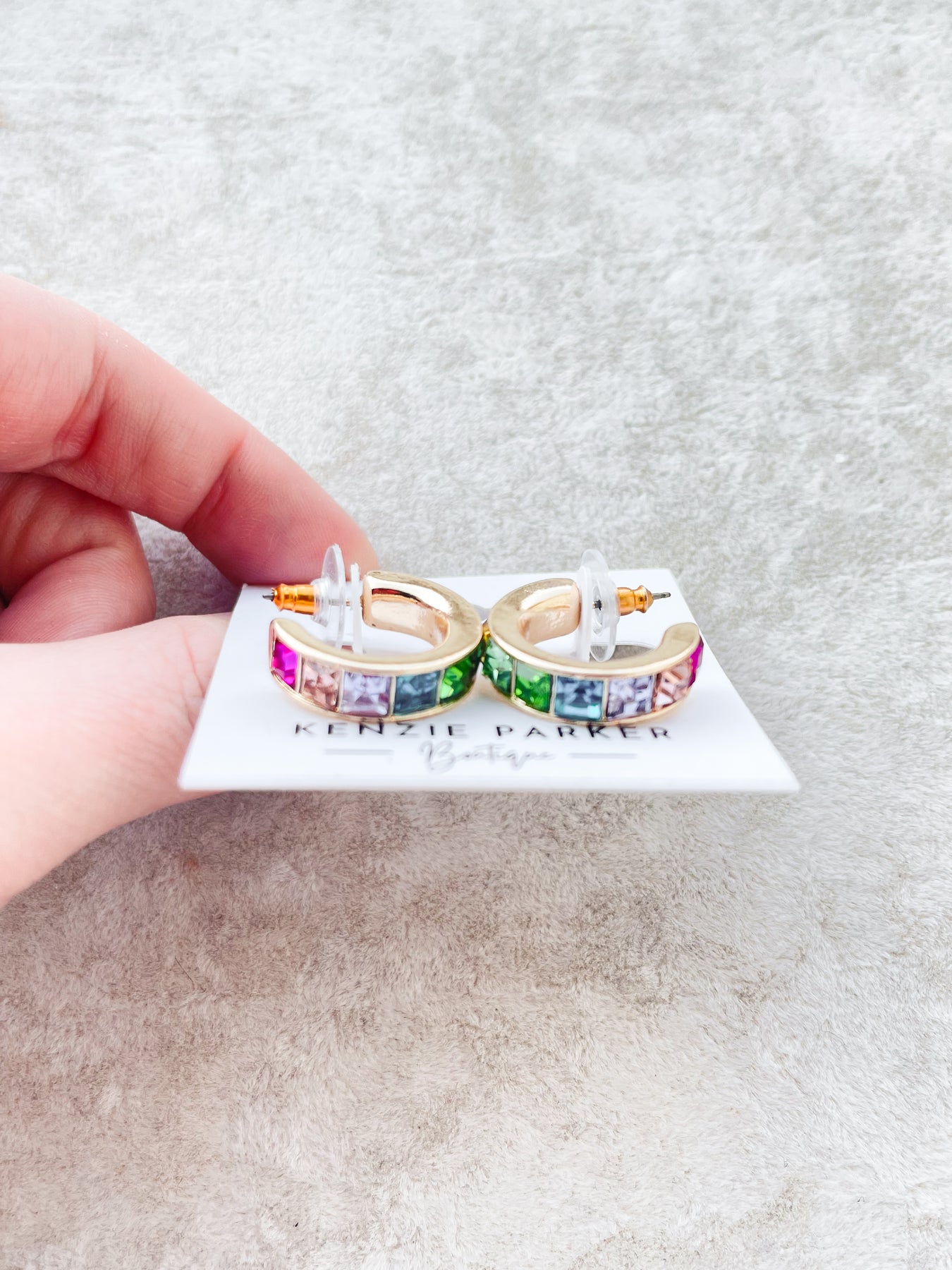 Brighten your fall wardrobe with the Harvey Multi Color Rhinestone Hoops. Featuring a gold base and stunning multicolor gemstones, these playful earrings add the perfect pop of color to dress up any outfit with stylish flair.