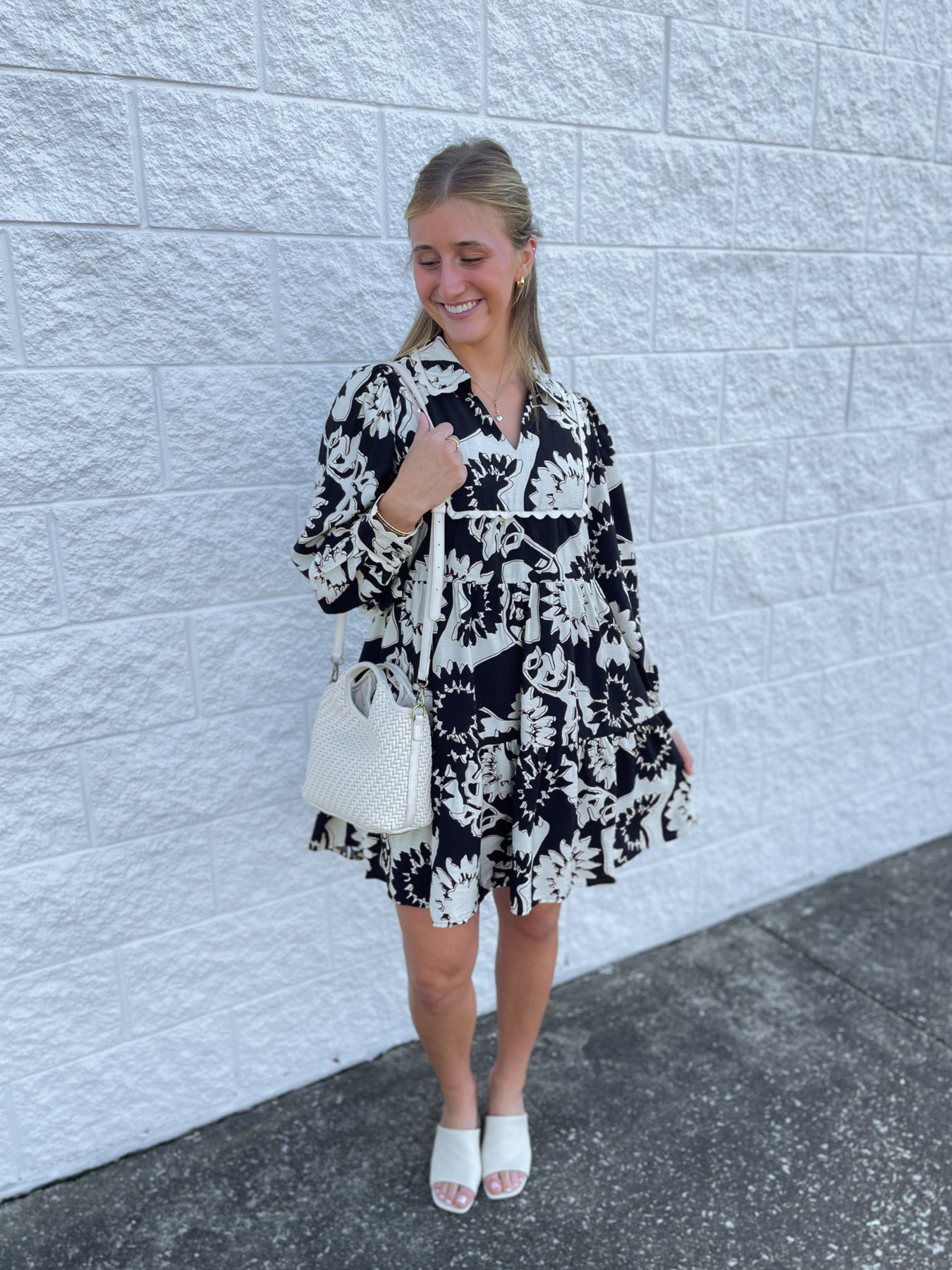 Step into fall with the Jodifl Black Shelbie Dress, featuring a stunning black and white floral print. Its playful ric rac collar adds a charming touch, while long sleeves and a flowy, soft fabric keep you cozy and comfortable. Perfect for embracing the season in style!
