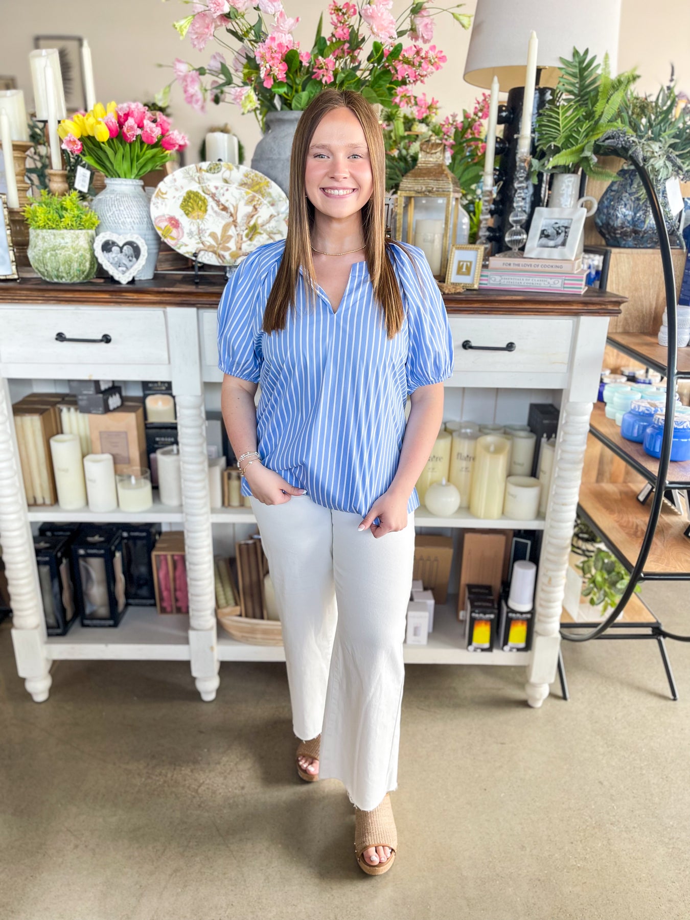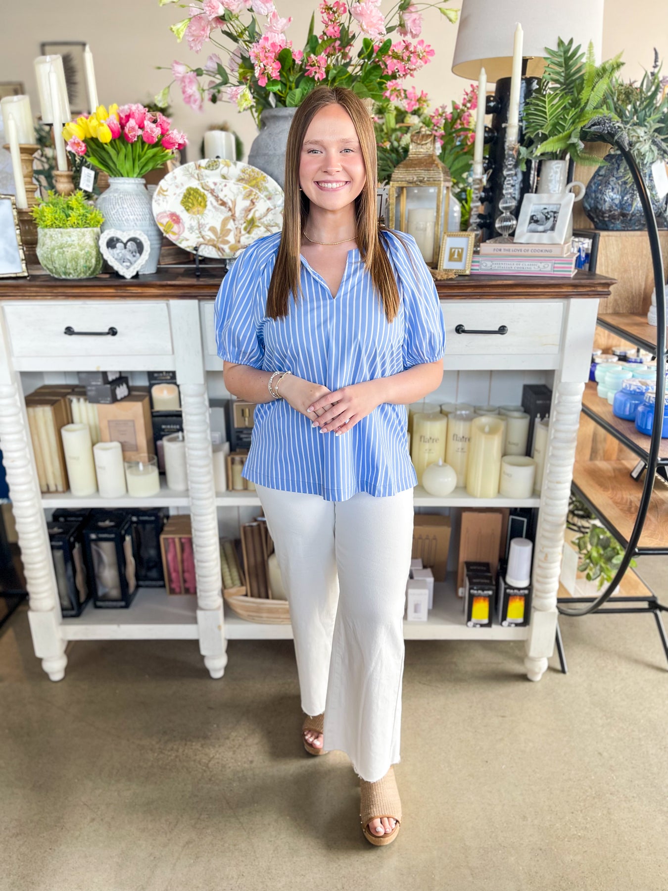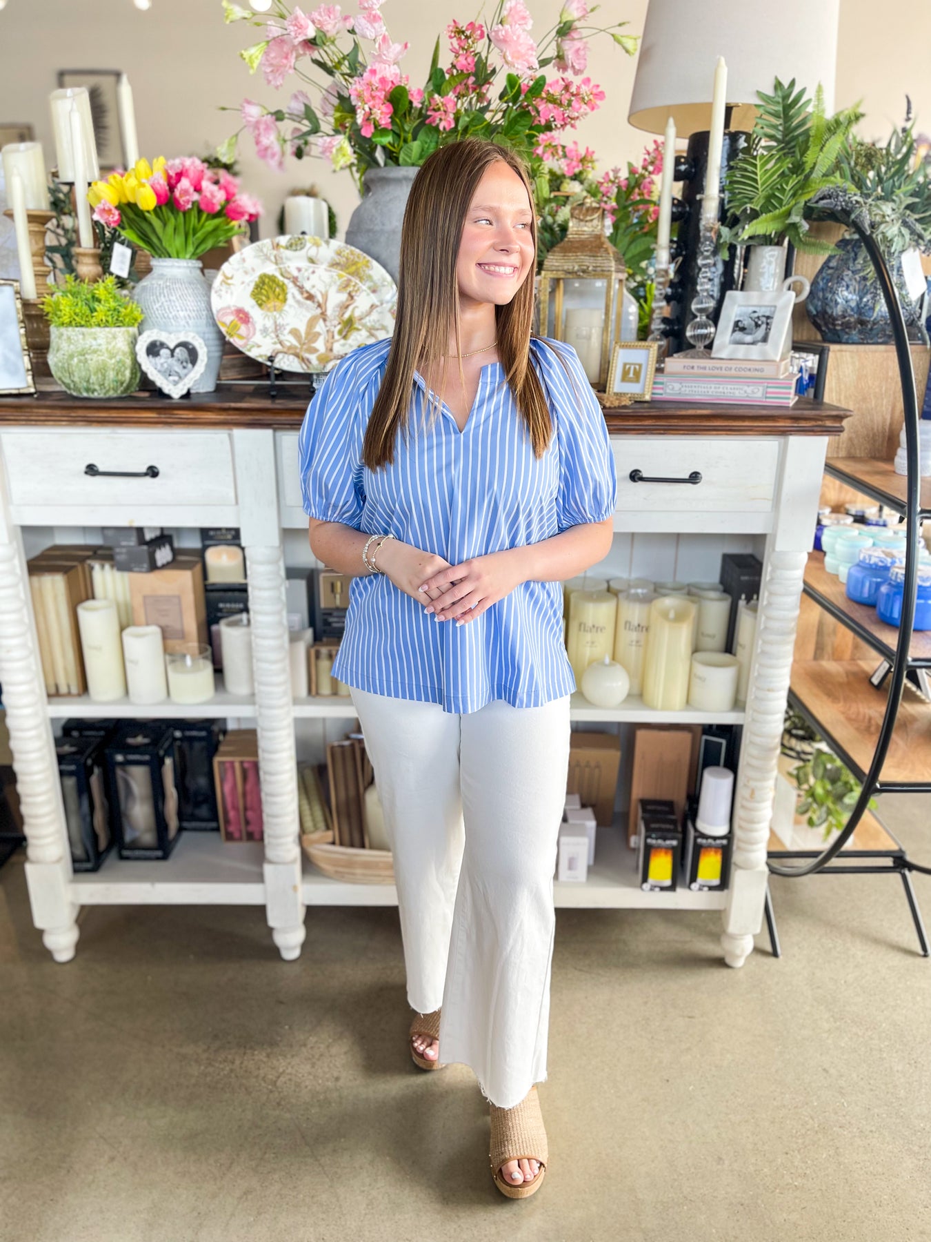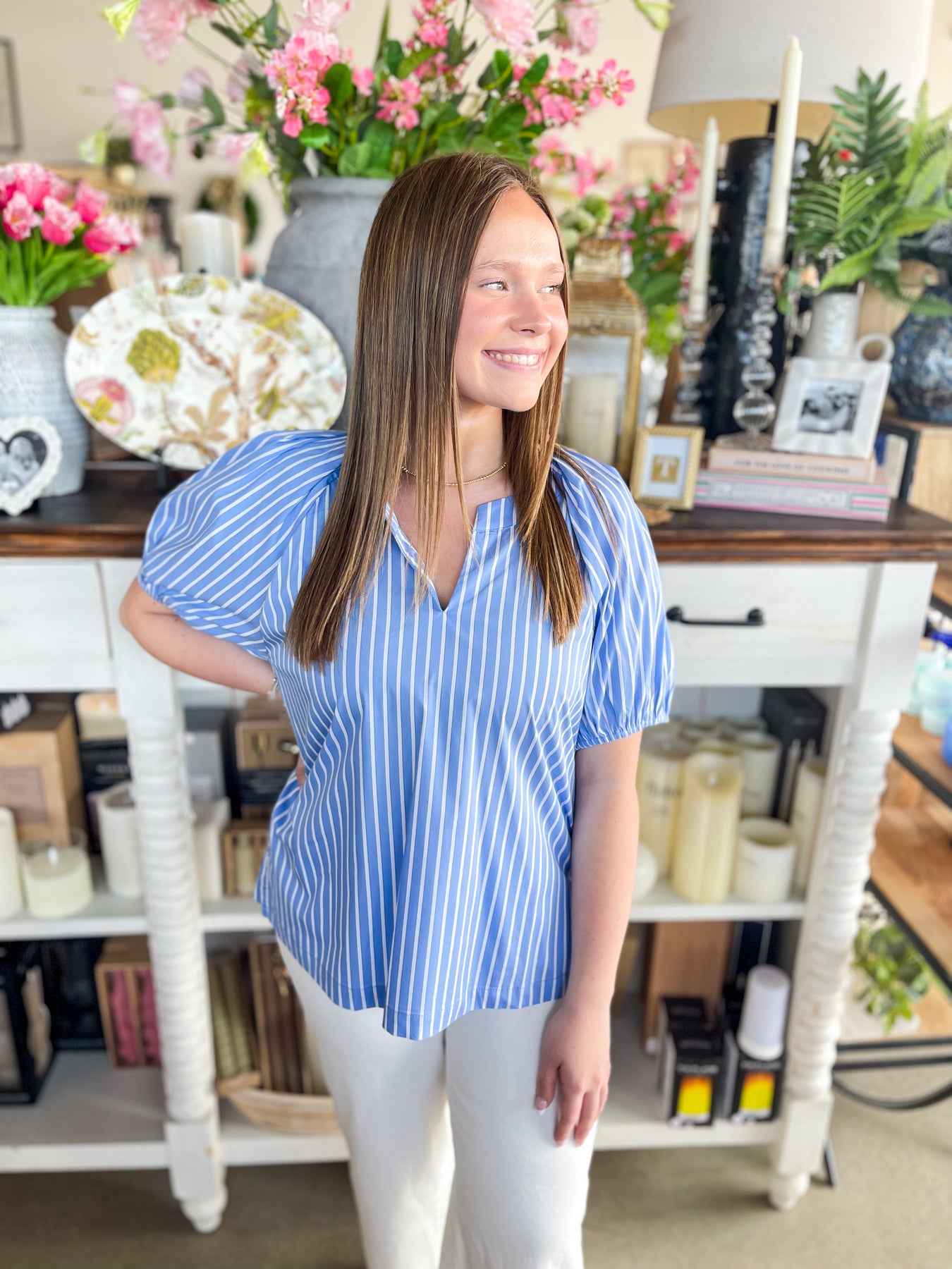 Effortlessly chic and perfect for warm weather, this striped top features a stunning V-neckline and romantic puff sleeves that capture the essence of spring and summer style. The loose, flowy silhouette in light Blue and white stripes offers a trendy yet timeless look that pairs beautifully with everything in your wardrobe. Whether you're dressing up for brunch or keeping it casual, this piece brings an instant touch of elegance to any outfit.