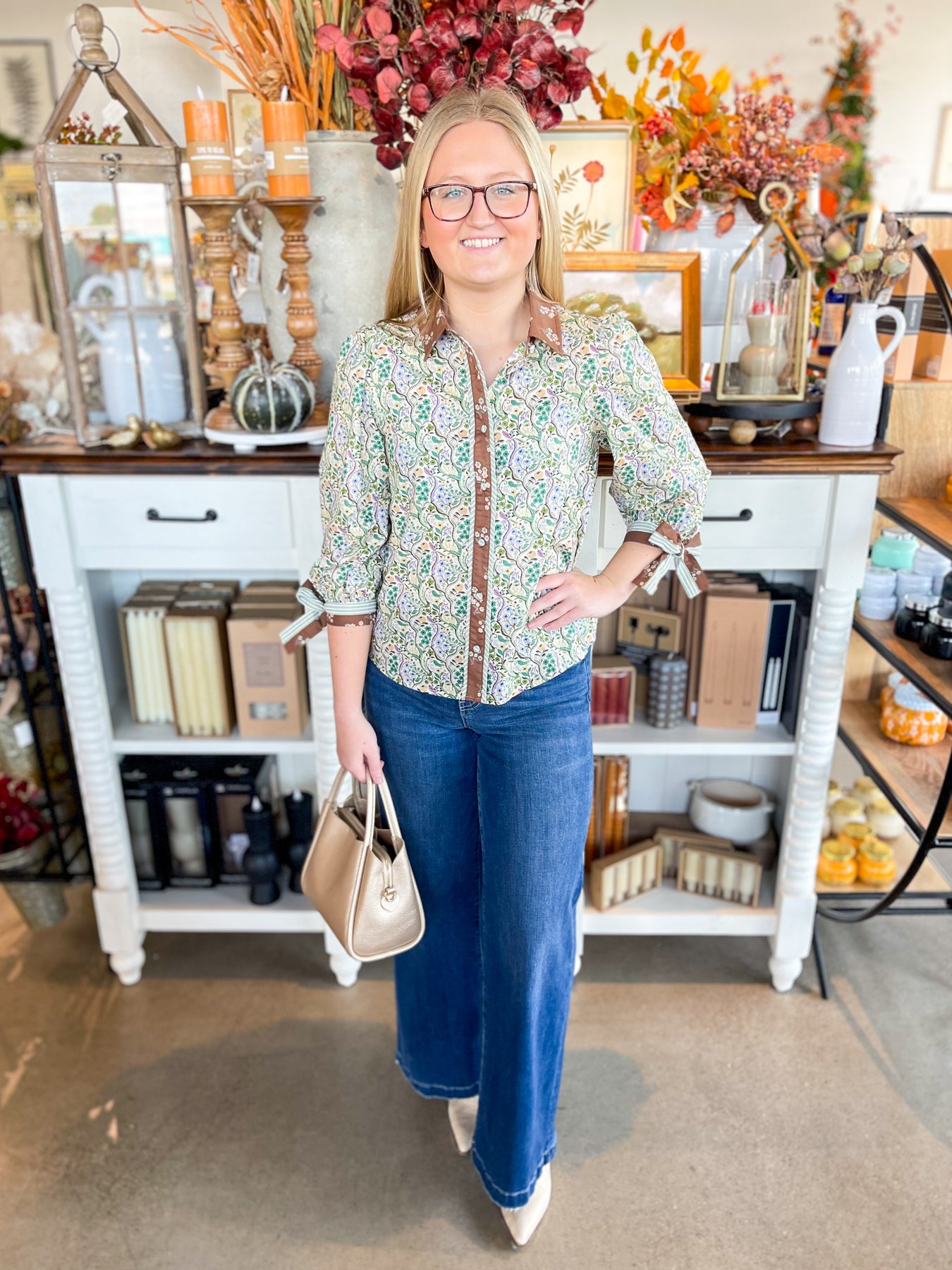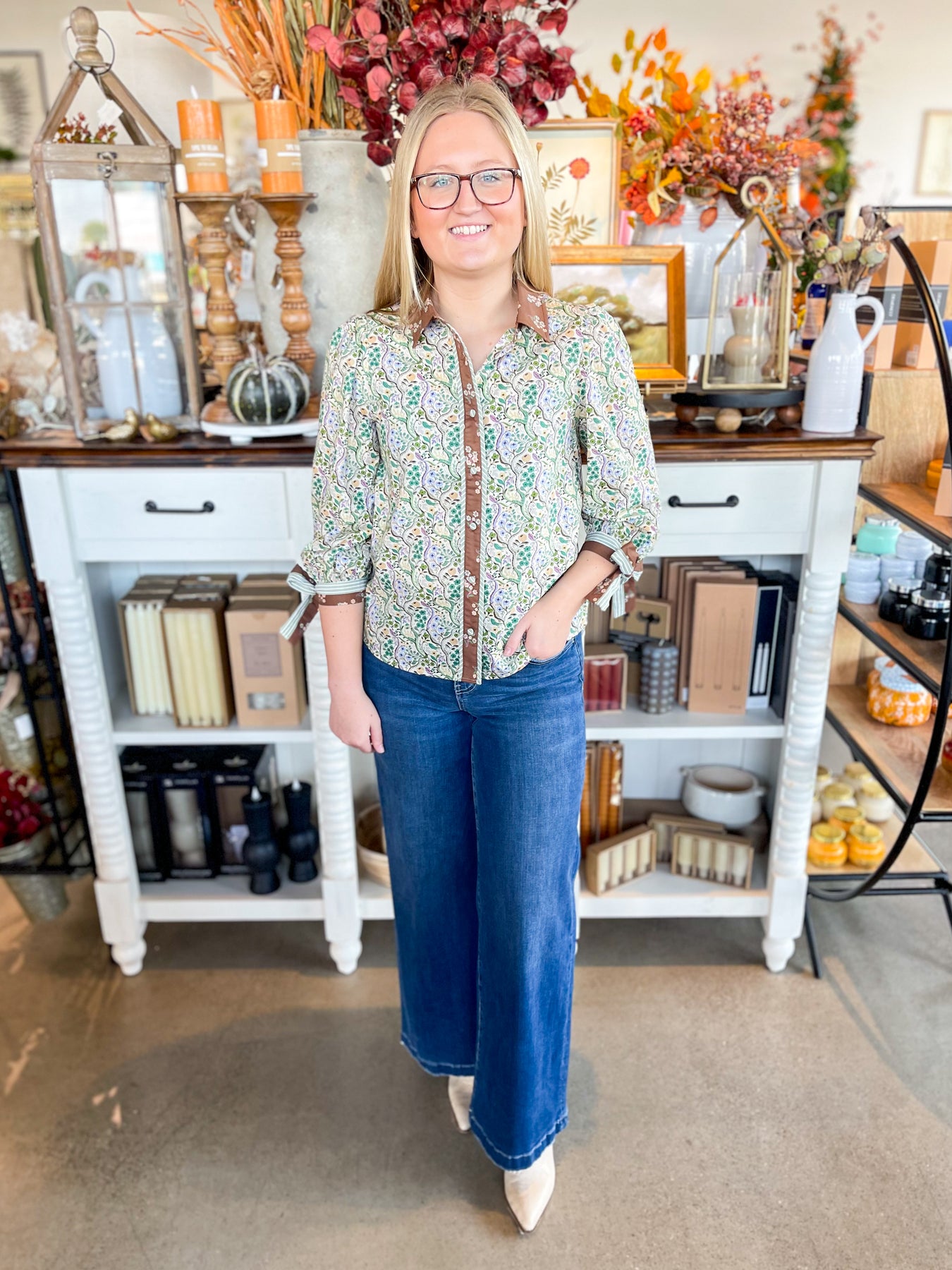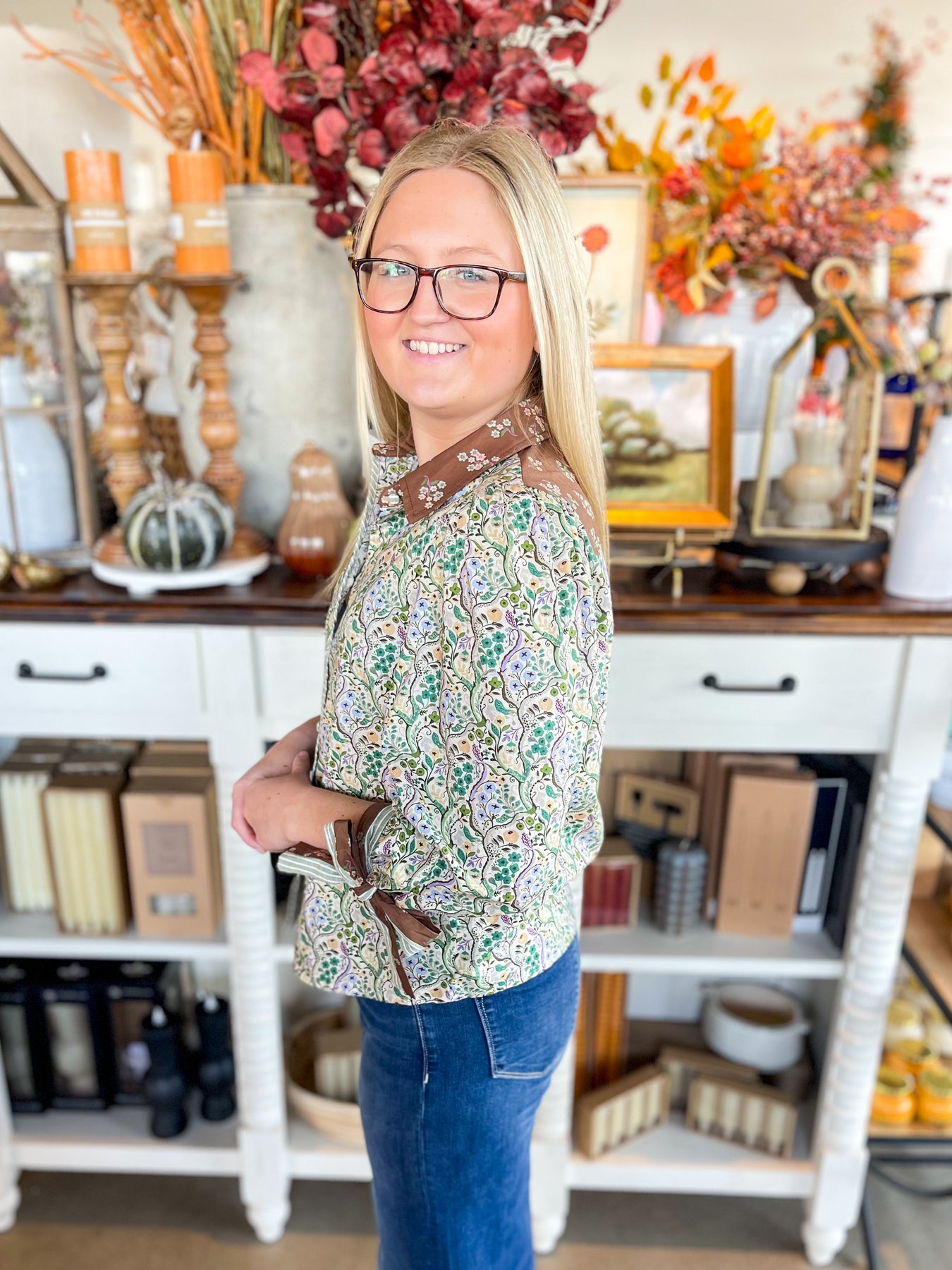 The Jodifl Green Lois Top showcases a stunning green, brown, and cream floral pattern with playful touches of purple and blue—perfect for fall. Trendy bow details on the sleeves and a charming collar add style, while buttons down the front complete this fashionable look with ease and flair.
