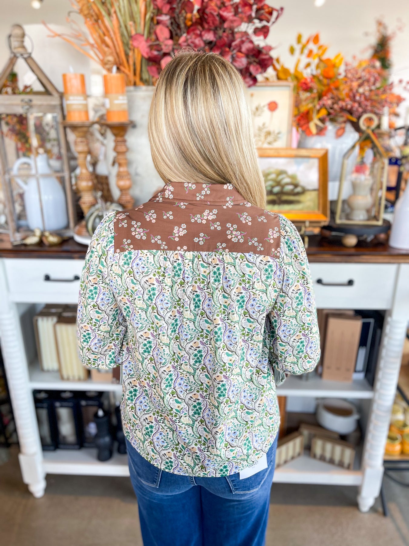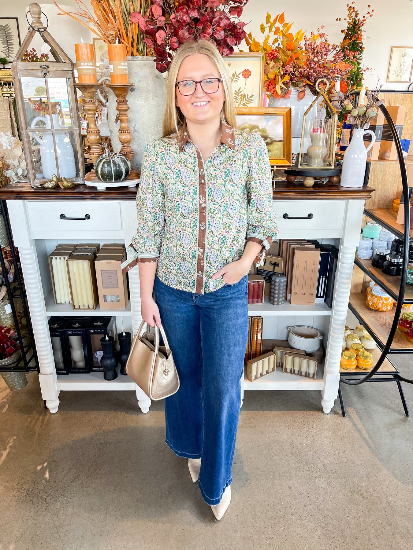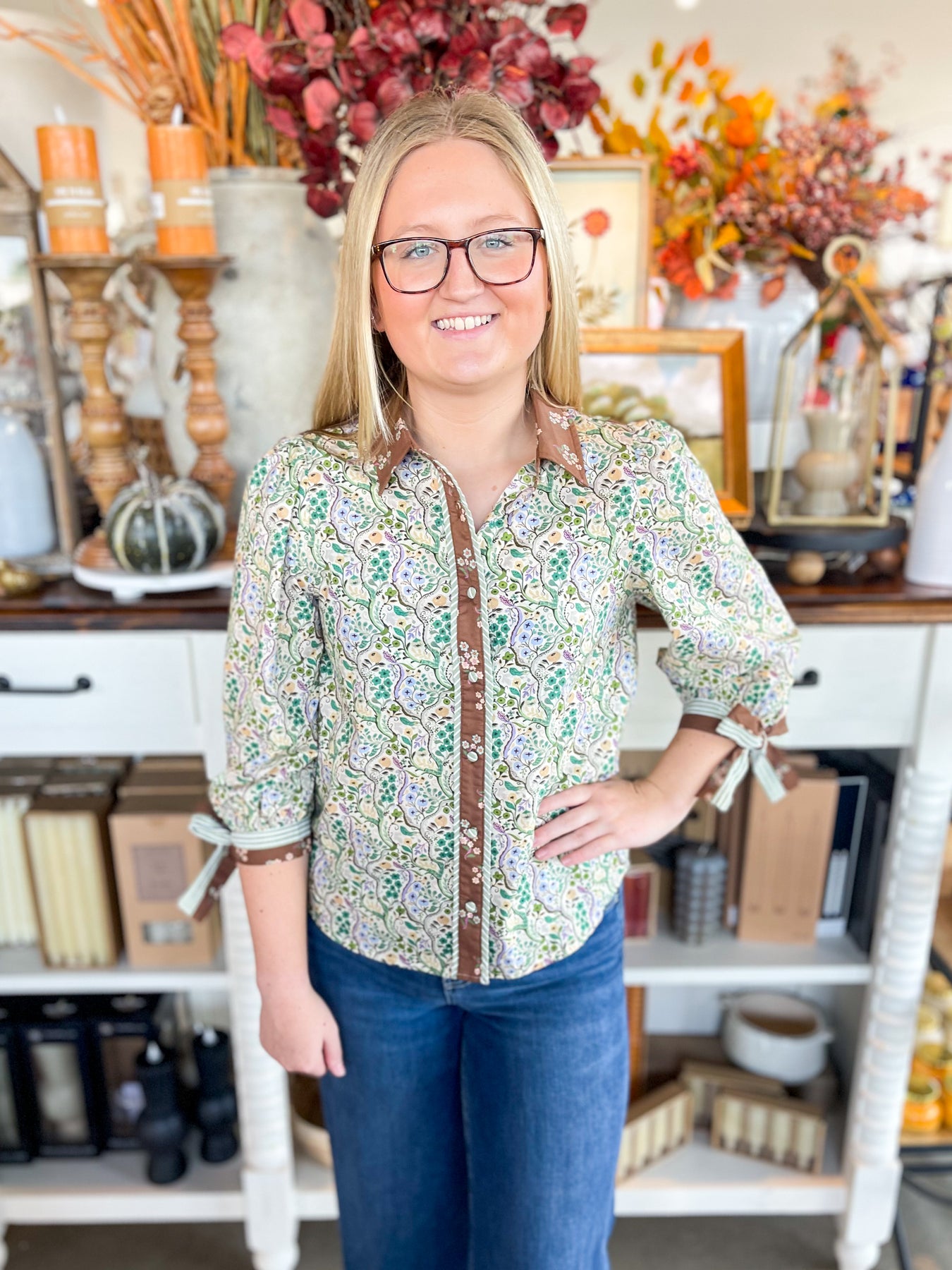 The Jodifl Green Lois Top showcases a stunning green, brown, and cream floral pattern with playful touches of purple and blue—perfect for fall. Trendy bow details on the sleeves and a charming collar add style, while buttons down the front complete this fashionable look with ease and flair.