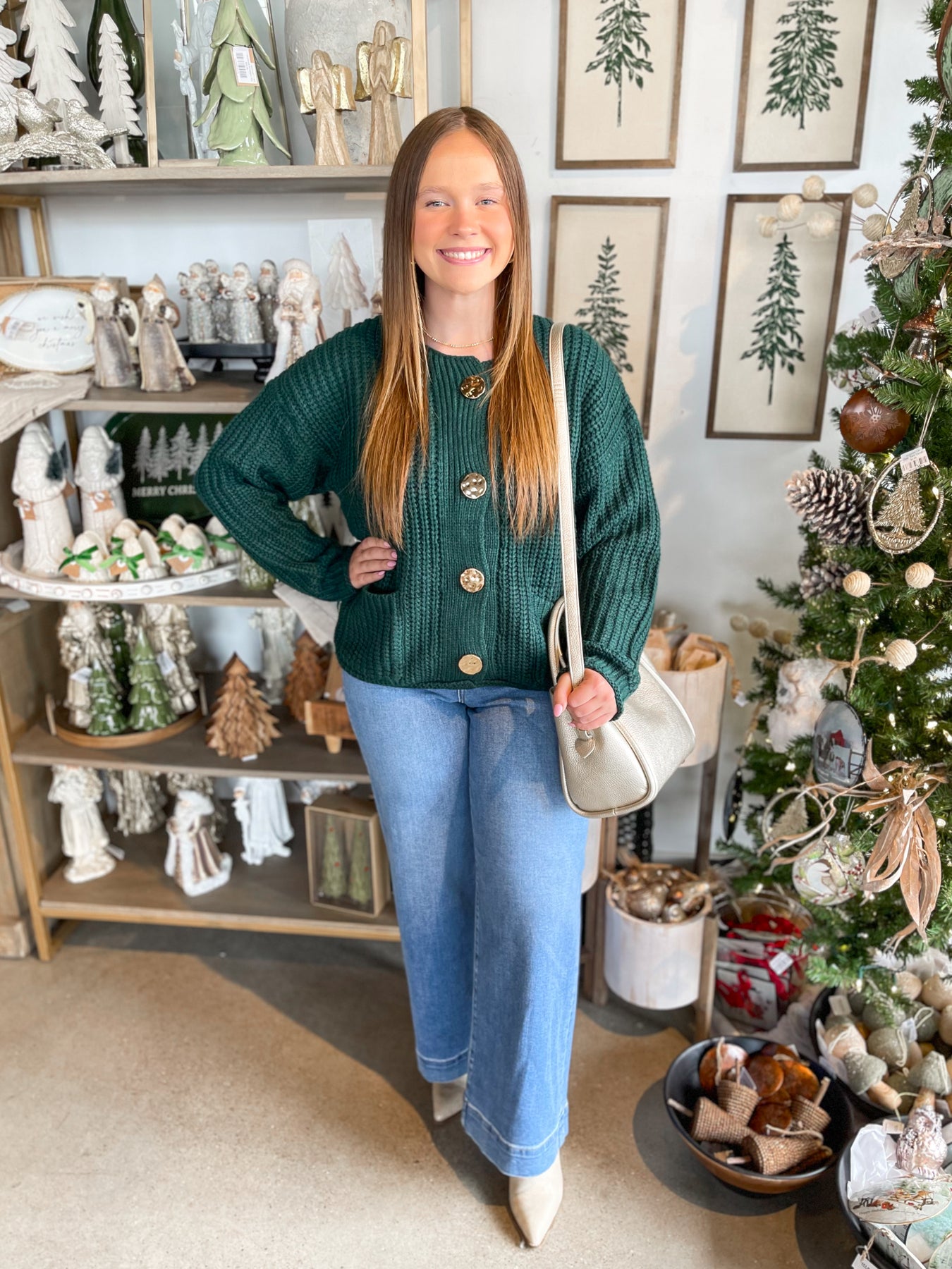 Wrap yourself in cozy elegance with the Jodifl Hunter Green Cardigan—a dark green woven stunner that's about to become your go-to layering piece. Chunky knit texture keeps things tactile and warm, while gleaming gold buttons add just the right amount of polish and personality. The scoop neckline flatters effortlessly, long sleeves keep you toasty, and practical front pockets are the cherry on top. With its slightly cropped silhouette, this cardigan transitions seamlessly from fall into winter, bringing that trendy, put-together vibe to every outfit.