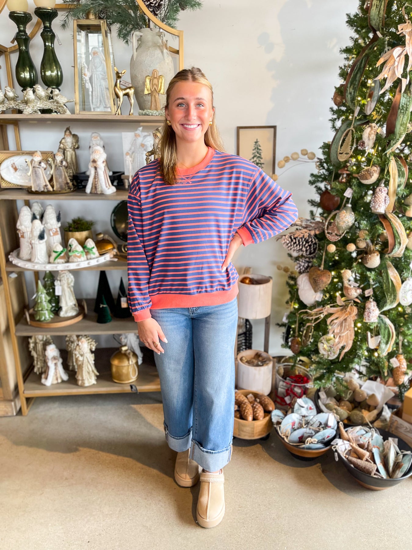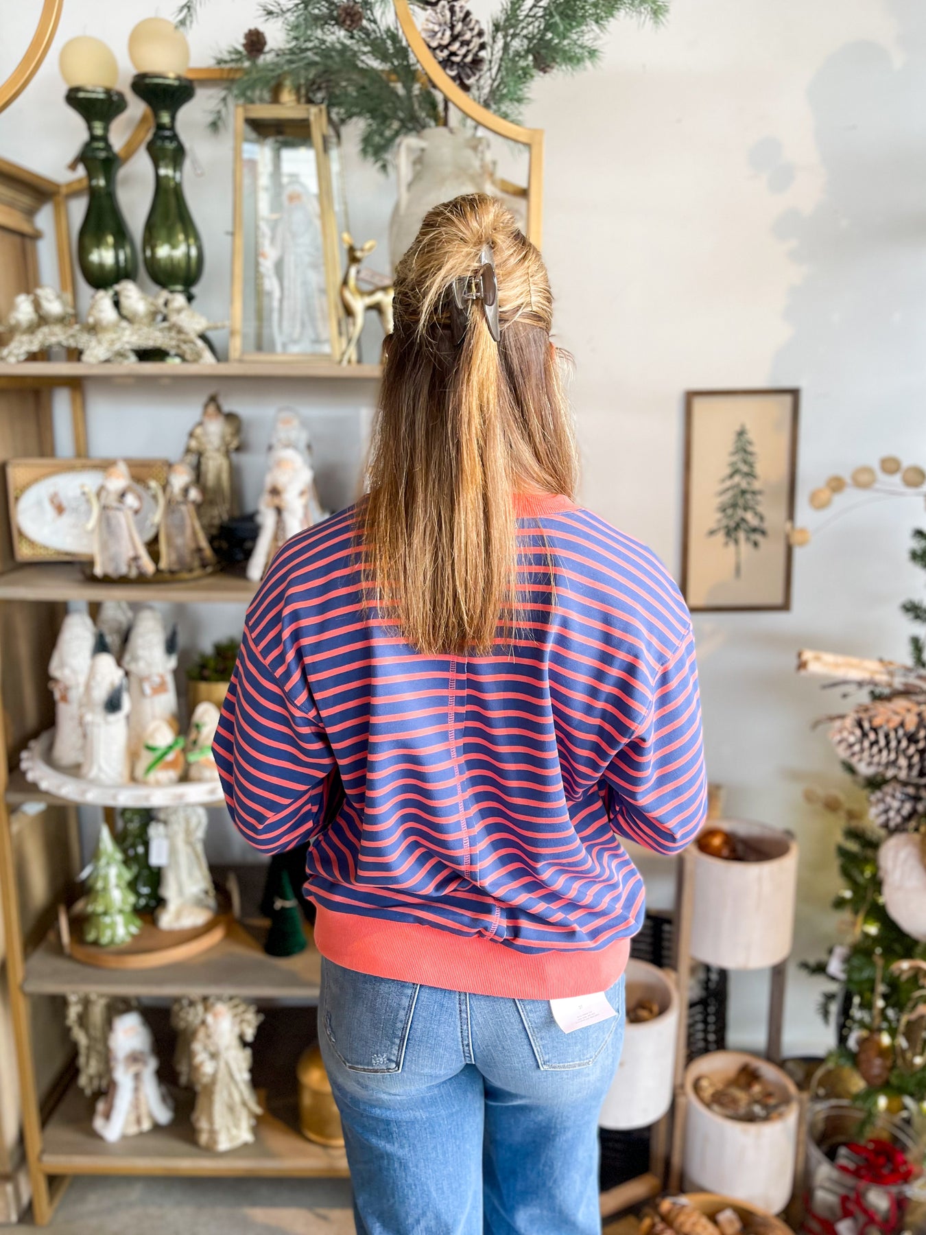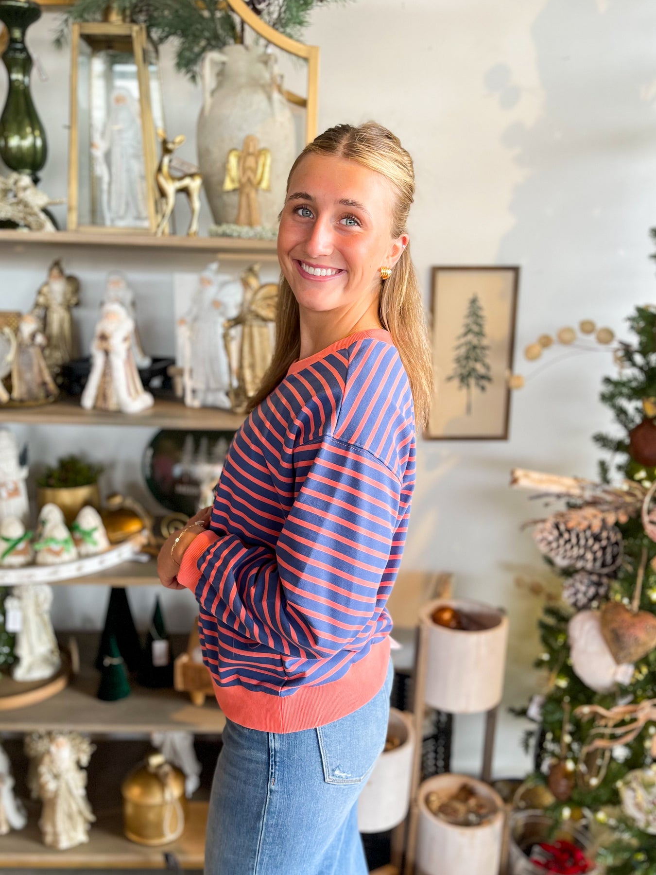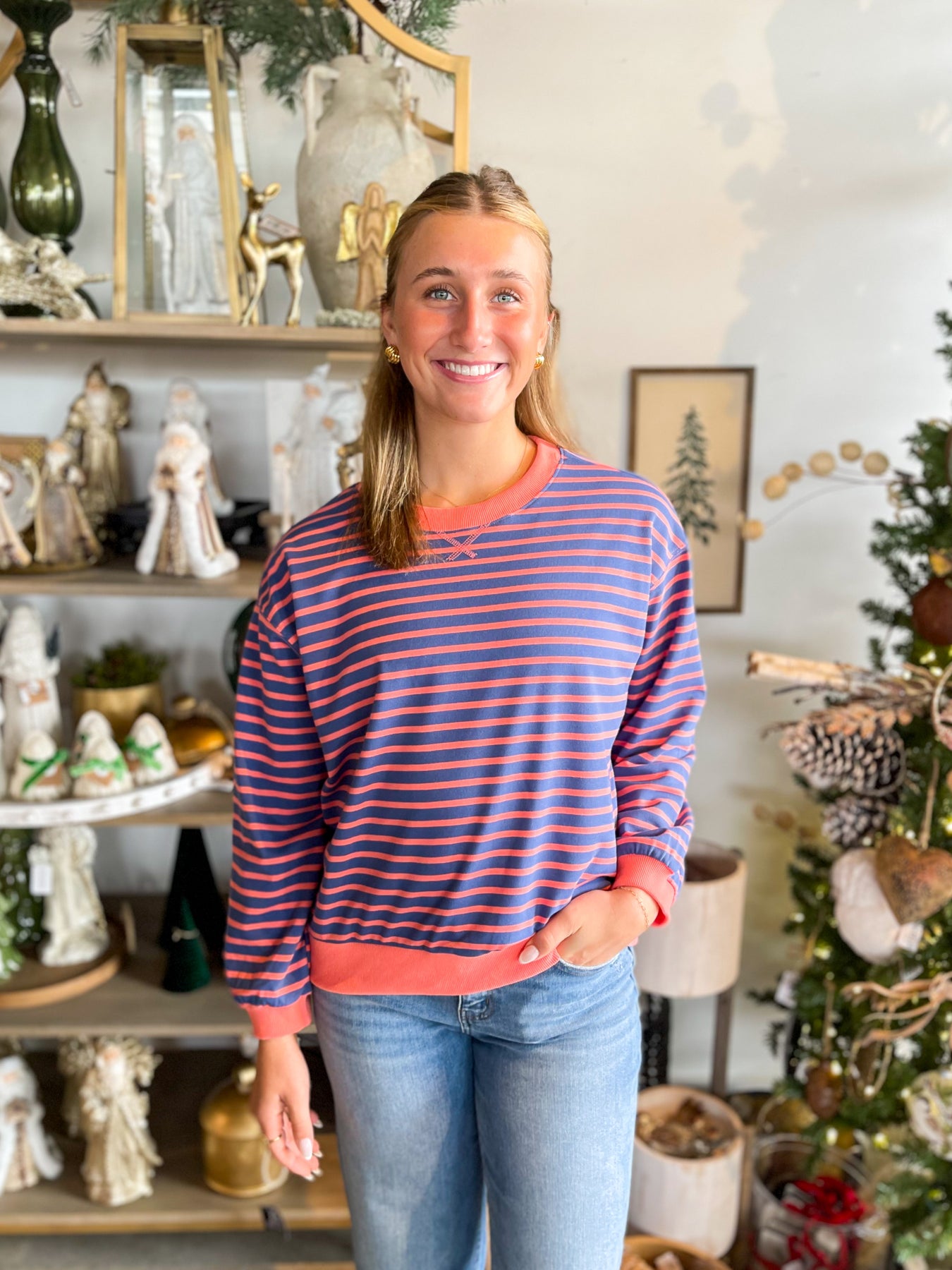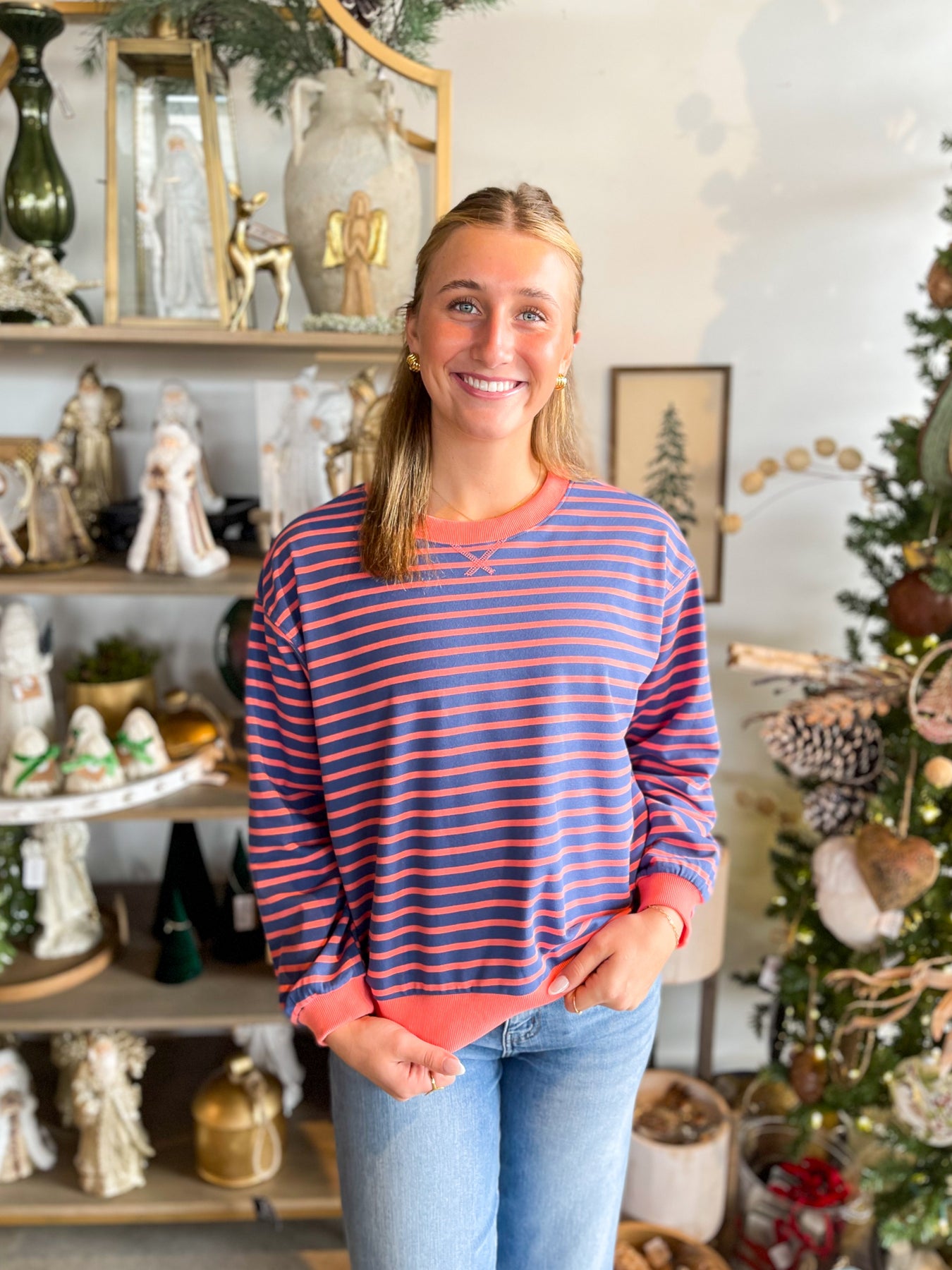 Turn heads in this gorgeous blue and coral striped top that's equal parts casual and chic! The lightweight fabric keeps you comfortable while the loose, relaxed fit lets you move freely. With its crew-neck style and long sleeves, it's the perfect layering piece for winter days when you want to look put-together without trying too hard. Pair it with your favorite bottoms for an effortlessly stylish vibe that works from morning coffee runs to weekend hangouts. This trendy striped beauty is a wardrobe must-have!