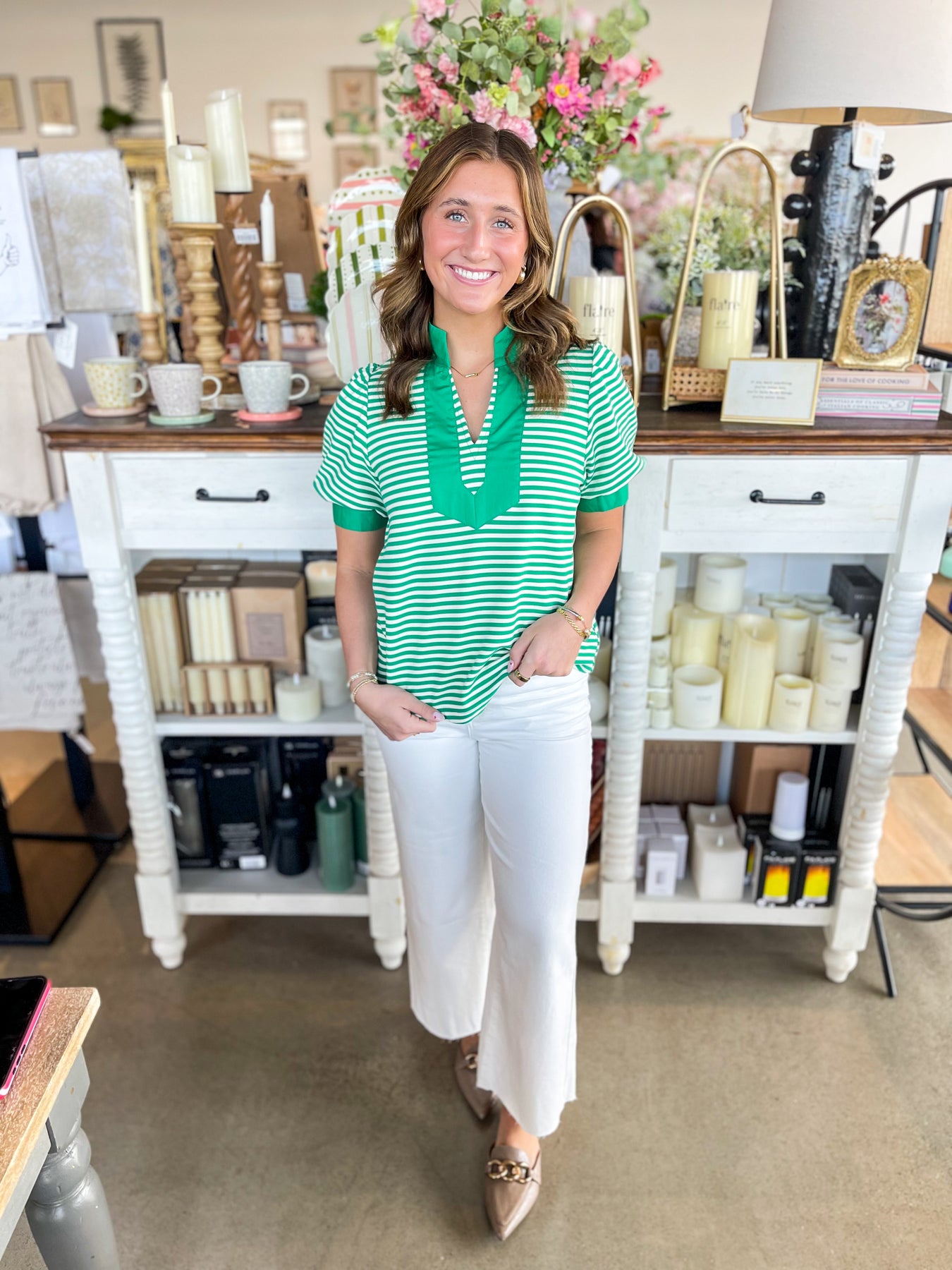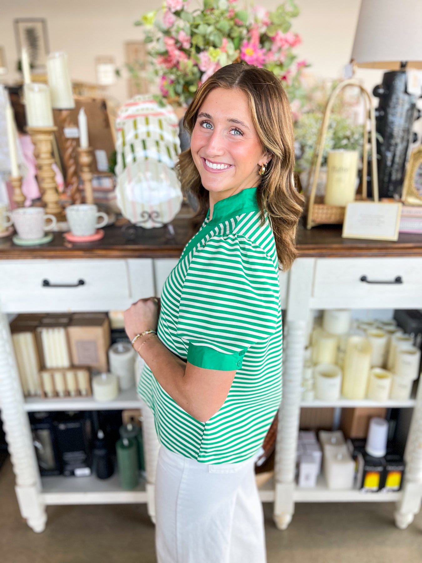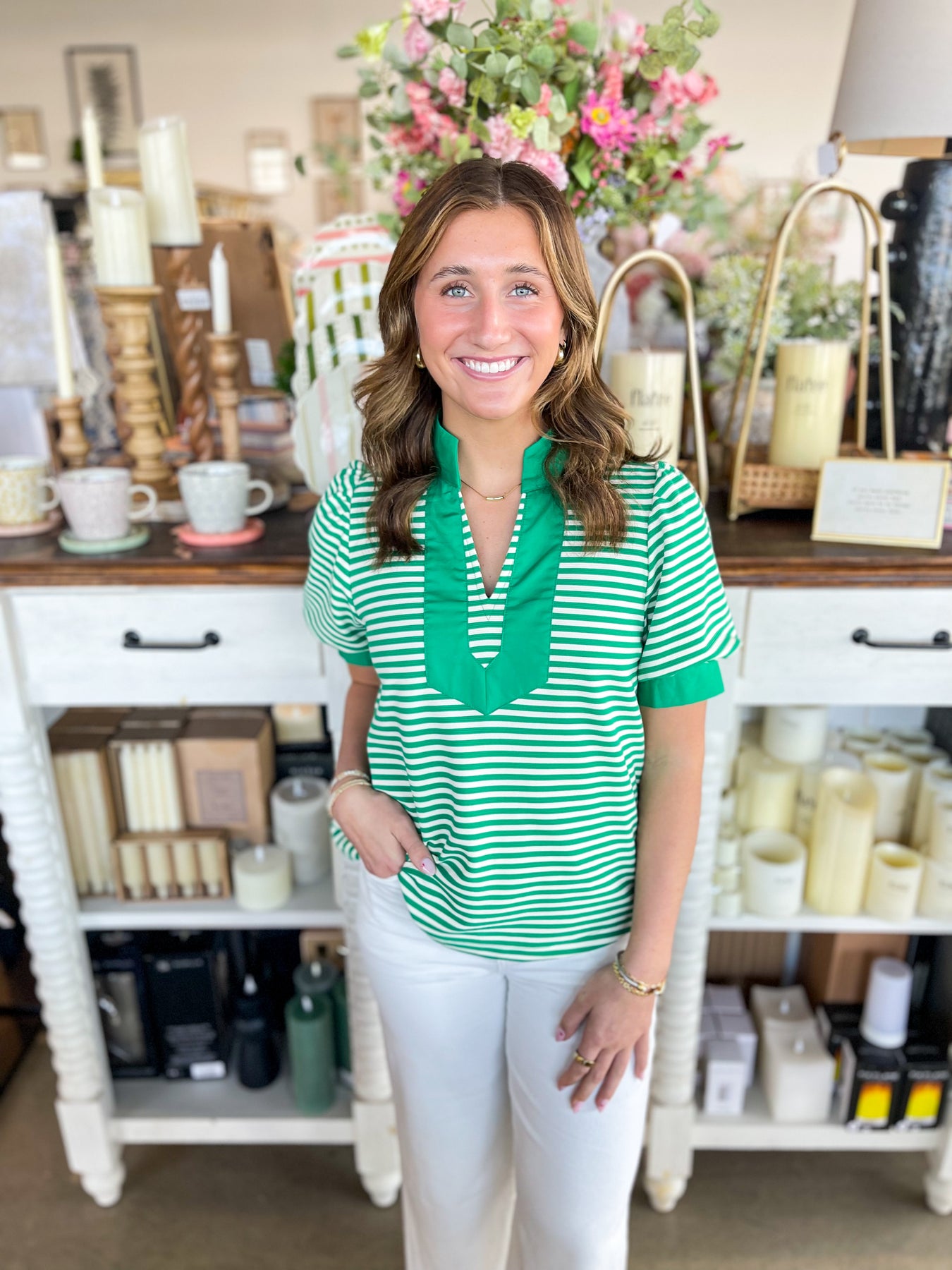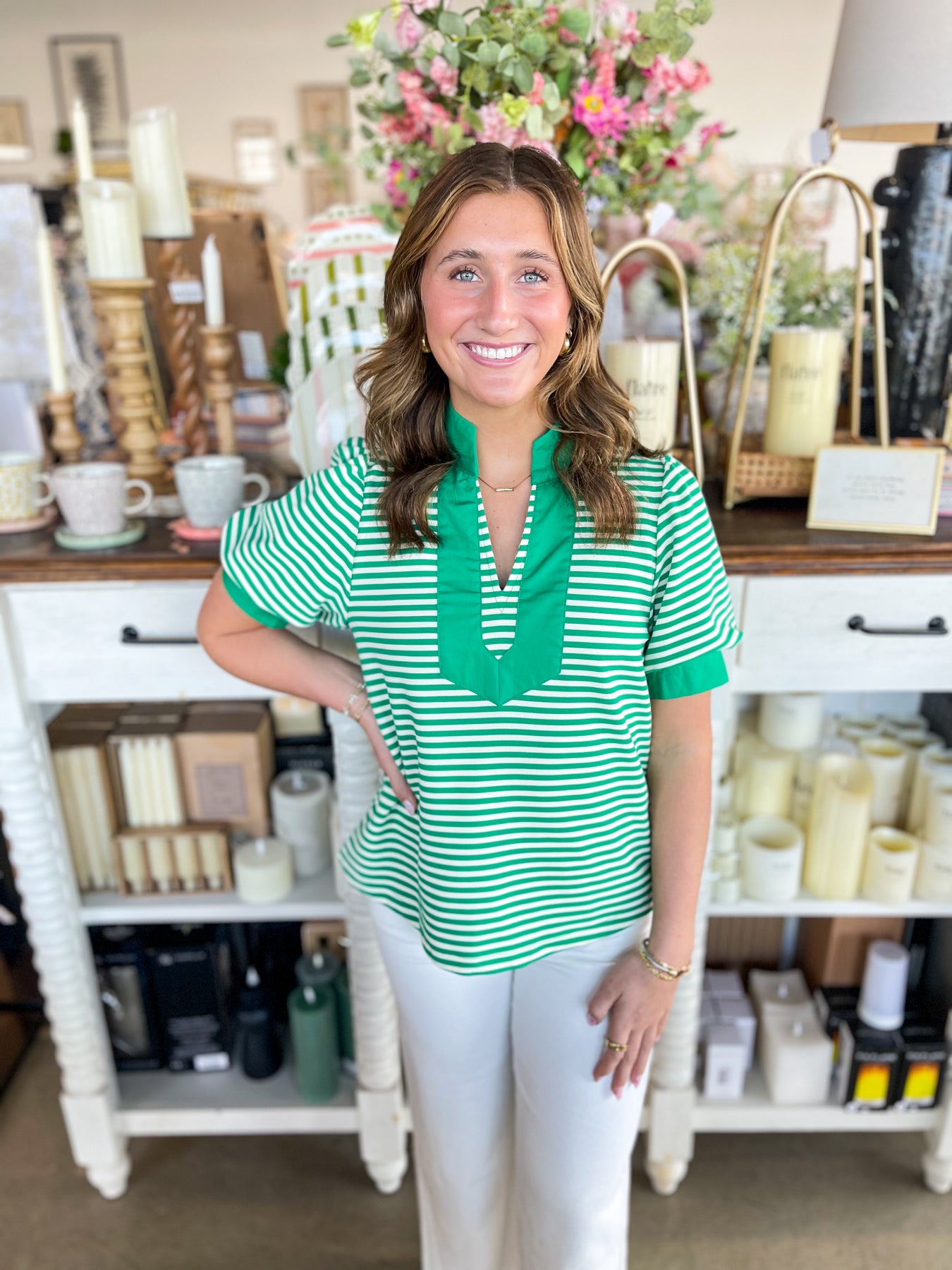 Stripes never go out of style, and this gorgeous green and white striped top proves it! The crisp, classic pattern pairs beautifully with a flattering v-neckline and playful puff sleeves that add just the right amount of personality. Whether you're jet-setting on vacation or enjoying everyday adventures, this stunning piece brings effortless charm to any outfit. Fresh, fun, and endlessly versatile—your wardrobe just got an instant upgrade!