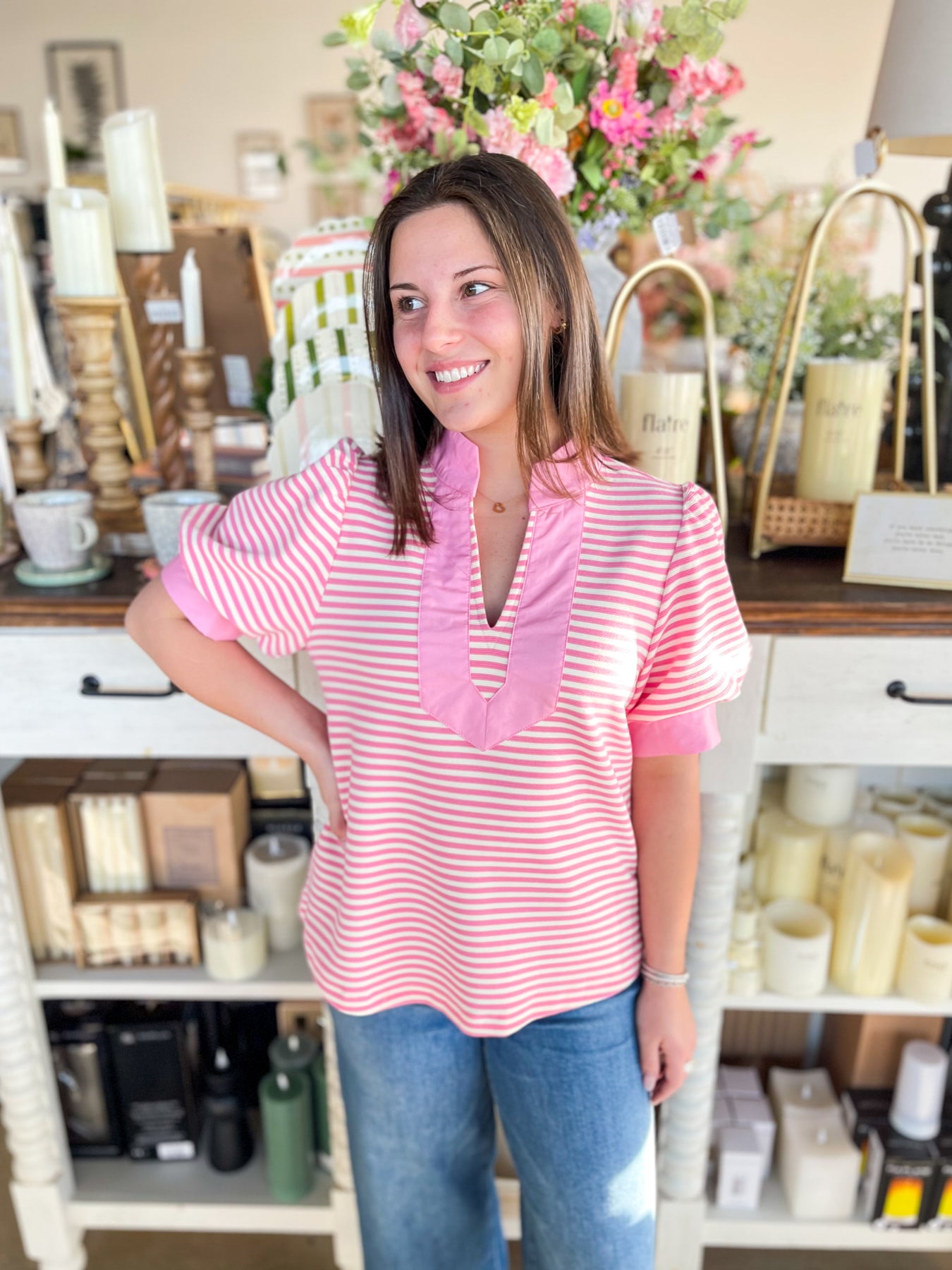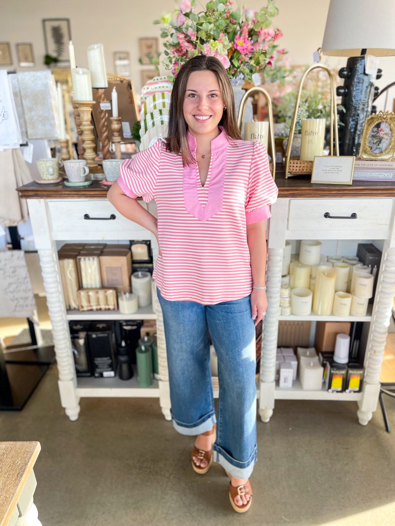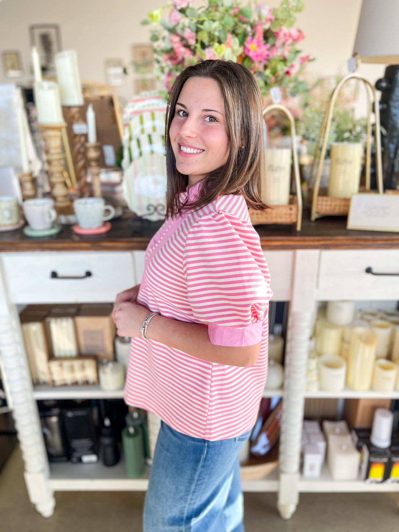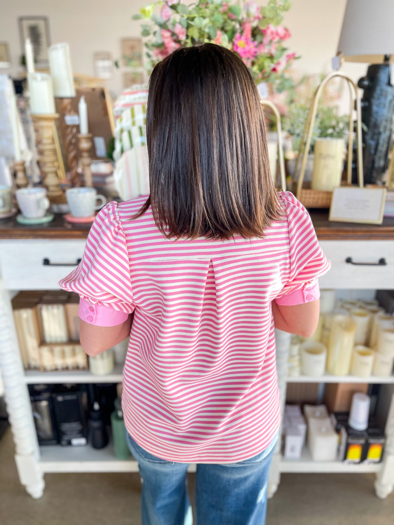 Stripes never go out of style, and this gorgeous Pink and white striped top proves it! The crisp, classic pattern pairs beautifully with a flattering v-neckline and playful puff sleeves that add just the right amount of personality. Whether you're jet-setting on vacation or enjoying everyday adventures, this stunning piece brings effortless charm to any outfit. Fresh, fun, and endlessly versatile—your wardrobe just got an instant upgrade!