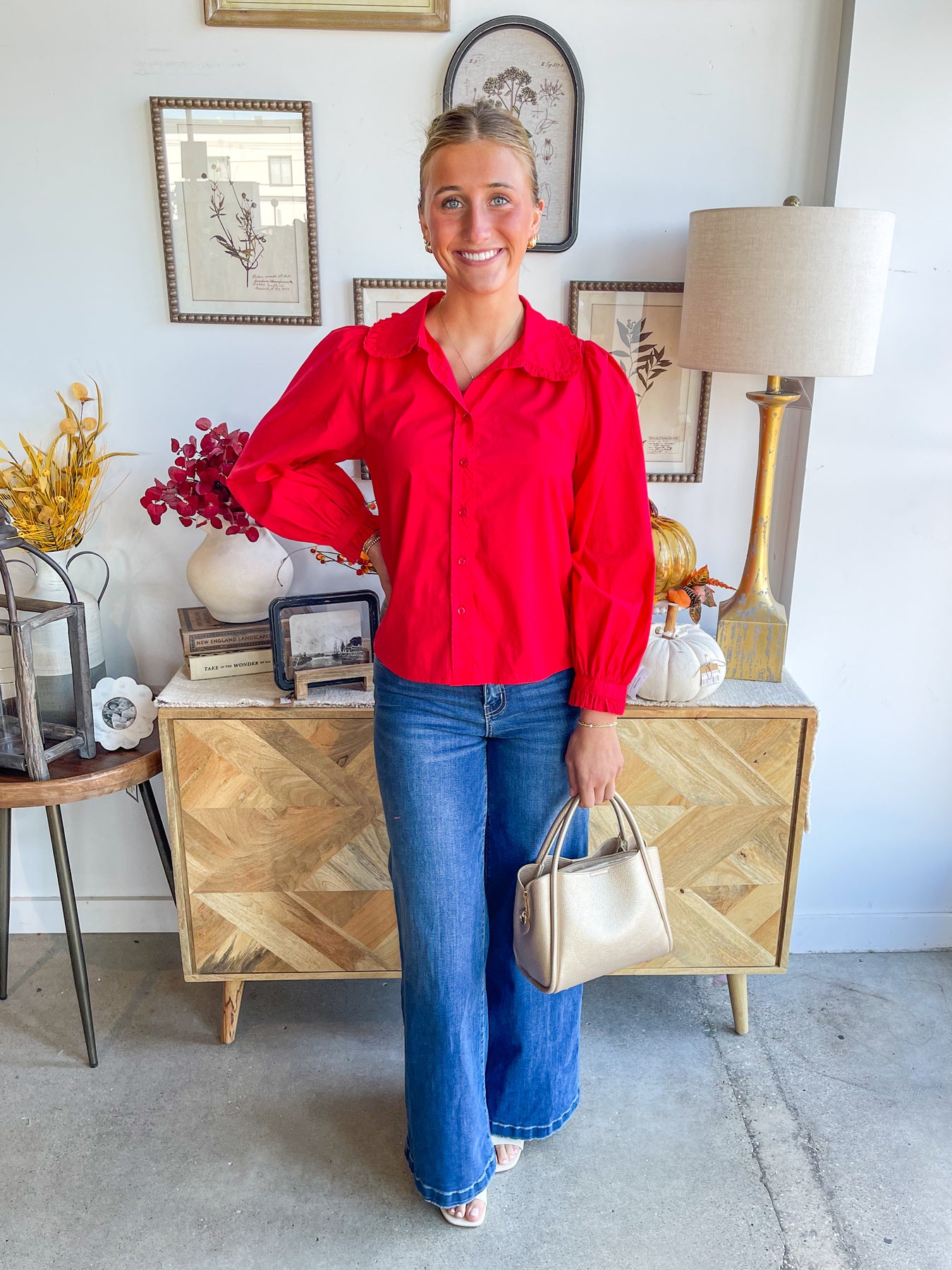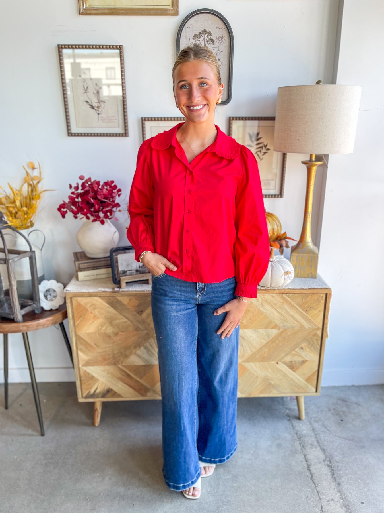 Add a pop of vibrant fall cheer with the Jodifl Red Billie Top. This stunning red top features playful collar ruffles, buttons all the way down, and ruffle hems on the long sleeves. Slightly fitted and lightweight, it’s perfect for layering or wearing on its own for a fun, flirty look all season long.