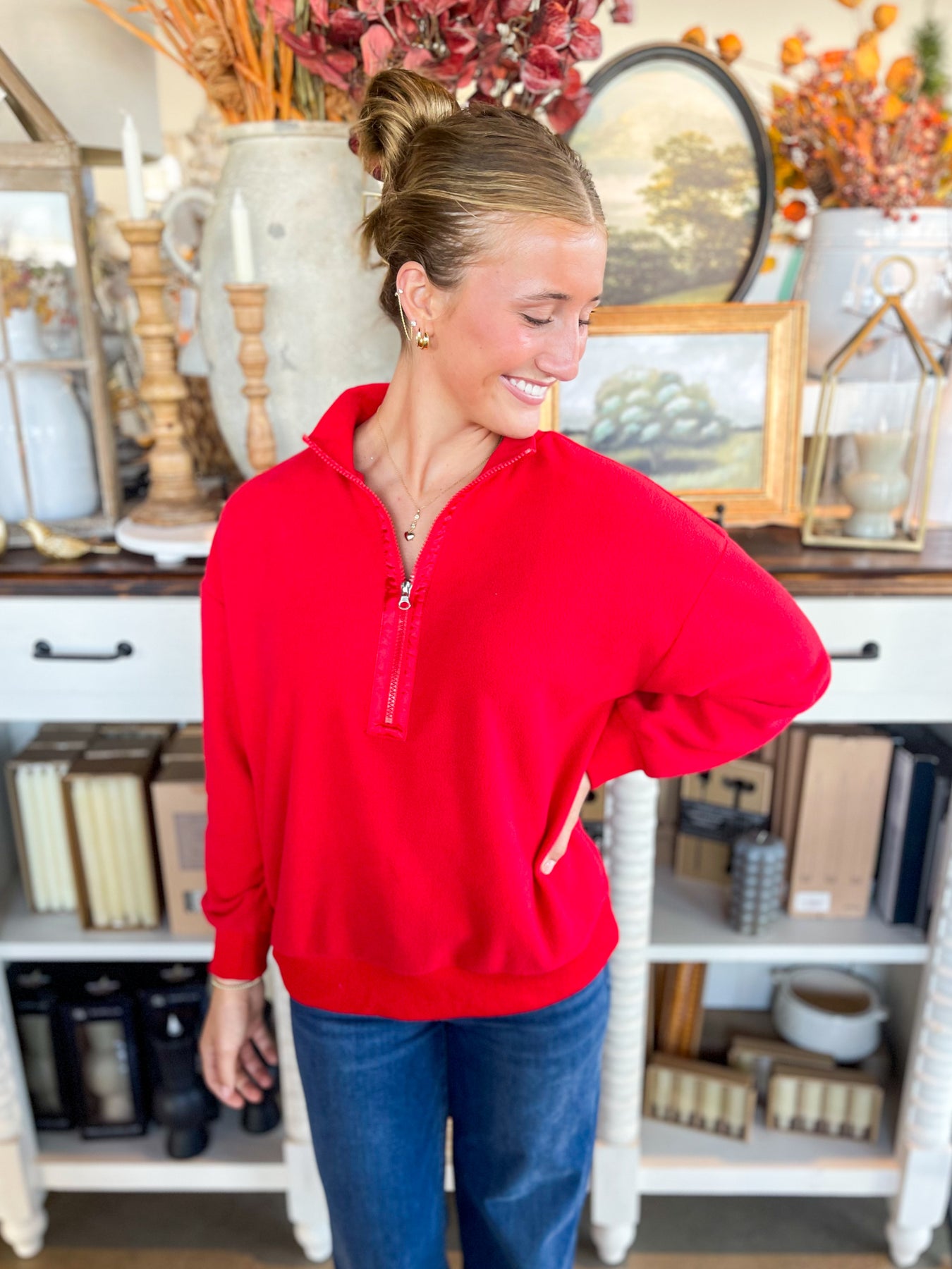 The Jodifl Red Half Zip Brook Top is a playful fall essential in a stunning bright red hue. Super soft and lightweight, it’s slightly oversized and cropped for a comfortable, cute fit. Featuring a collar detail and quarter zip, this top is perfect for easy layering with a fun twist.