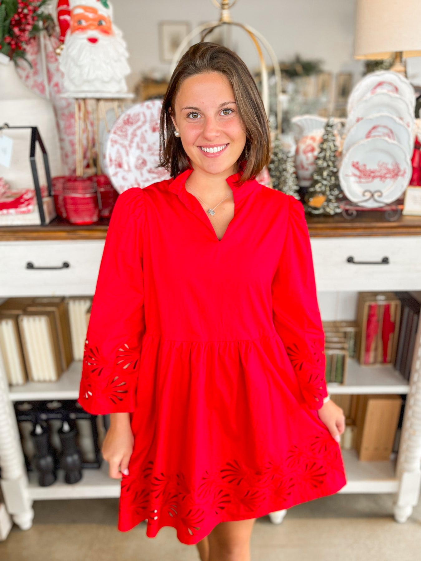 Turn heads in the Jodifl Red Parrish Dress—a stunning bright red number that's pure fall magic. The flattering V-neckline draws the eye, while a charming ruffle collar adds playful texture and movement. Delicate eyelet details on the sleeves and hem bring romantic flair and visual interest to every angle. The flowy silhouette keeps things breezy and comfortable, making this dress perfect for everything from casual outings to special occasions. Bold, beautiful, and undeniably fun—this is the dress that makes you feel amazing.