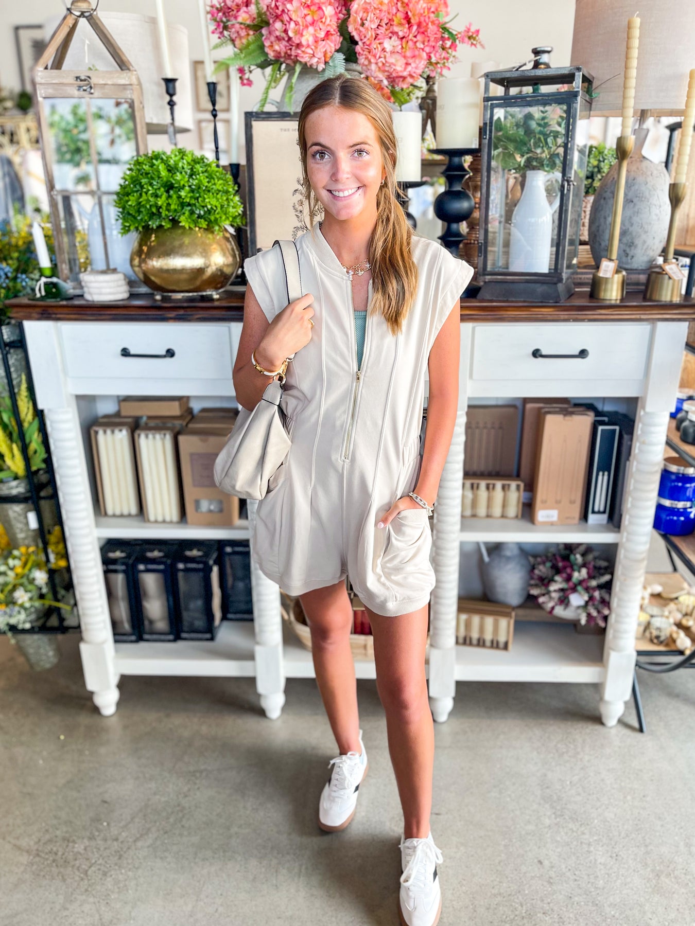 Step out in style and comfort with the Jodifl Taupe Isabelle Jumpsuit. Made with super soft and comfortable fabric, this jumpsuit features a zipper halfway down the front, smocking in the side and back for a perfect fit, and cap sleeves. It also has pockets, making it perfect for summer and running errands. Casual, yet super cute!
