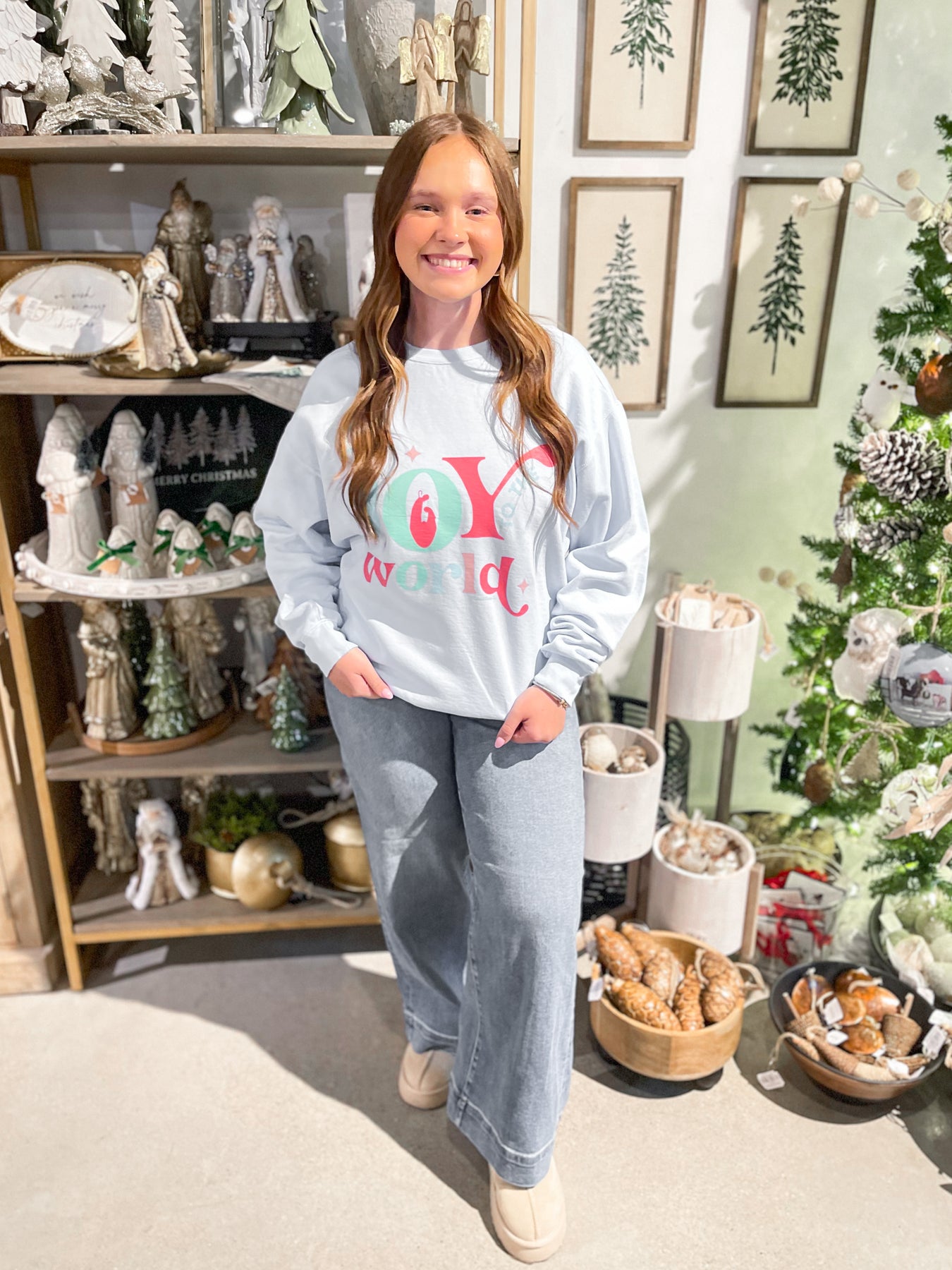 Spread holiday cheer in this super soft light blue sweatshirt from Comfort Colors! Festive "Joy To The World" lettering in mint green, light blue, and hot pink brings playful personality to your seasonal wardrobe. Perfect for cozy nights by the fire, holiday gatherings, or casual winter days, this sweatshirt combines comfort with cheerful style. The soft fabric feels amazing against your skin, making it the kind of piece you'll want to live in all season long. Whether you're decorating, caroling, or simply celebrating the magic of the holidays, this sweatshirt is your new go-to for comfort and festive fun.