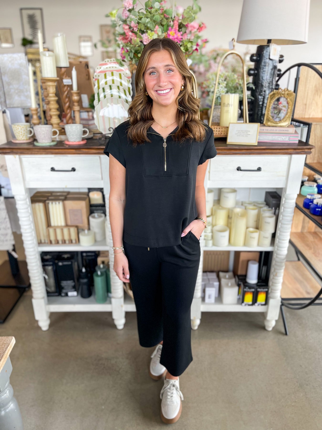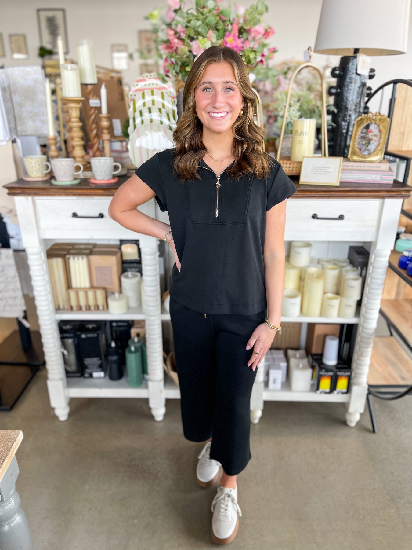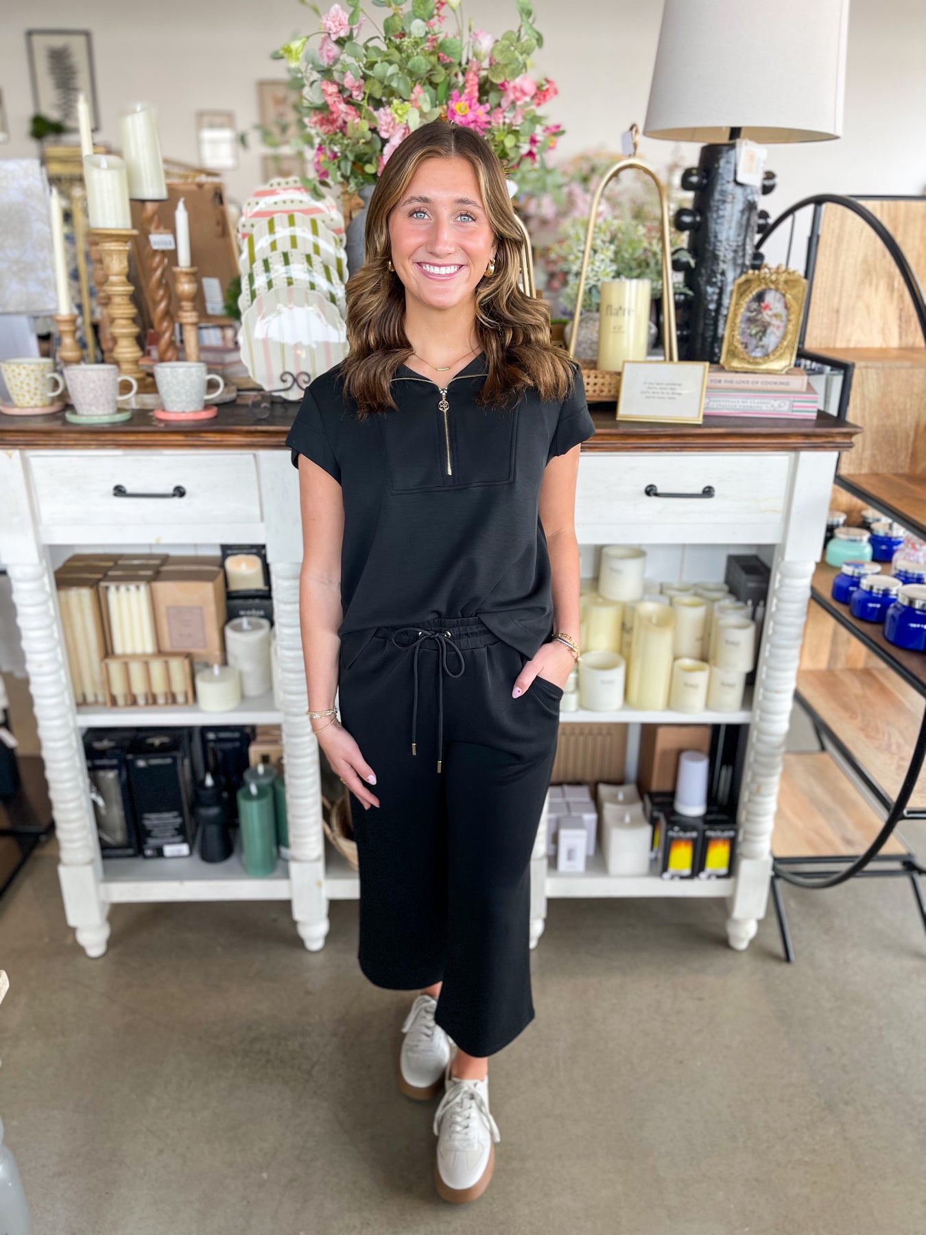 Cozy meets chic with the Mary Square Stephie Black Pant Set. This adorable matching duo features a cropped length and cap sleeves for a perfectly proportioned silhouette. The quarter zip top lets you layer or show off the set, while ultra-soft fabric keeps you snuggled all day long. Functional pockets on both pieces mean style doesn't sacrifice practicality. Whether you're lounging at home or stepping out in style, this trendy set has you covered from top to bottom.