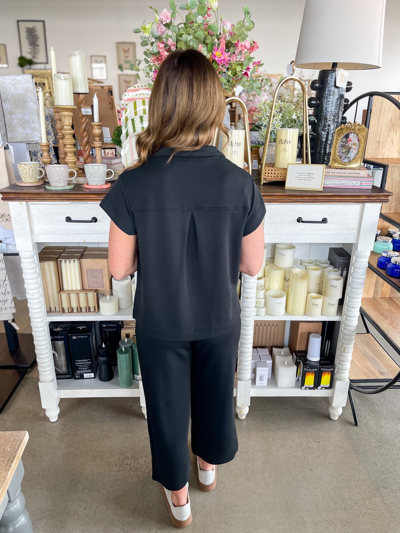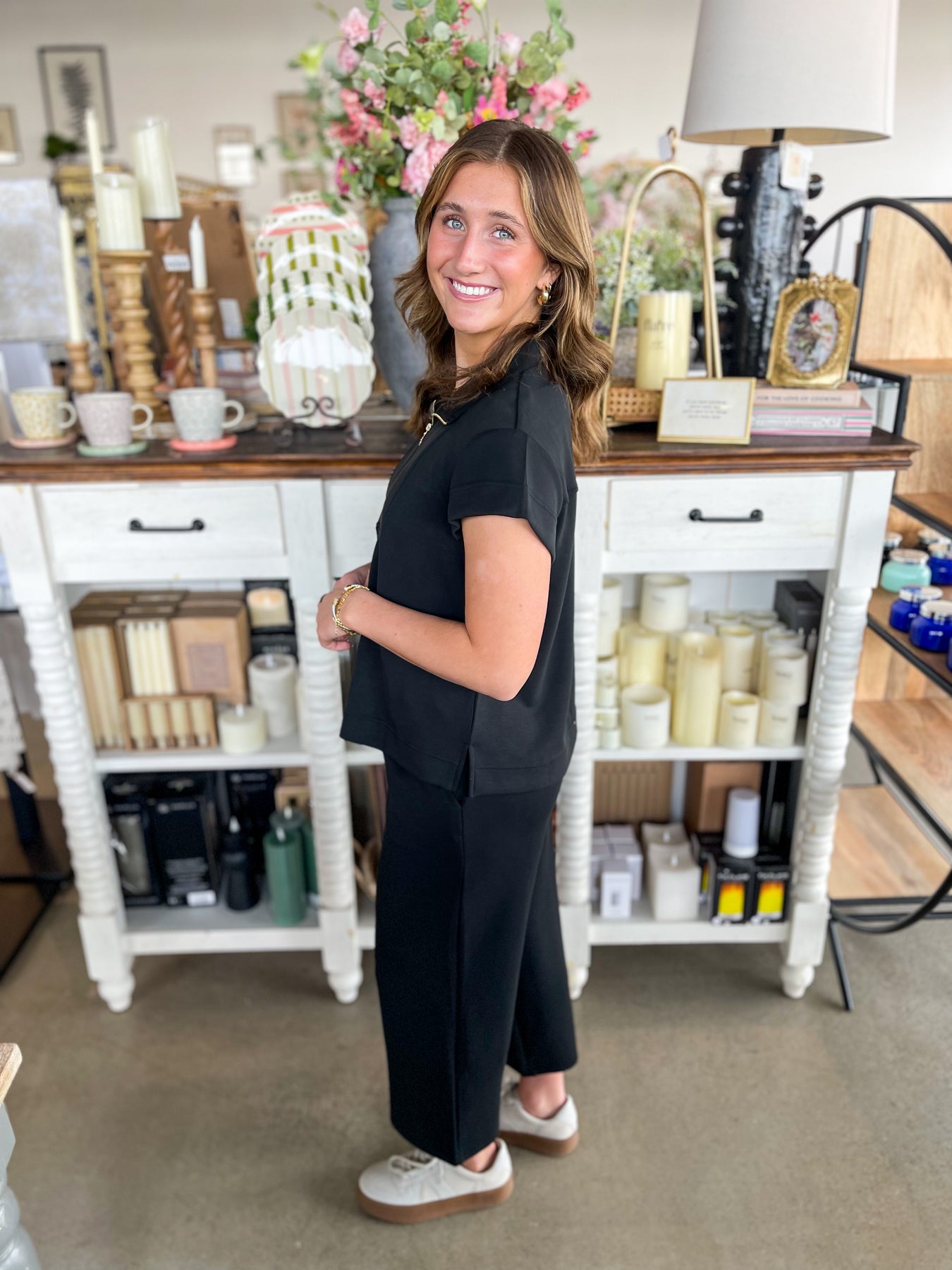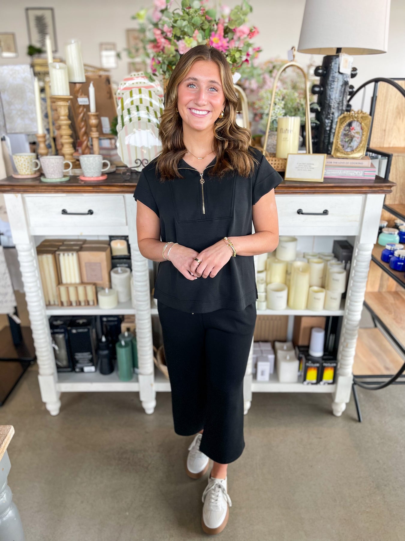 Cozy meets chic with the Mary Square Stephie Black Pant Set. This adorable matching duo features a cropped length and cap sleeves for a perfectly proportioned silhouette. The quarter zip top lets you layer or show off the set, while ultra-soft fabric keeps you snuggled all day long. Functional pockets on both pieces mean style doesn't sacrifice practicality. Whether you're lounging at home or stepping out in style, this trendy set has you covered from top to bottom.