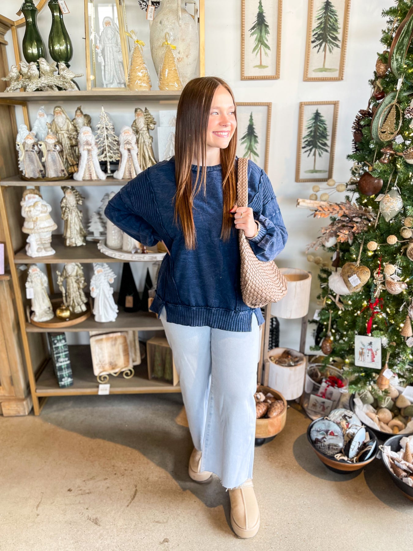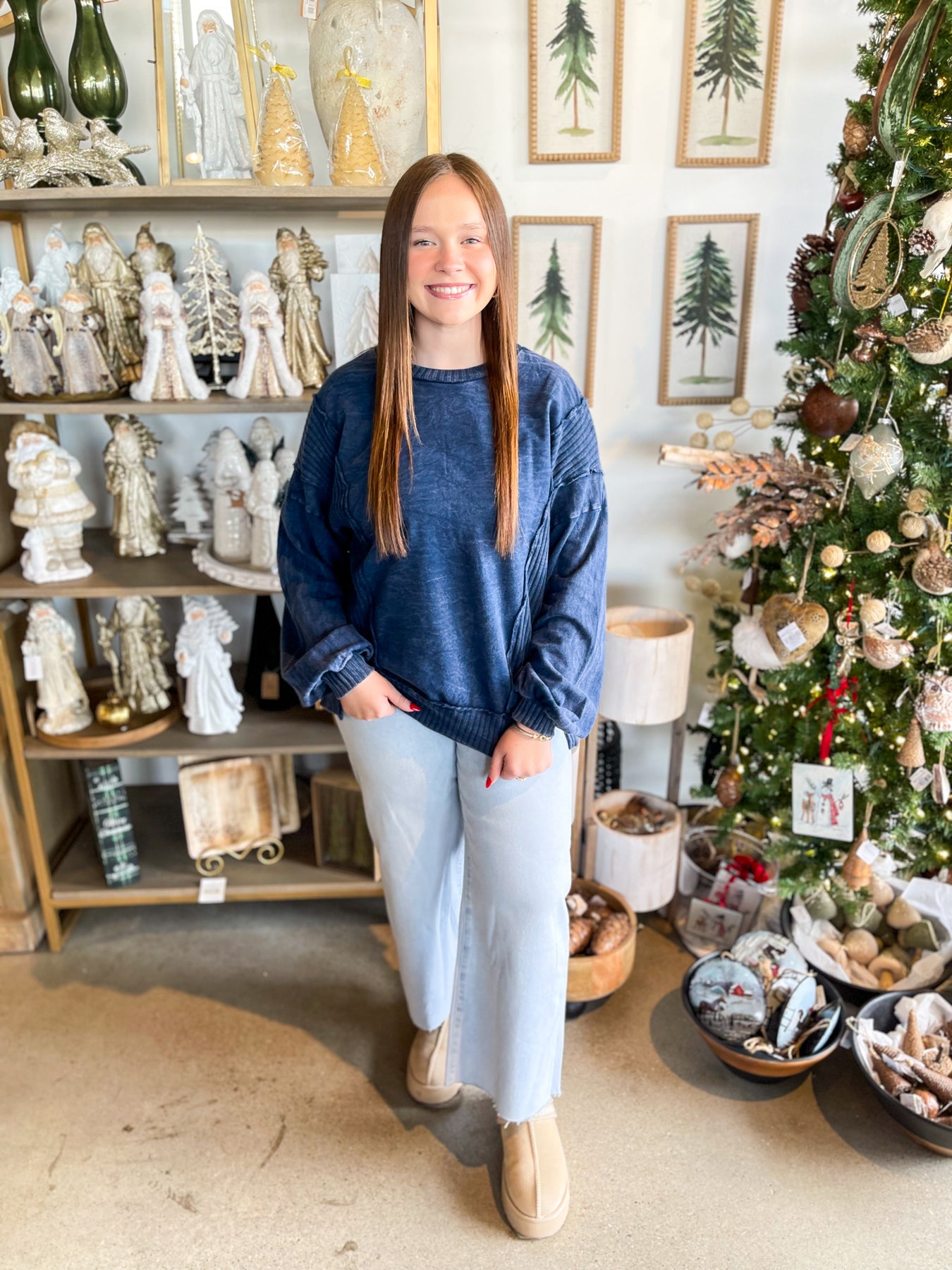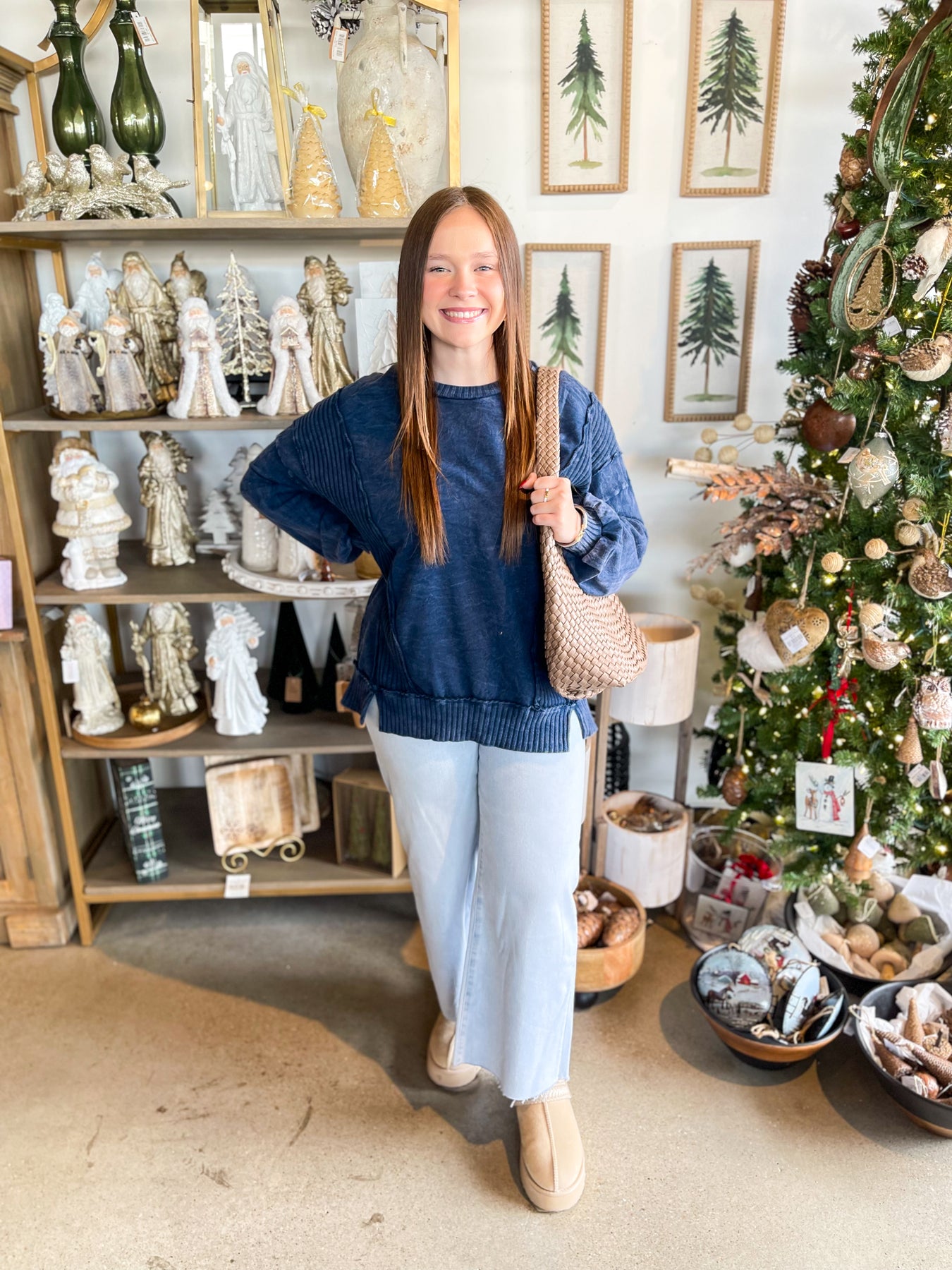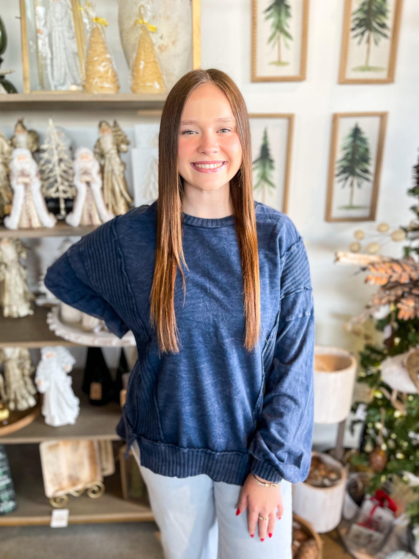 The Navy Mineral Wash J Her Top is pure comfort meets style. This super soft and cozy piece features a trendy mineral washed finish that gives it an effortlessly lived-in look. The oversized silhouette wraps you in coziness while ribbed shoulders add subtle structure and visual interest. The crew neckline keeps things classic and versatile, making it the perfect layering piece or standalone favorite. Whether you're lounging at home or out and about, this top delivers that perfect blend of relaxed vibes and undeniable charm. Your new go-to is here.