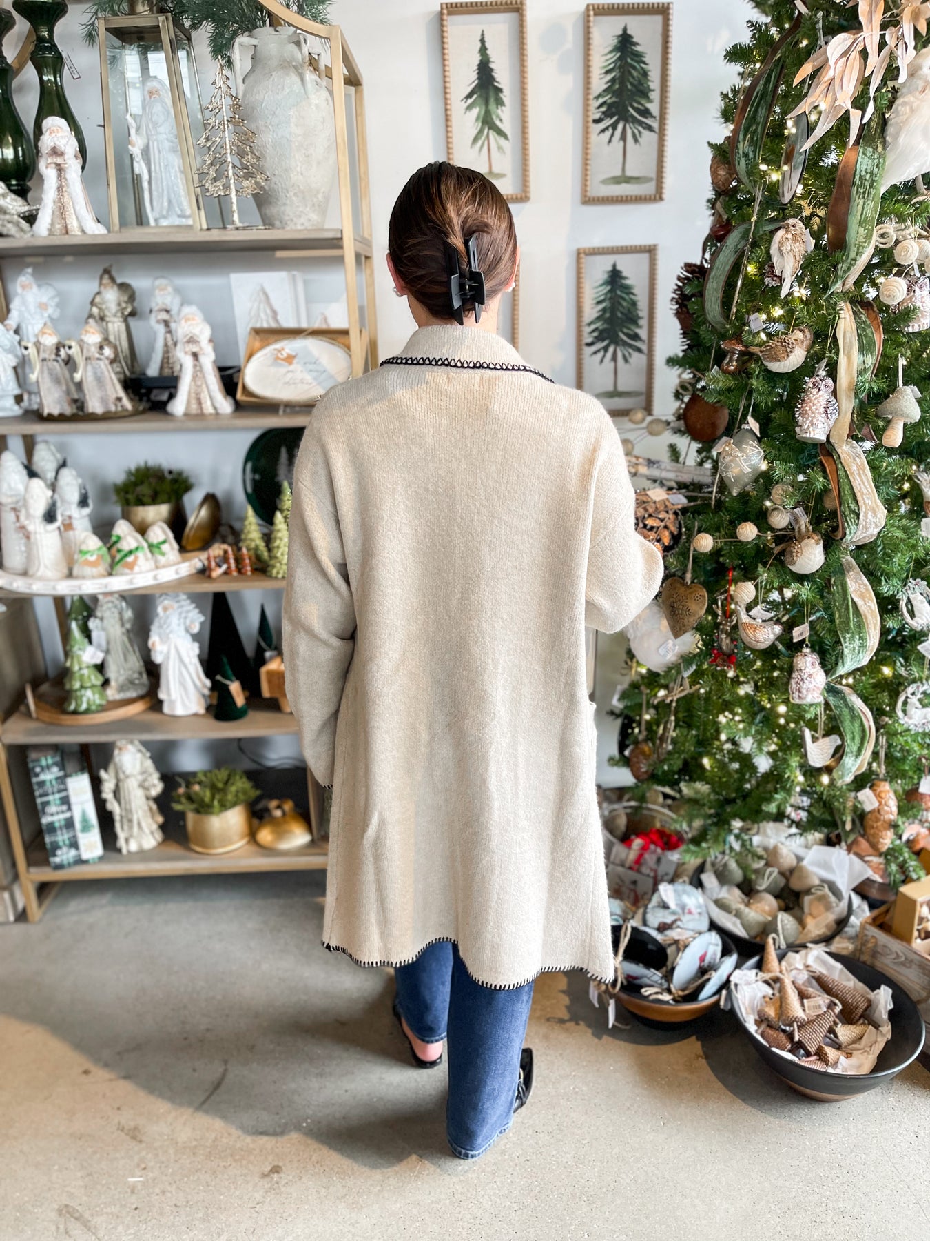 Wrap up in the Oatmeal Contrast Cardigan—a stunning longer length layer that's made for chilly days! This trendy piece features sophisticated black trim details that add visual interest and edge. Functional front patch pockets keep your essentials close while looking effortlessly stylish. The extended length provides extra warmth and coverage, making it perfect for layering over your favorite outfits. Whether you're bundling up for winter or adding a cozy touch to your look, this playful cardigan delivers both comfort and contemporary flair!