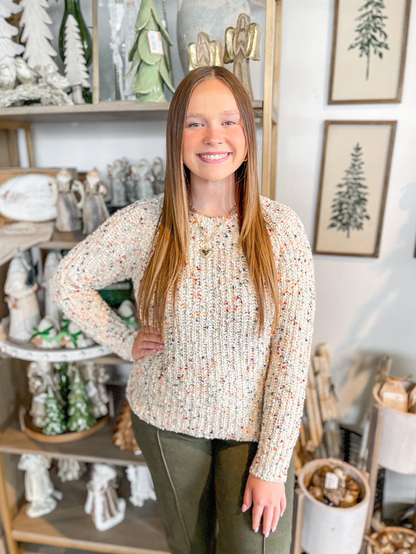 Meet the Oatmeal Popcorn Tori Sweater—a cream chunky knit that's anything but boring. Playful pops of color throughout add personality and charm, making this piece a total mood-booster. The cozy crew neckline and long sleeves keep you warm and comfortable, while the substantial knit texture brings that tactile appeal everyone loves. Perfect for layering through fall or bundling up in winter, this sweater proves that comfort and fun style go hand in hand.