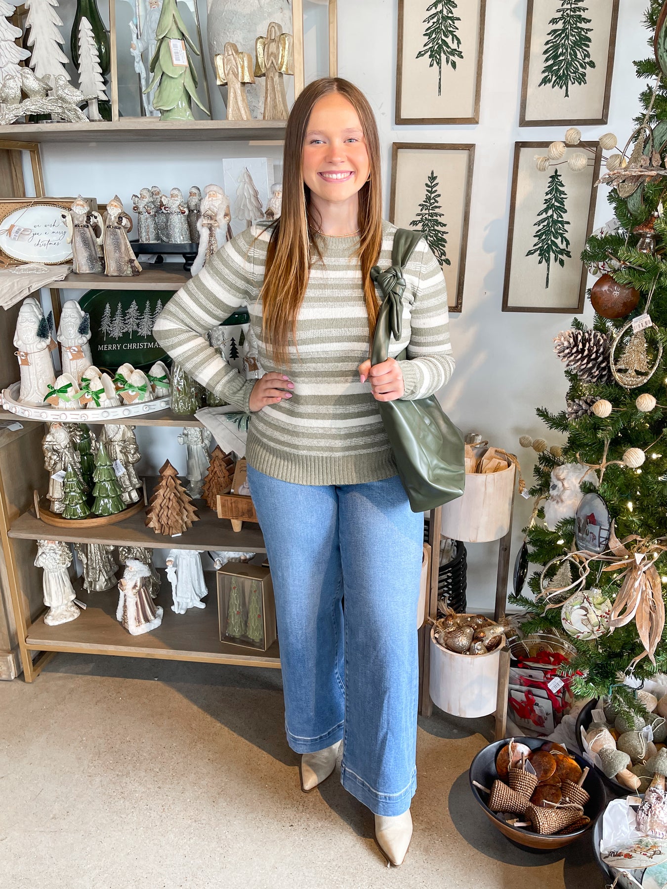 Introducing the Olive Truett Sweater—a gorgeous sage and white striped knit that's as chic as it is wearable. The lightweight construction keeps things breezy without sacrificing warmth, while the fitted silhouette flatters your frame beautifully. A classic crew neckline rounds out the look with timeless appeal, making this sweater the perfect piece to layer or wear solo. Effortlessly trendy and undeniably stylish, this striped beauty is ready to become your new seasonal staple.
