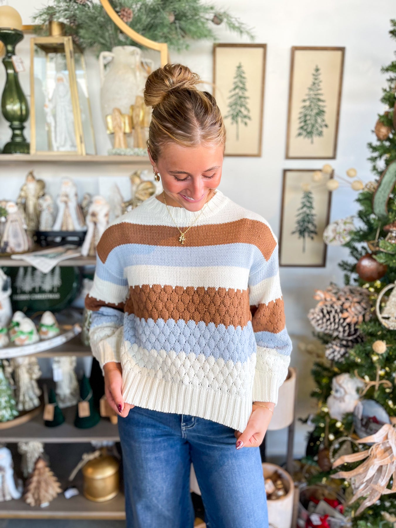 This stunning striped sweater is your new go-to piece for effortless style. Featuring a gorgeous mix of blue, brown, and cream stripes with a textured knit, it's got all the cozy vibes without the bulk. The fitted, cropped silhouette pairs perfectly with high-waisted bottoms, while the chunky knit and crewneck keep things casual and chic. Long sleeves mean you can rock this beauty year-round—whether you're layering or going solo. Trendy, textured, and totally wearable.