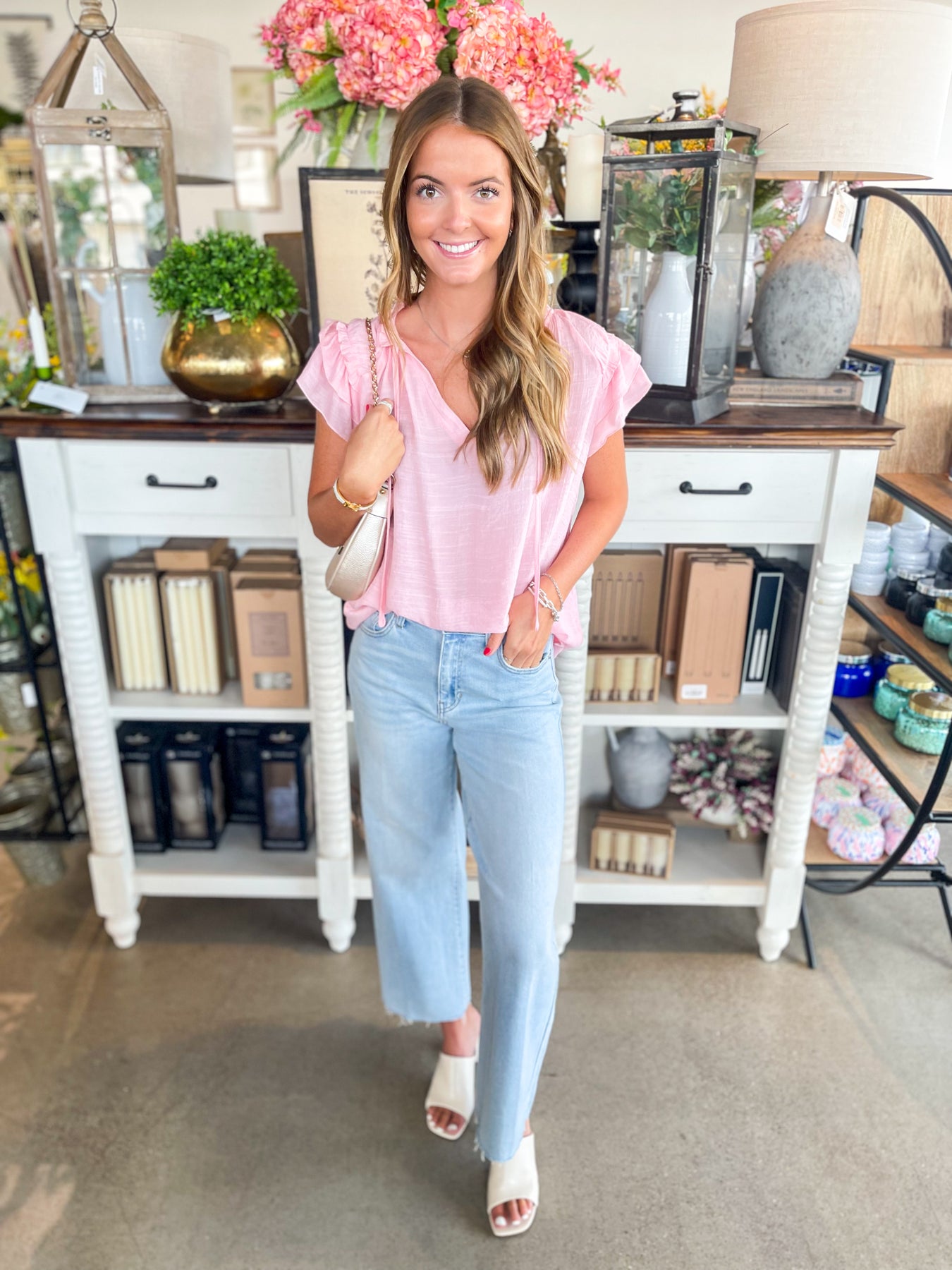 Brighten your summer days with this stunning pink lightweight top. Featuring playful ruffle sleeves and a charming ruffle neckline, its lower V-neck adds a flirty touch. Perfect for dressing up or down, this top brings effortless style and a fun vibe to any outfit.