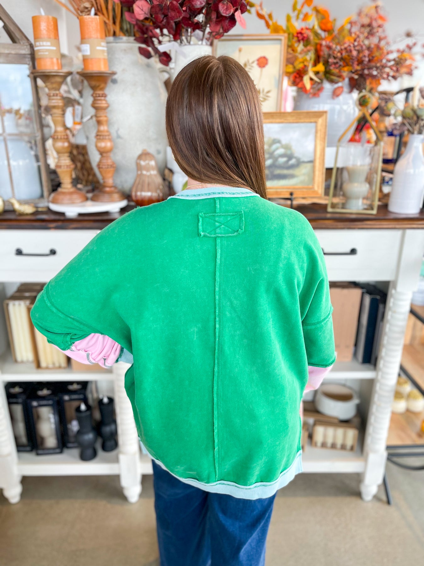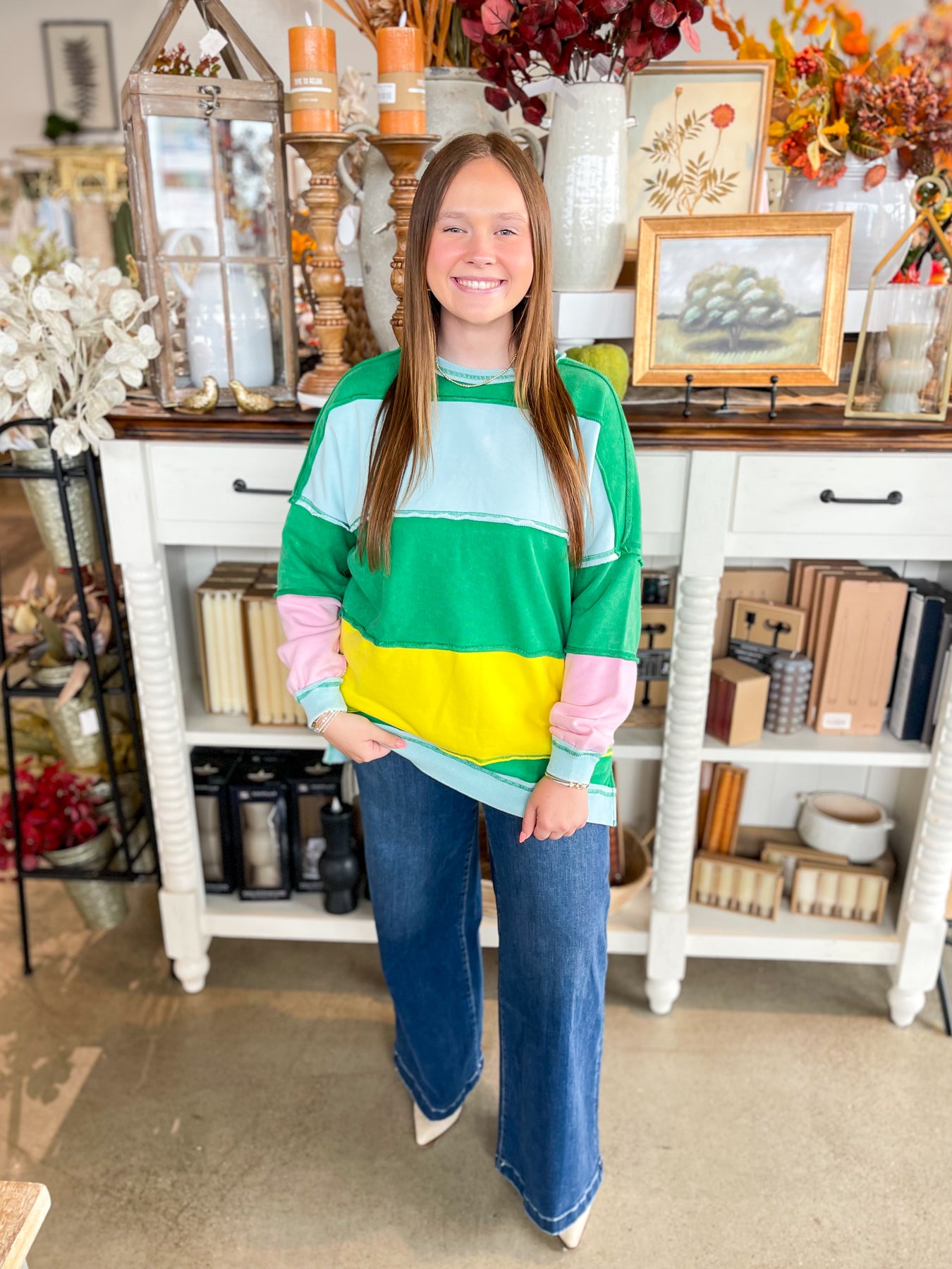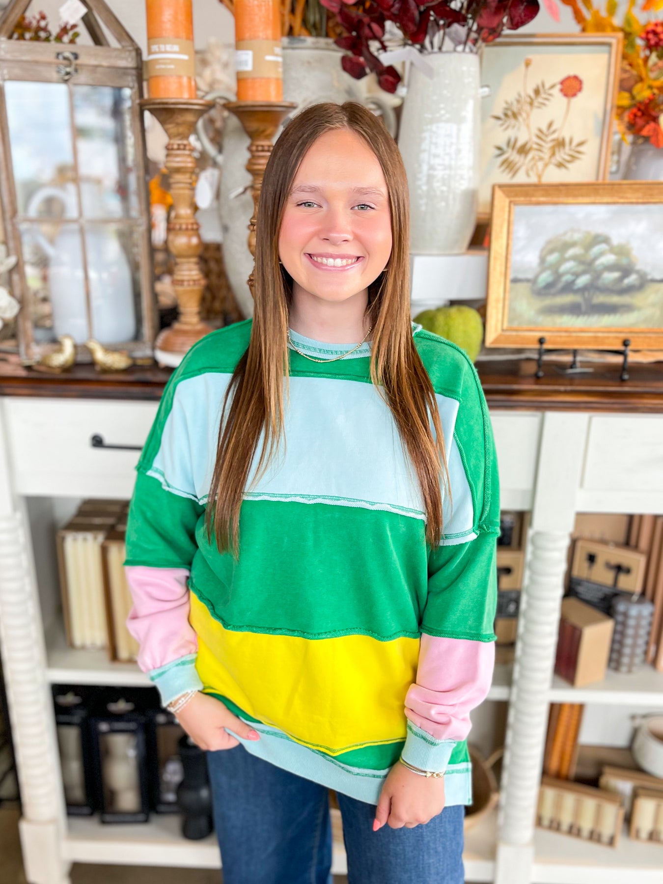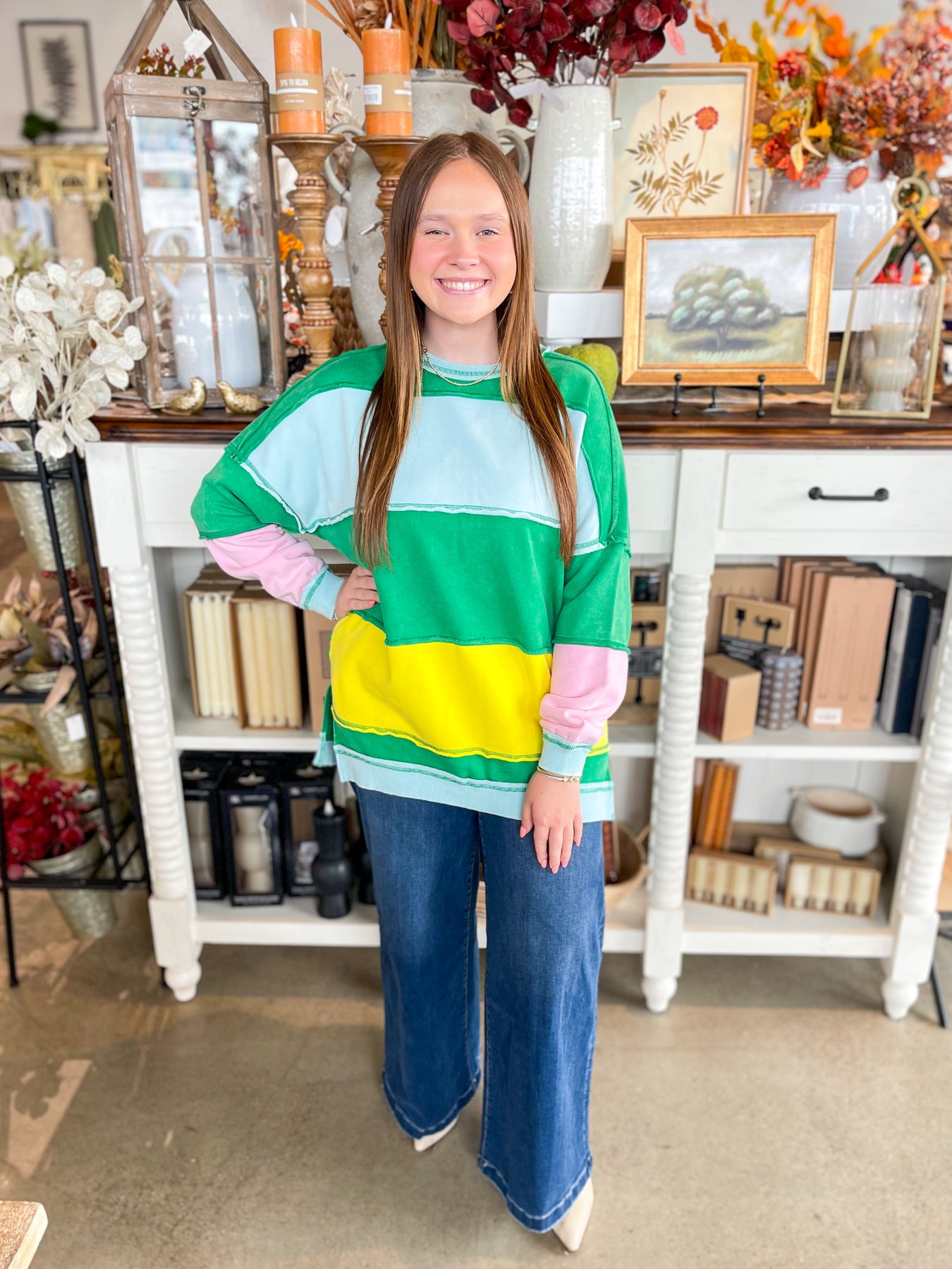 Experience cozy comfort with this oversized, soft sweatshirt featuring vibrant green, blue, and pink color blocks. Its exposed seams add a cool, casual edge, making it the perfect playful layer for fall days when you want to stay comfy and stand out.