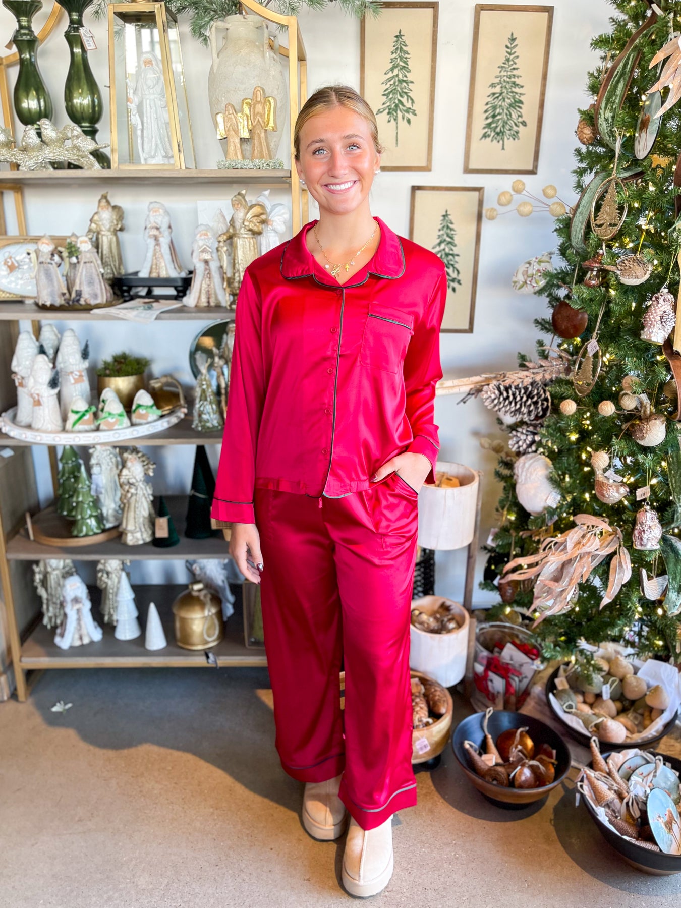 Slip into luxury with these super soft and sleek silk pajamas—the ultimate winter essential! Lined with gorgeous green satin for an extra touch of elegance, these trendy pjs are designed for comfort and style. The wide-leg pants feature practical pockets and a comfortable elastic waistband, so you can lounge without sacrificing sophistication. Perfect for cozy nights during the holiday season or any time you want to feel pampered and put-together, these silk pajamas are your ticket to restful, fabulous sleep. Sweet dreams in style!