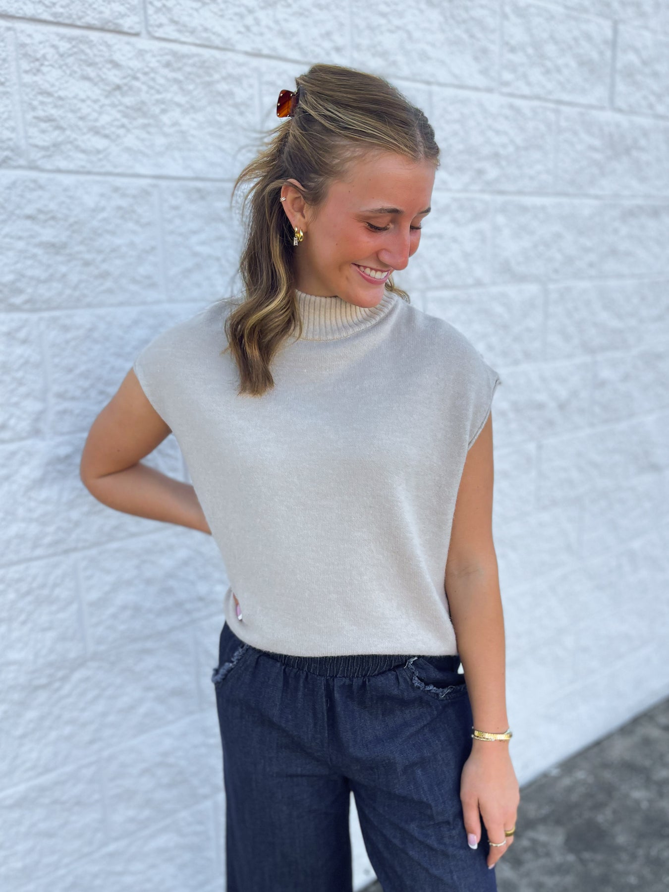 Cozy up your fall wardrobe with this stunning taupe mock neck sleeveless sweater. Its slightly oversized, super soft knit makes layering a breeze while keeping you stylish and comfy. Perfect for mixing and matching, this trendy piece adds a playful touch to any outfit!