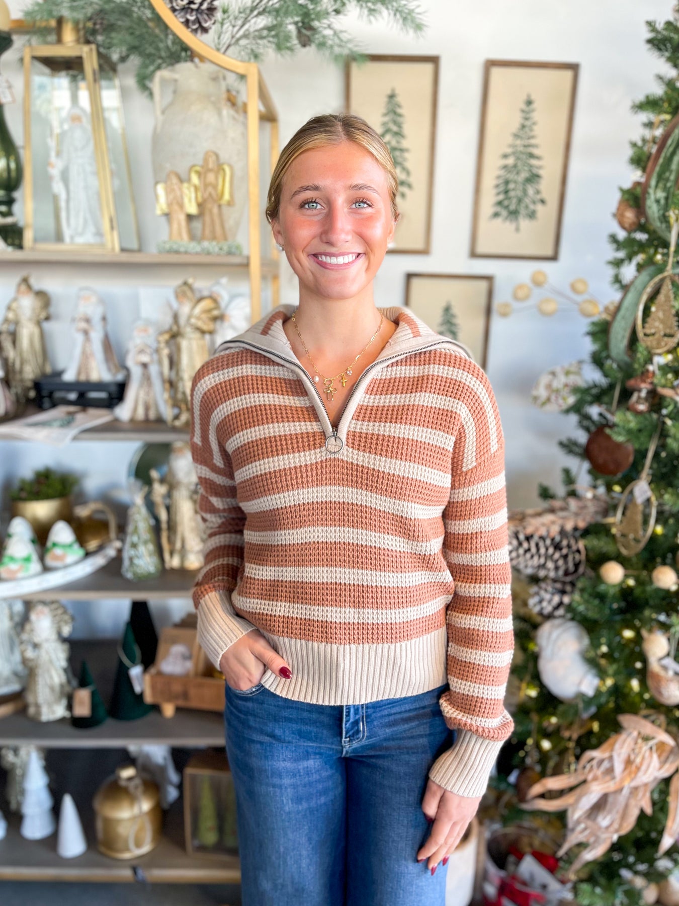 Elevate your sweater game with this adorable half-zip pullover that blends warmth and style in perfect harmony! The rich tan and terracotta color palette creates a sophisticated, earthy vibe, while brushed silver accents add just the right amount of shimmer and shine. Featuring a cozy knit construction with a charming collar detail and long sleeves, this piece is both trendy and timelessly cute. Perfect for layering or wearing solo, it's the ultimate go-to for looking effortlessly put-together while staying snug and comfortable all day long.