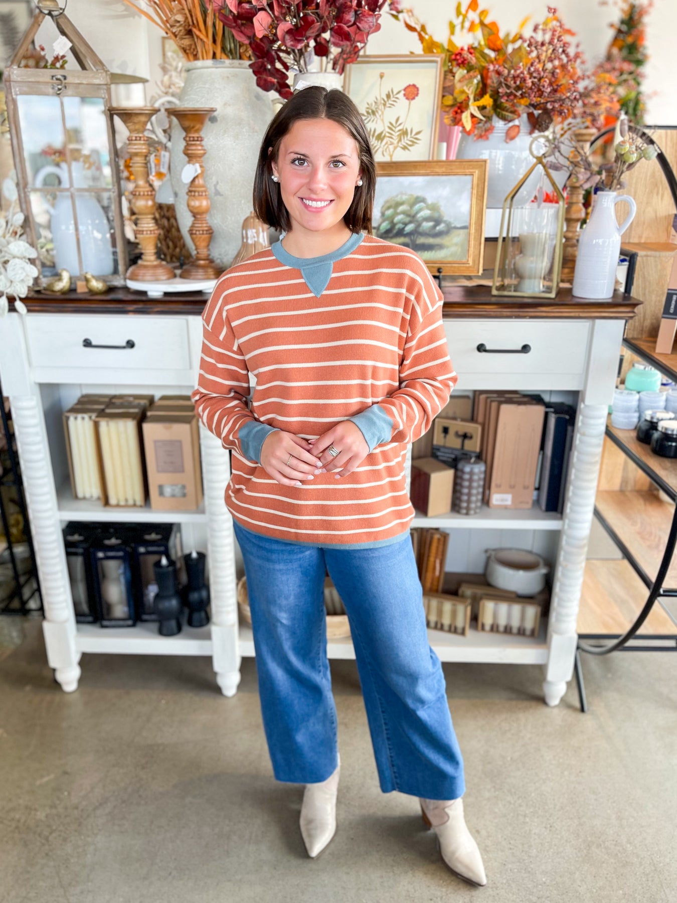 The Terra Cotta Oversized Sullivan Sweater is a playful fall favorite with its stunning muted orange and white stripes. Cute pops of blue around the collar, sleeves, and hem add charming detail. Perfect for dressing up or keeping it casual, this cozy sweater is ready to brighten your seasonal wardrobe.