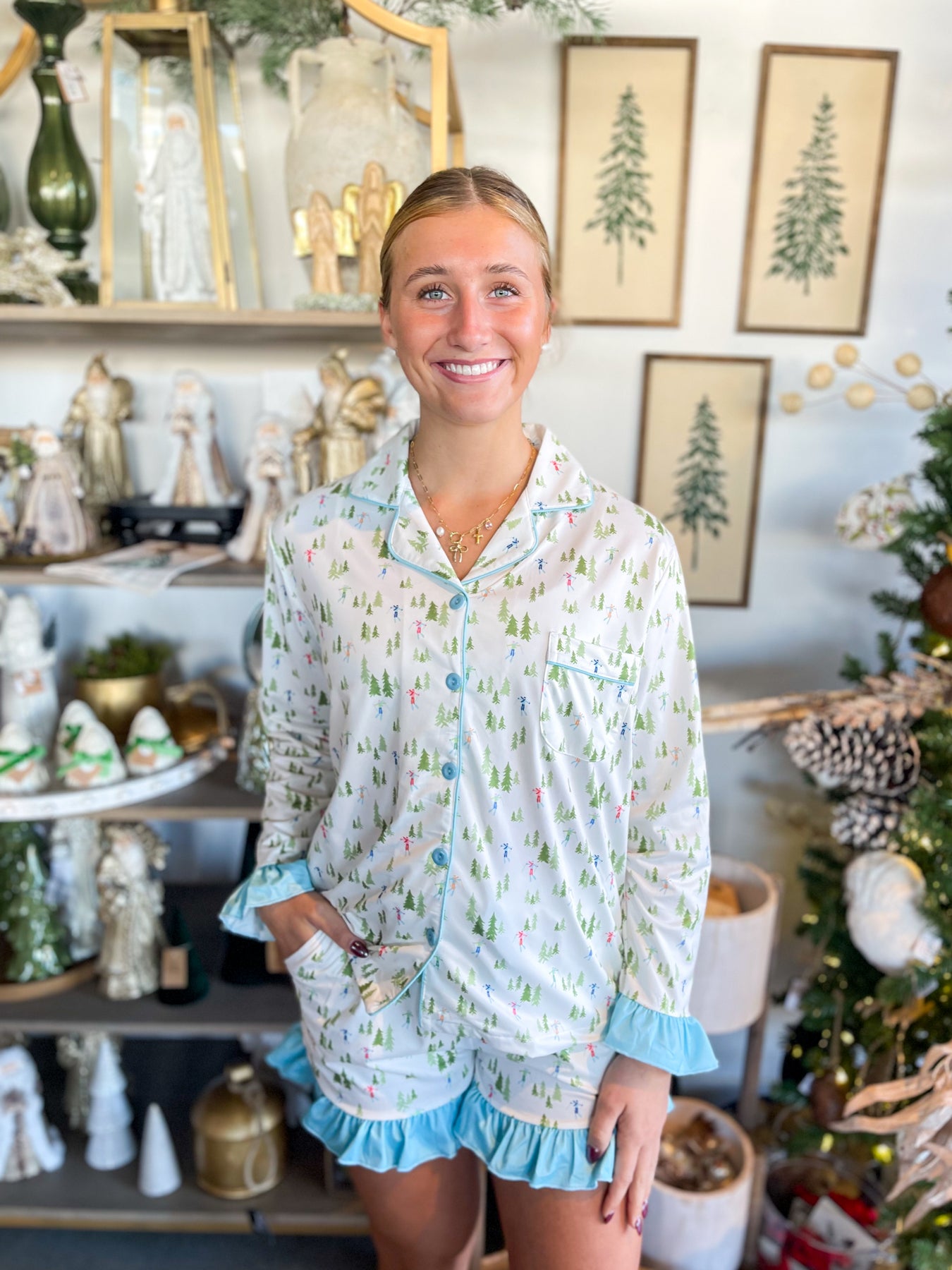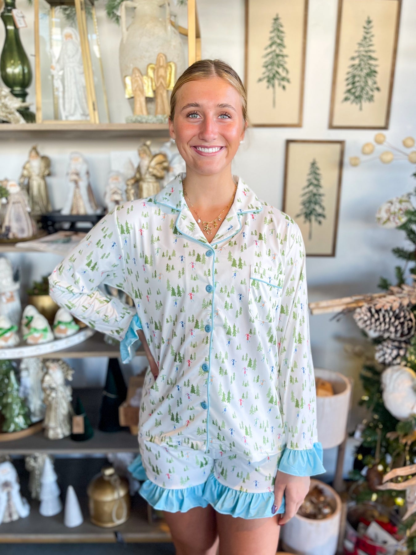 Get cozy in style with these absolutely adorable light blue and white pajamas! Featuring a charming ski print with trees, this set brings playful winter vibes to bedtime. The girlie, fun design includes delightful ruffle details at the shorts hem and sleeve hem, while matching lining on the top and a coordinating ribbon on the shorts tie the whole look together beautifully. Trendy, stylish, and oh-so-cute, these pajamas are perfect for snuggling up during the holidays or any time you want to feel extra special. Sweet dreams never looked so good!