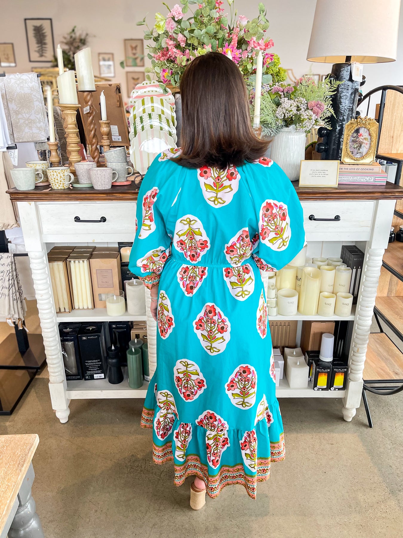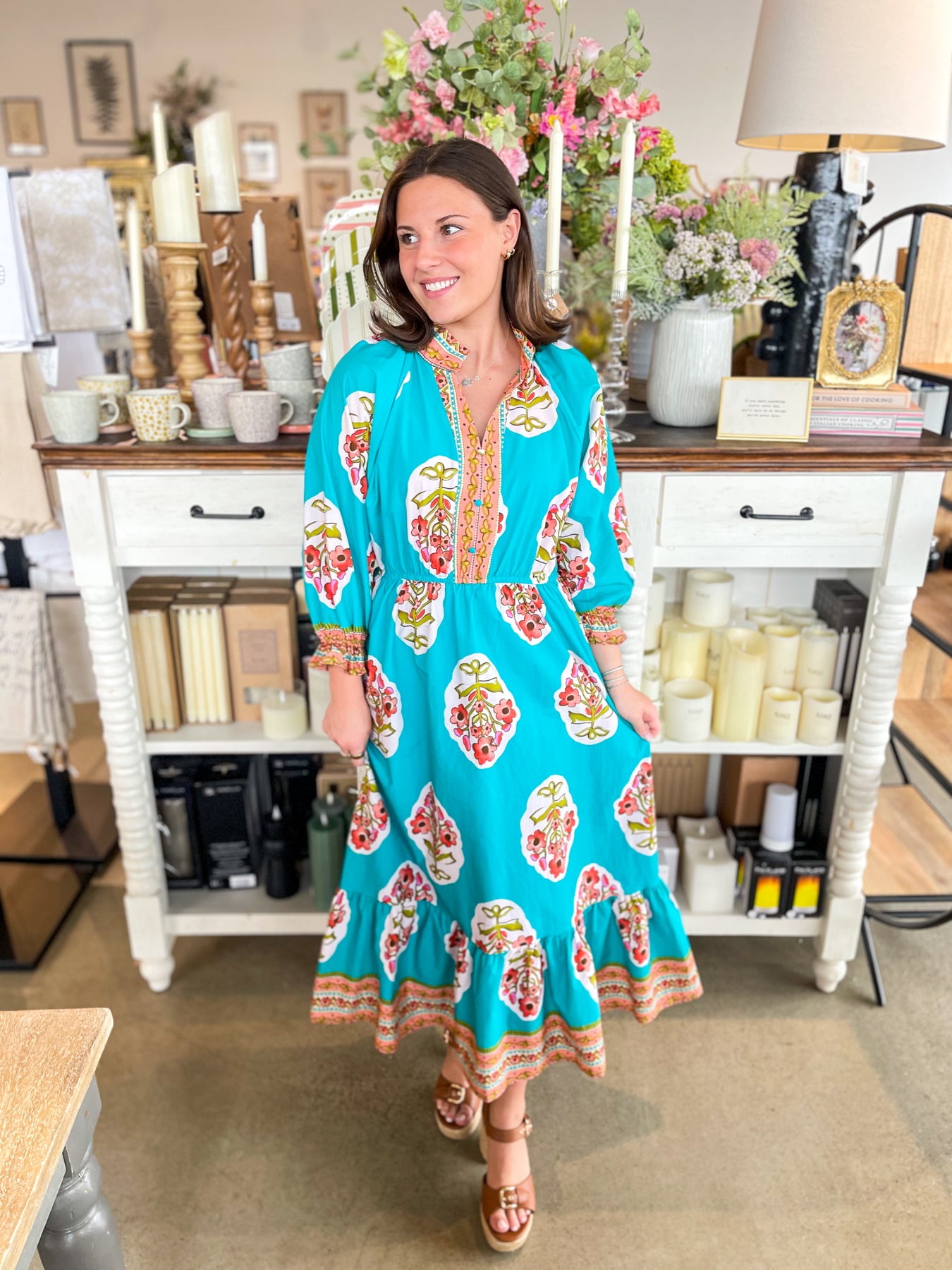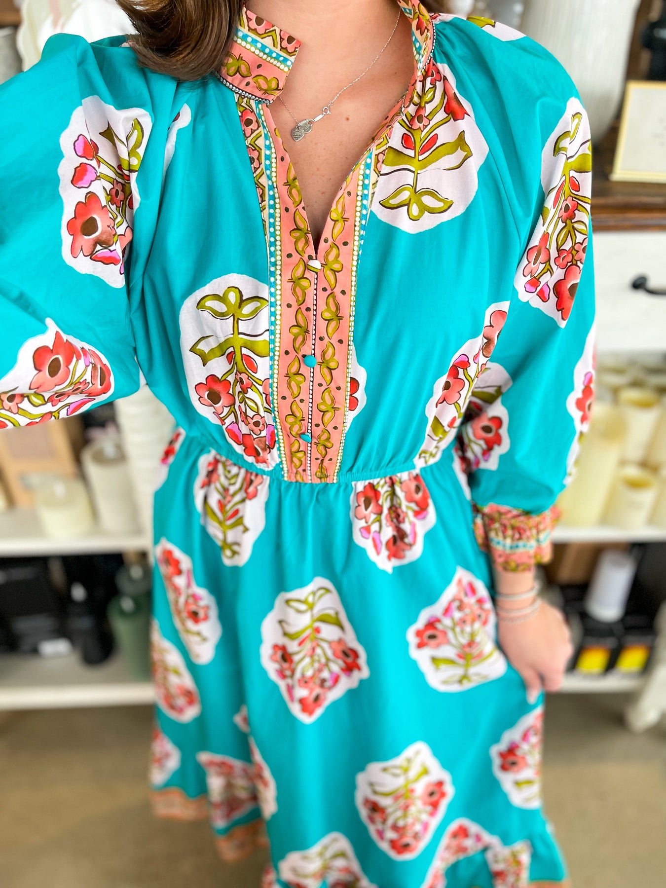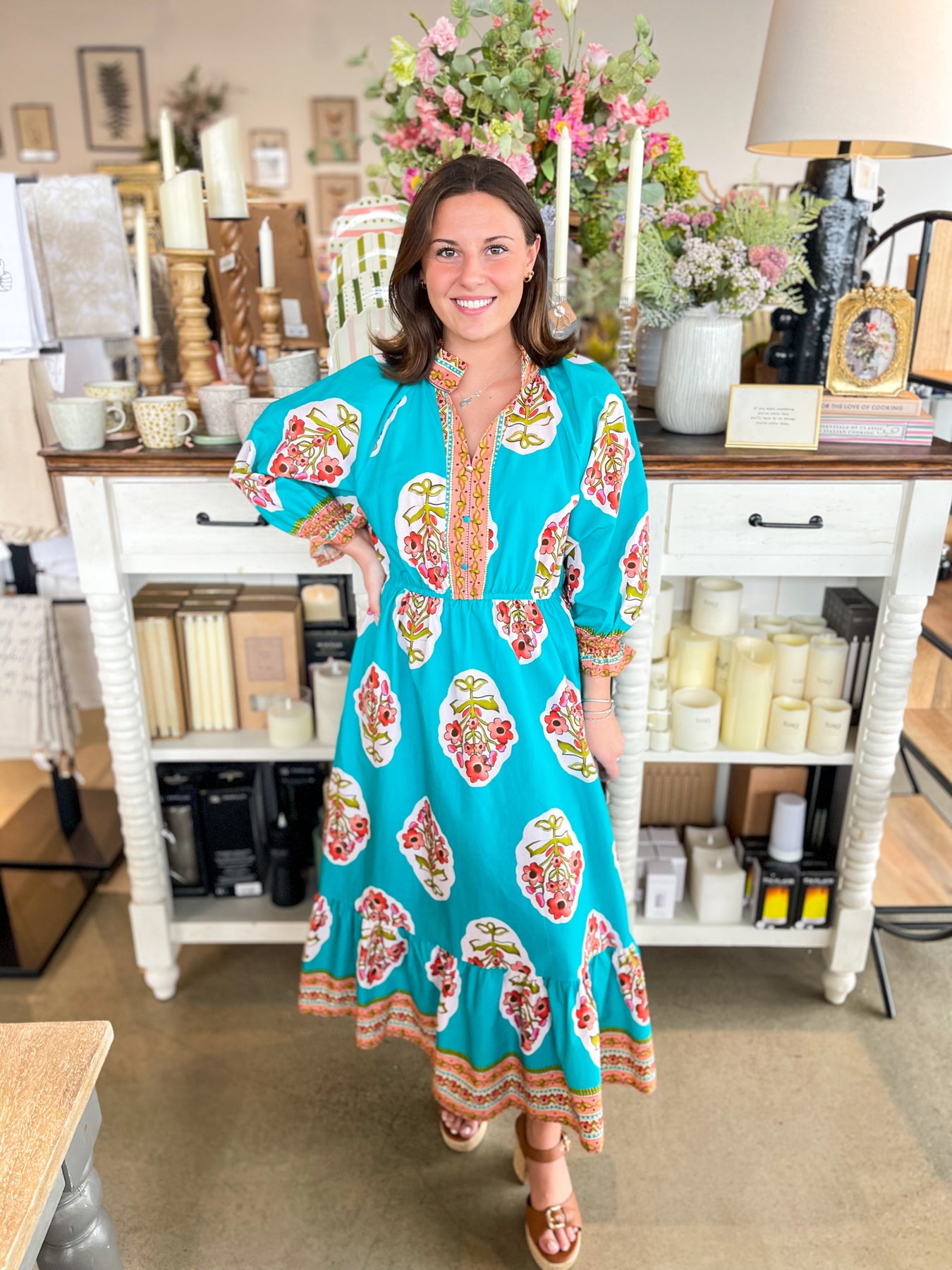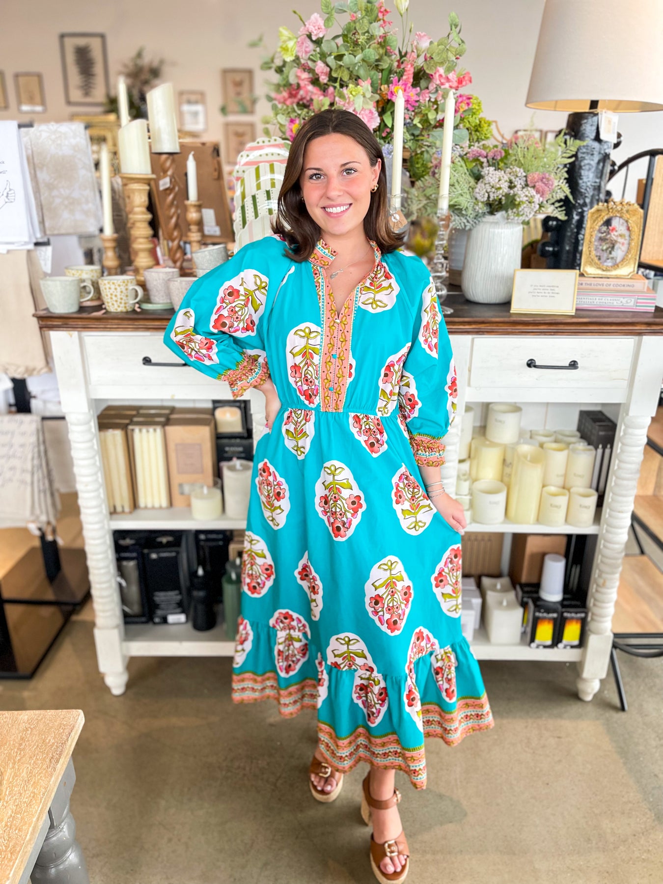 Turn heads in this vibrant Umgee maxi dress that radiates effortless style. A stunning bright blue base is brought to life with cheerful pops of orange and light pink woven throughout an adorable floral print. The elegant v-neckline and longer sleeves offer a sophisticated touch while keeping things fun and on-trend. Perfect for anyone who loves bold color and wants to make a memorable impression.