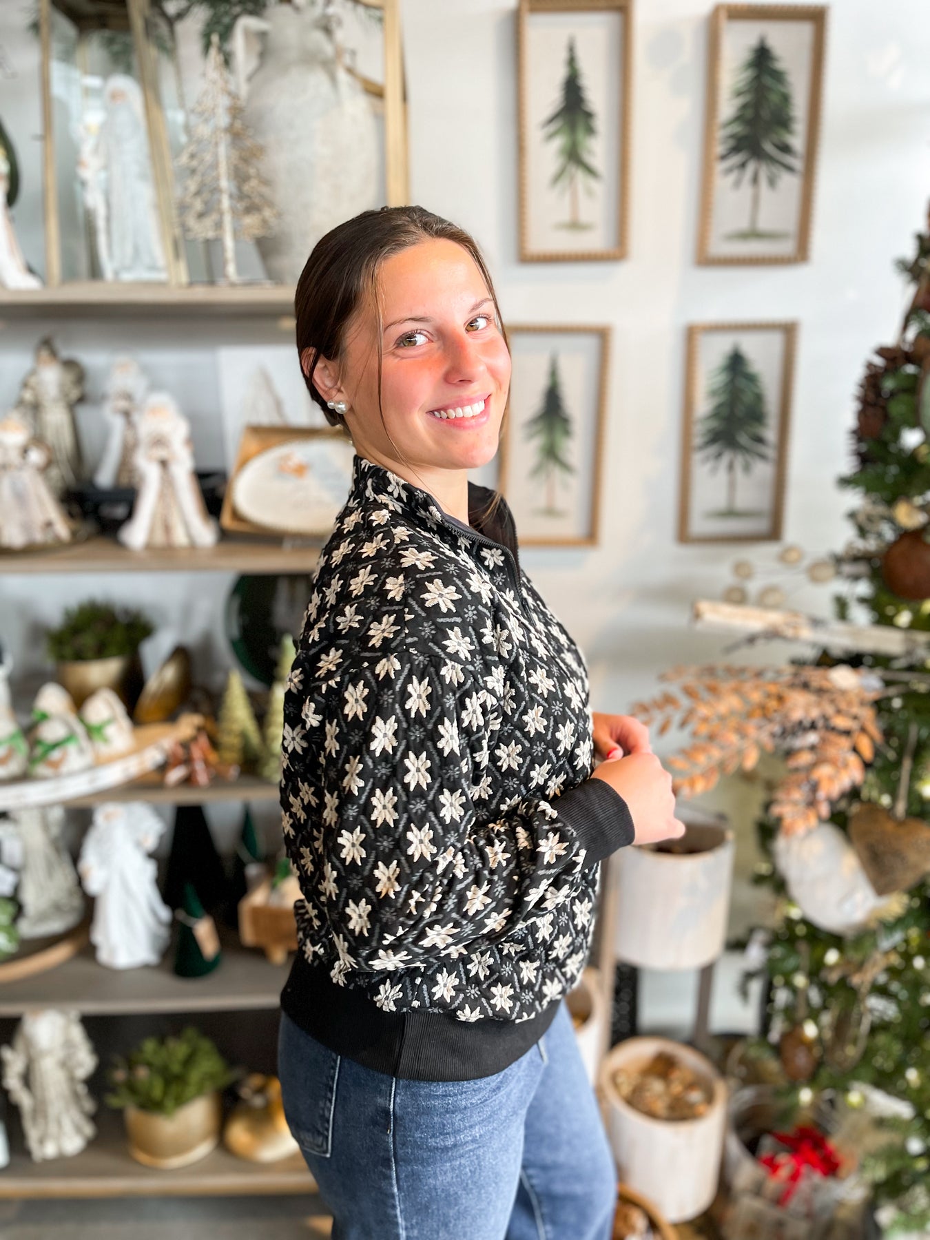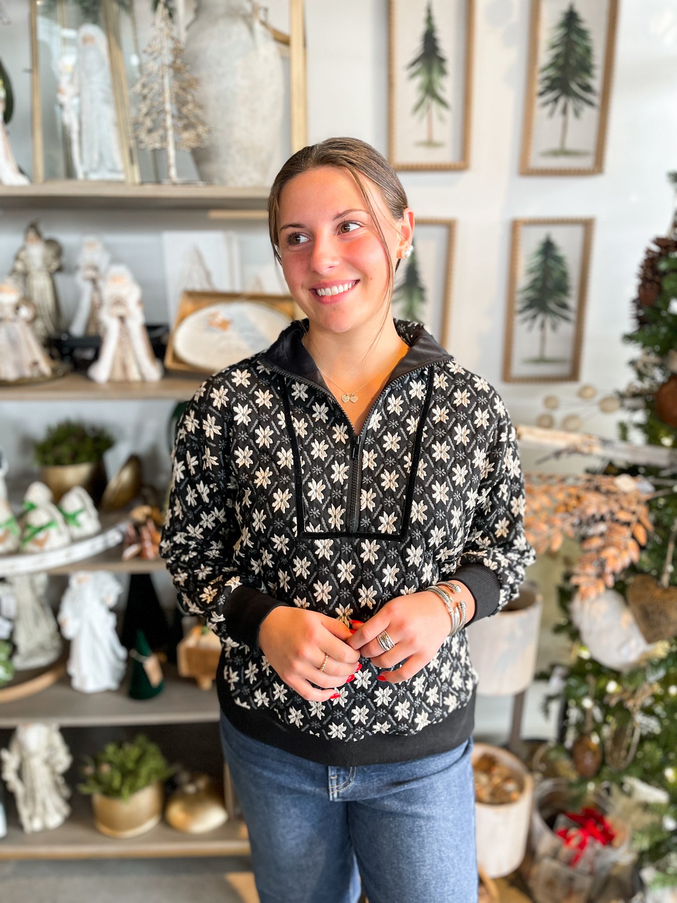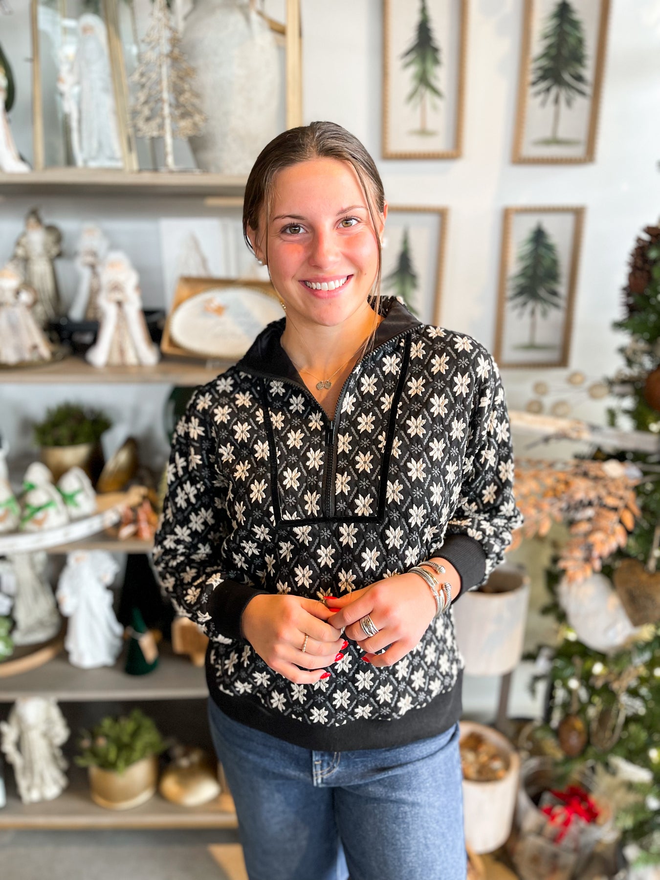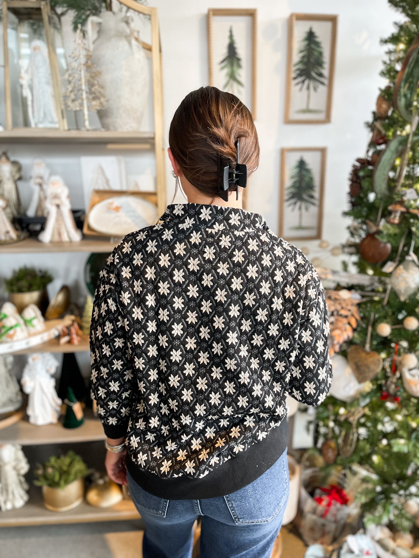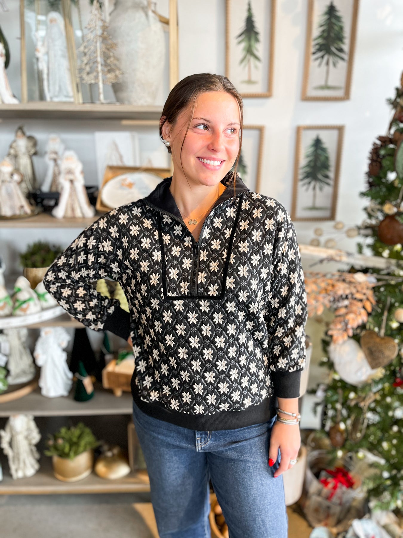 Introducing the Umgee Black Kylie Top—a stunning pullover that's bursting with charm! This playful piece showcases a gorgeous Black and white floral design that's sure to turn heads. Crafted from super soft fabric with luxe navy velvet lining, it feels as amazing as it looks. Long sleeves and a classic collar provide timeless appeal, while the sleek metal zipper adds a modern touch. The beautiful color and texture combination makes this top an instant wardrobe essential that works for any occasion.