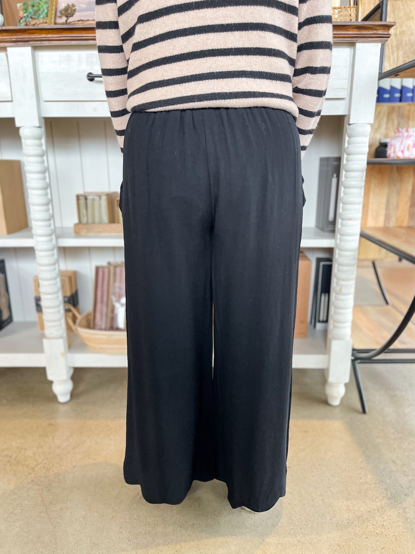 These black linen mix Lani pants are the definition of effortless elegance. The soft, breathable fabric feels amazing against your skin while the wide-leg silhouette creates a flattering, relaxed fit. A slightly cropped length pairs perfectly with the loose cut, and the scalloped detail along the hem adds a charming, unexpected touch. Functional pockets and an elastic waist keep comfort at the forefront. Dress them up or down—these versatile pants are about to become your new favorite.