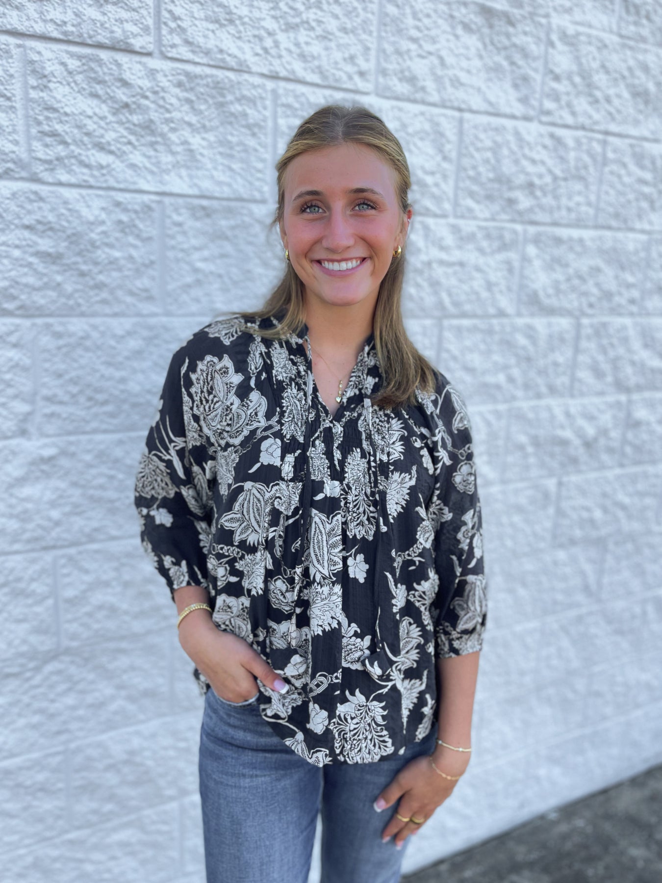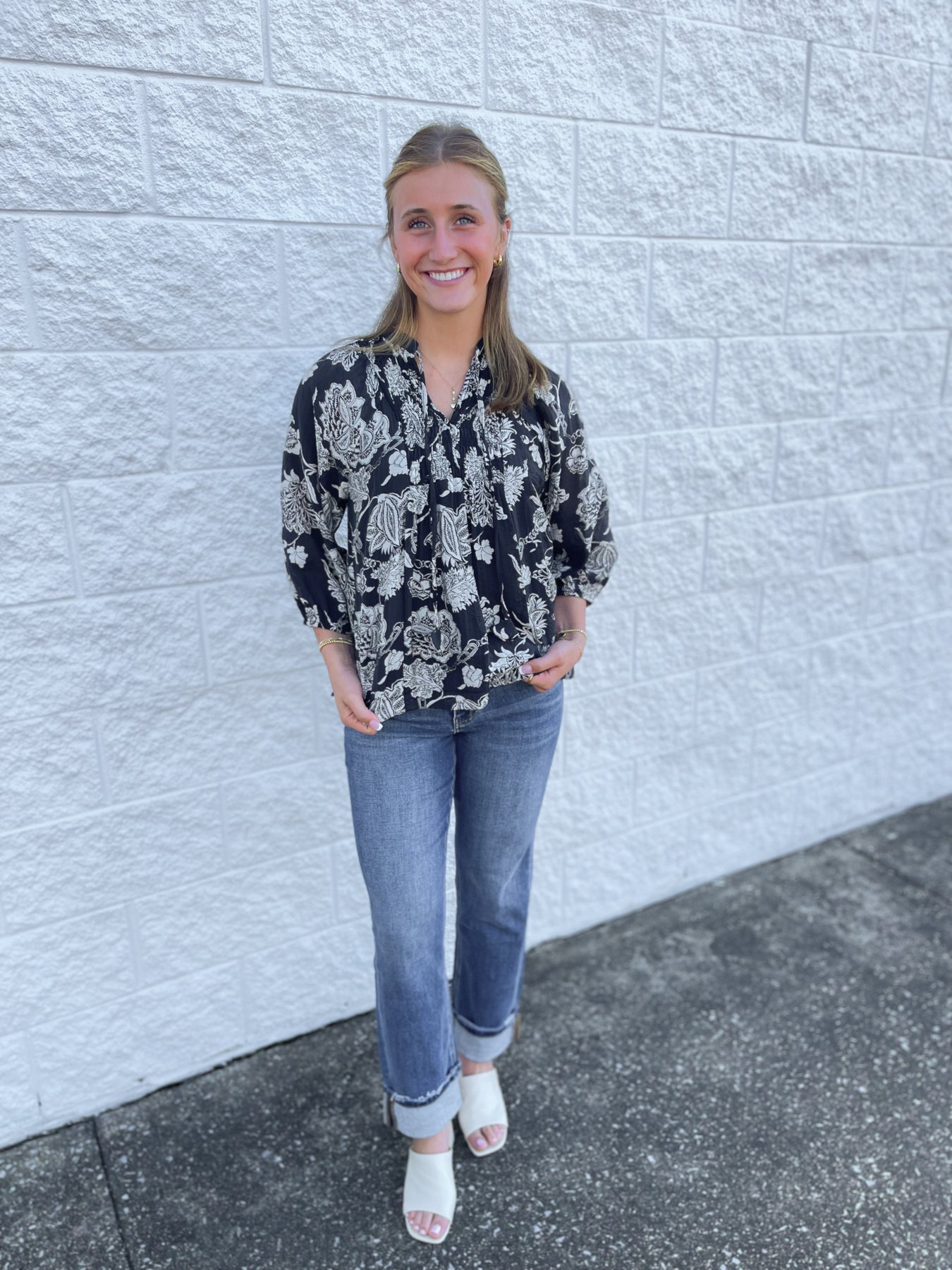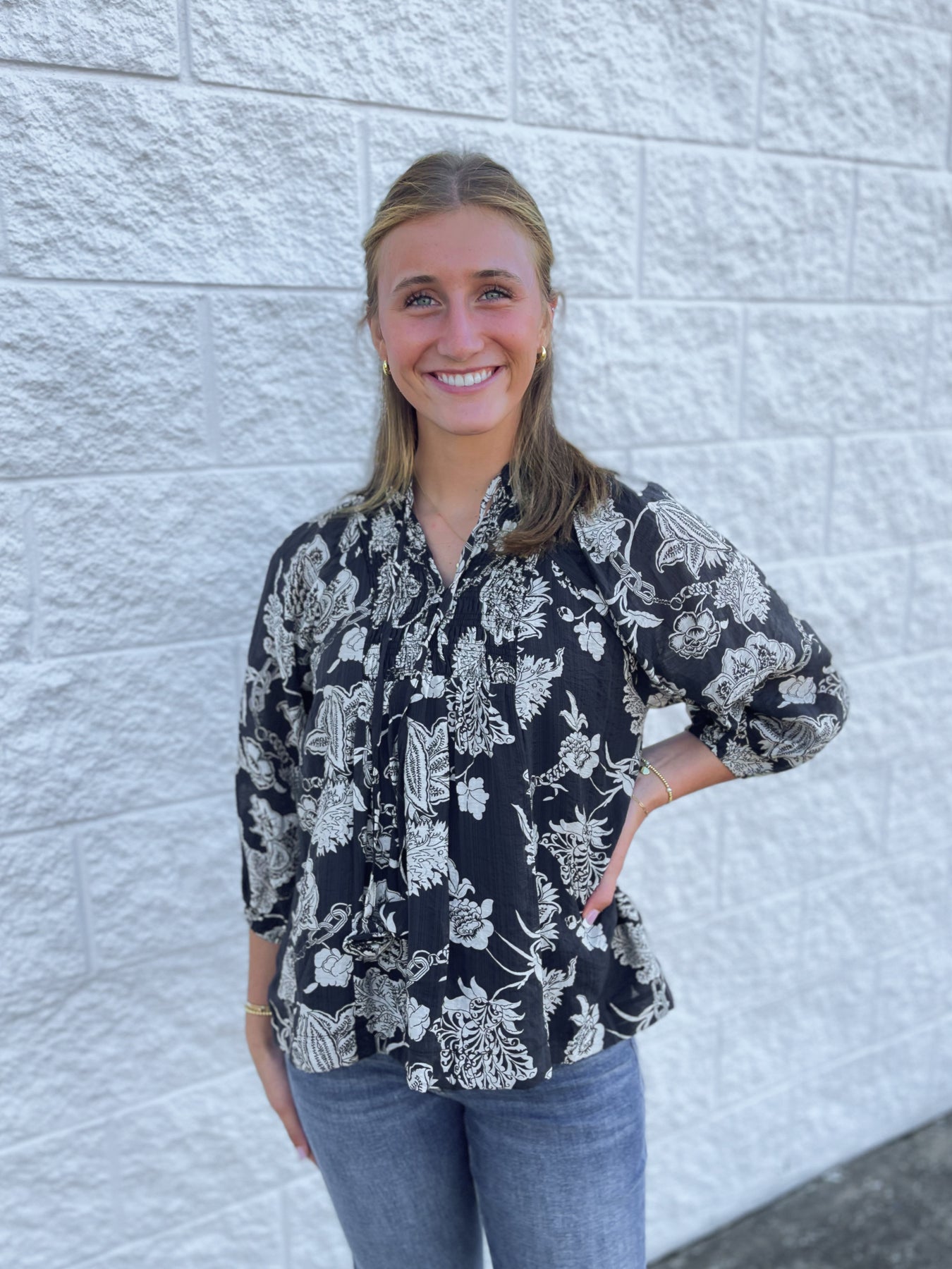 The Umgee Black Maddox Top is a fall favorite with its black and white floral print and playful smocked neckline. Featuring a flattering v-neck and flowy fit, it’s perfect for layering or wearing on its own. The 3/4 elastic sleeves add a cute, comfy touch, while the longer length keeps you cozy and stylish all season.