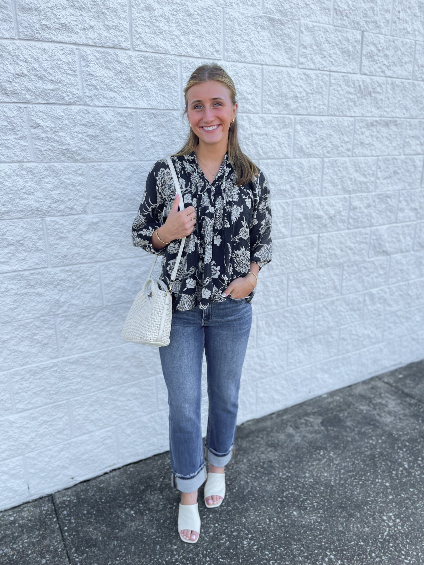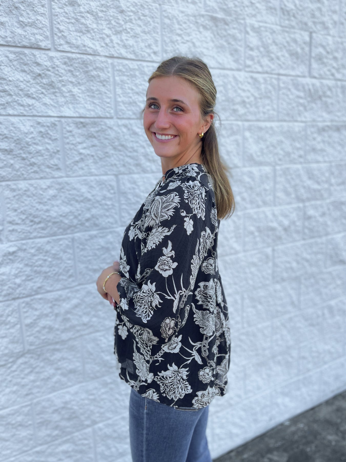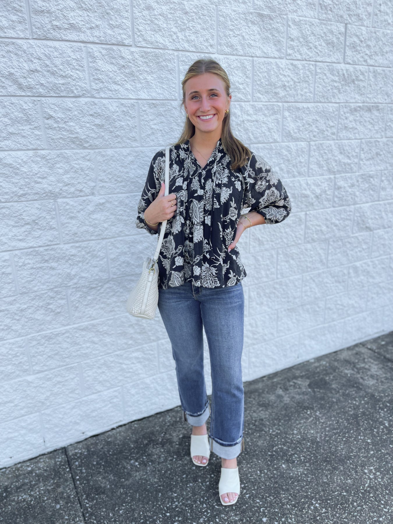 The Umgee Black Maddox Top is a fall favorite with its black and white floral print and playful smocked neckline. Featuring a flattering v-neck and flowy fit, it’s perfect for layering or wearing on its own. The 3/4 elastic sleeves add a cute, comfy touch, while the longer length keeps you cozy and stylish all season.