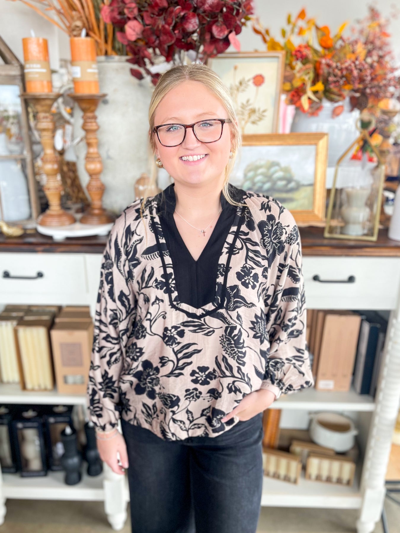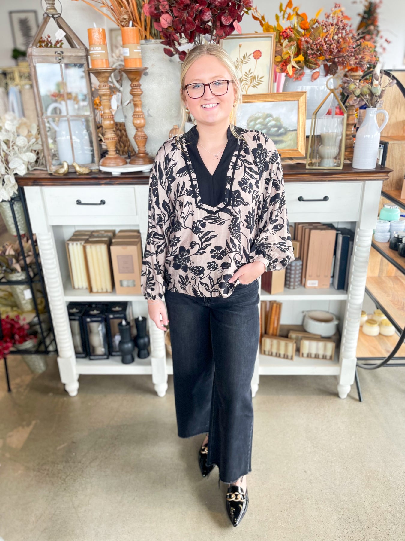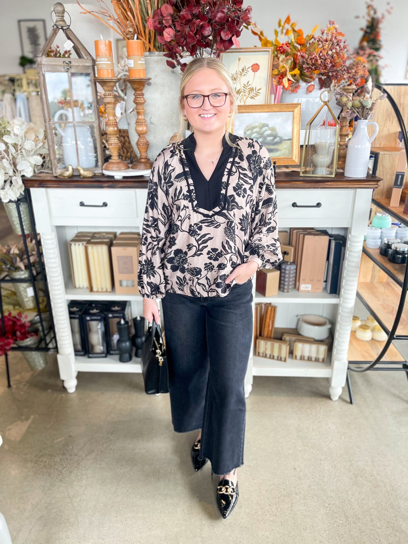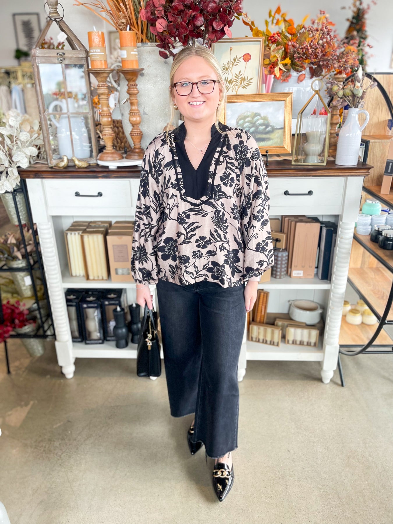 The Umgee Black Taupe Mix Top combines a stunning nude and black floral print with lightweight, flowy fabric perfect for fall. It features a slight V-neck and smocked wristbands on the sleeves, adding a fun and flirty detail to this effortlessly chic piece.