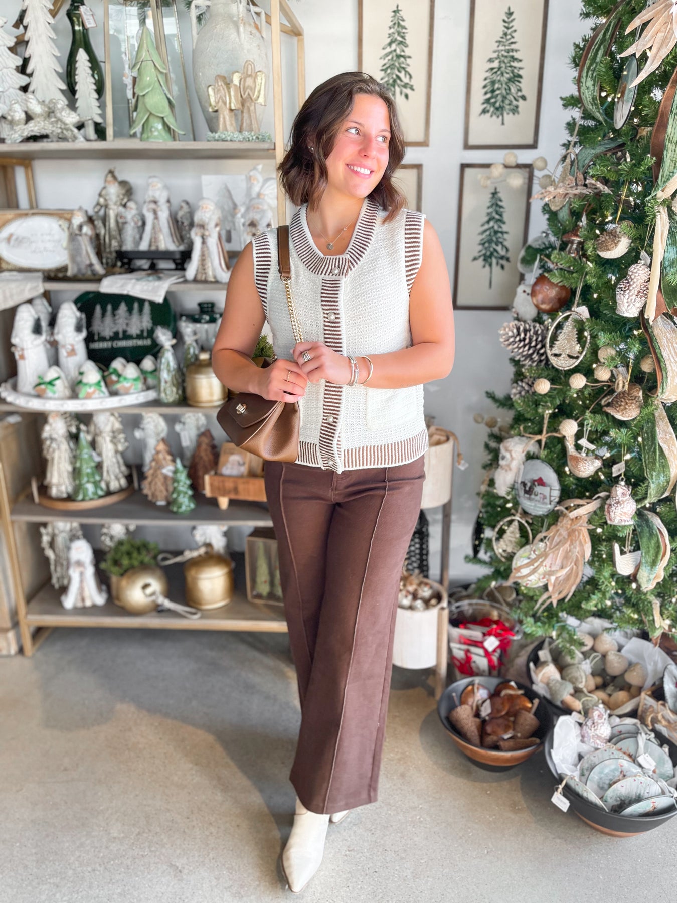 The Umgee Cream Coyle Sweater is a preppy dream come true in soft ivory knit that begs to be layered. Pearl and silver button accents add a touch of sophistication, while charming brown stripes trace the neckline, center front, and hem for visual interest. Functional front pockets are the cherry on top—because who doesn't love a sweater that actually lets you carry things? Versatile, cozy, and undeniably cute, this vest-style sweater is ready to become your new layering essential.