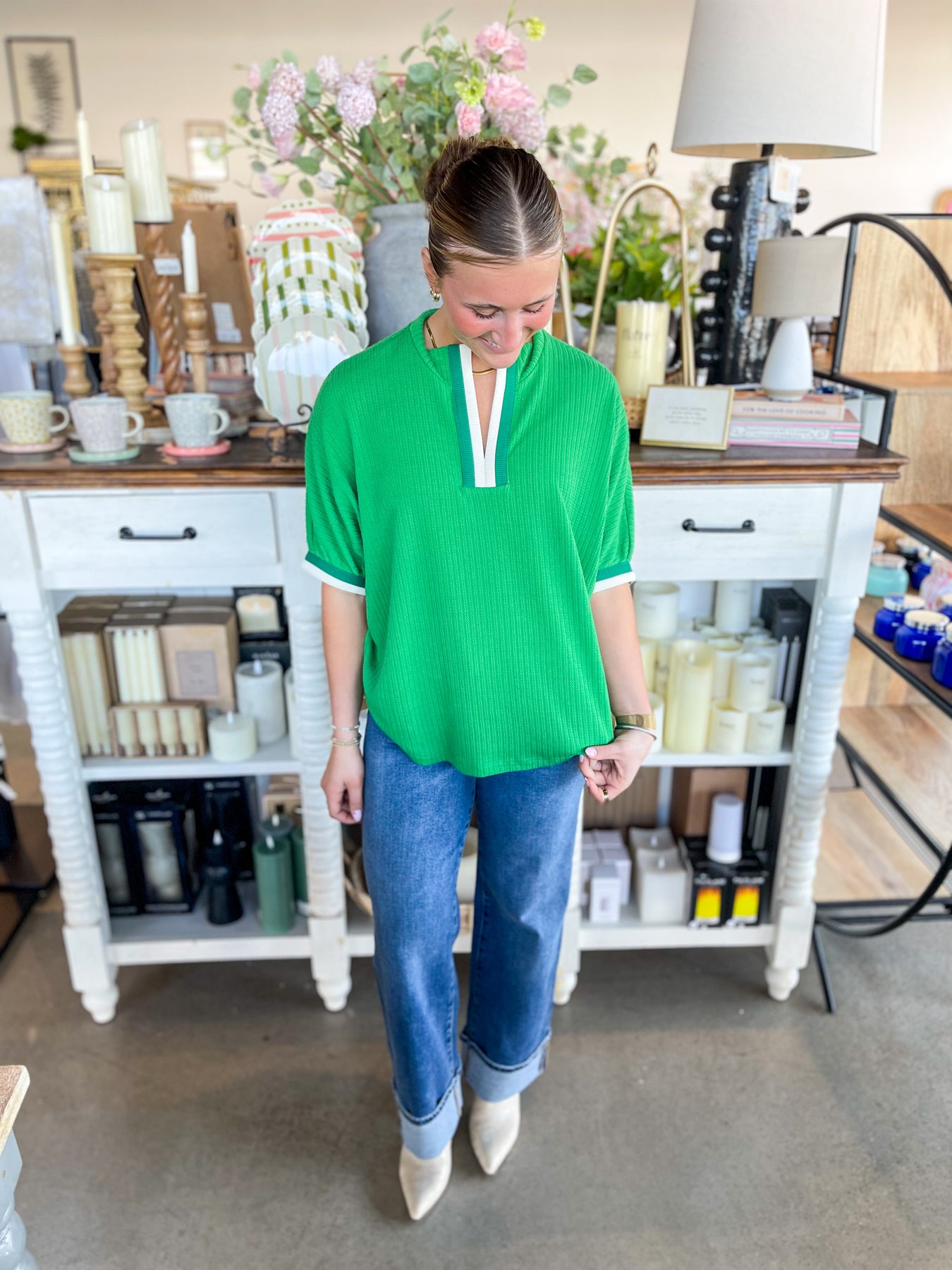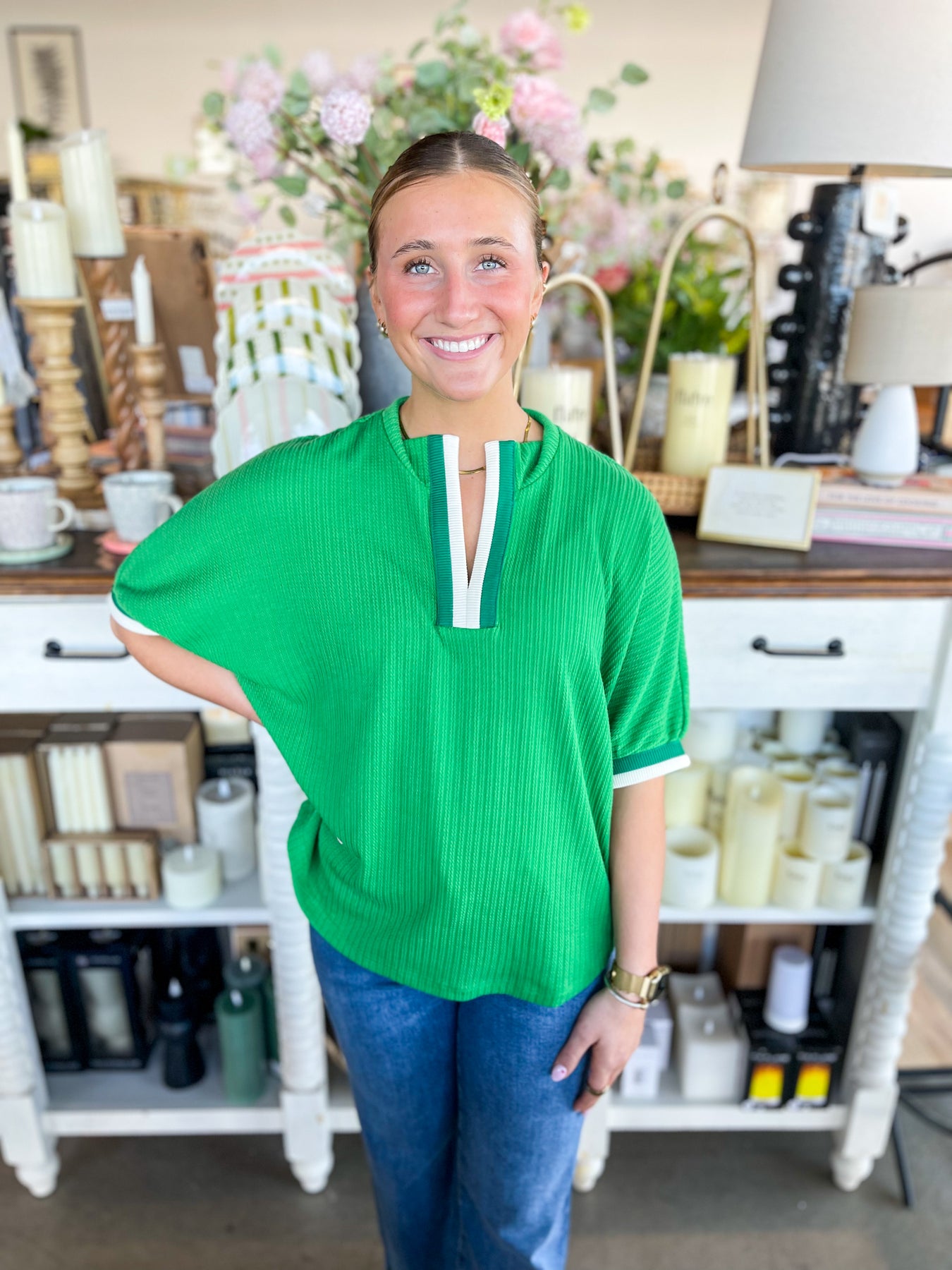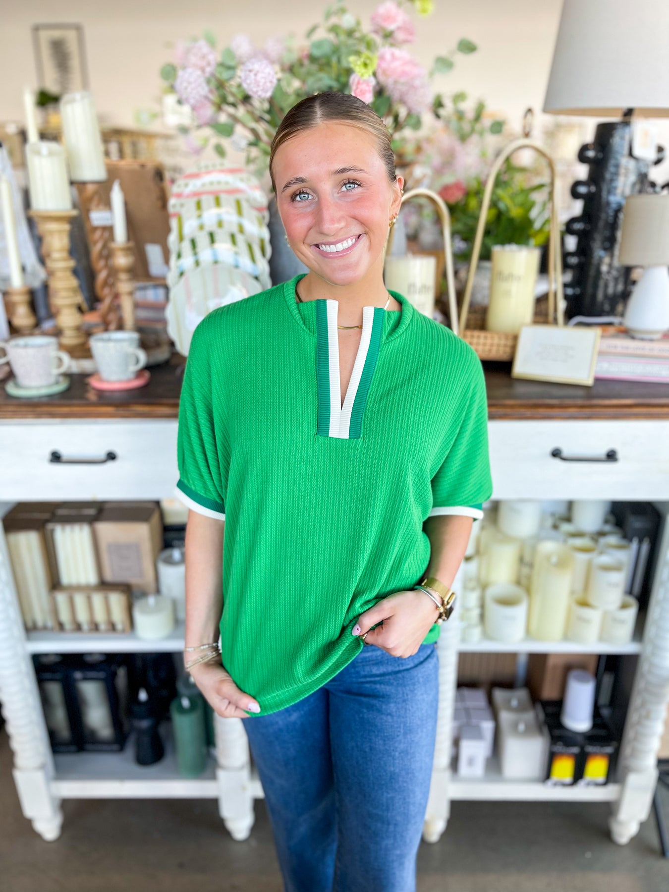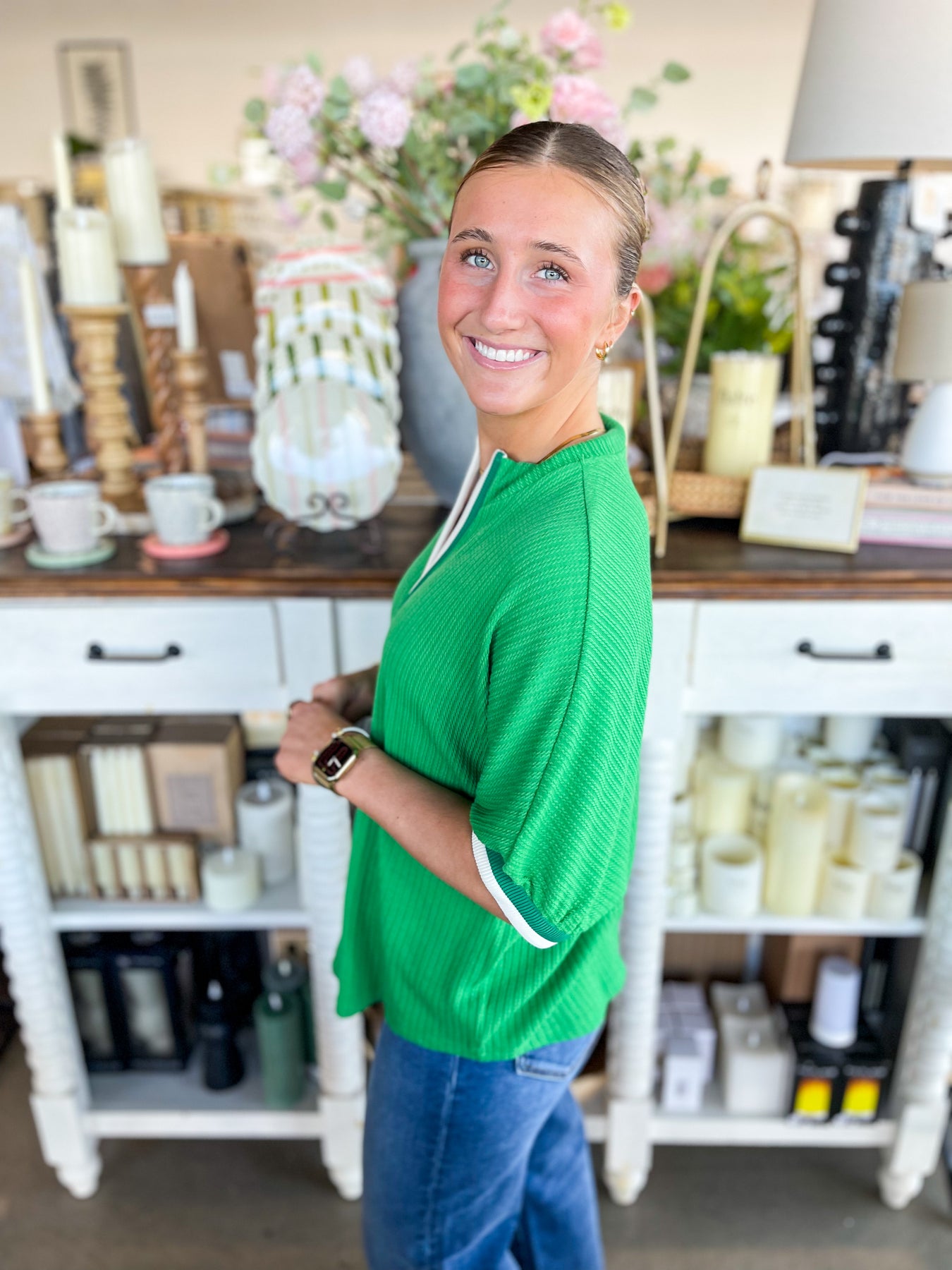 Introducing the Umgee Green Abigail Top—your new vacation and spring essential that screams effortless elegance. This stunning piece features a textured fabric that catches the light beautifully, paired with a chic varsity neckline that adds instant personality. The white and green contrast lining peeks through for a playful pop of color that elevates the whole vibe. Dressy enough for dinner dates and casual enough for daytime adventures, this top is your secret weapon for looking polished without trying too hard. Pack it, wear it, love it—this is the piece that makes every outfit feel special.