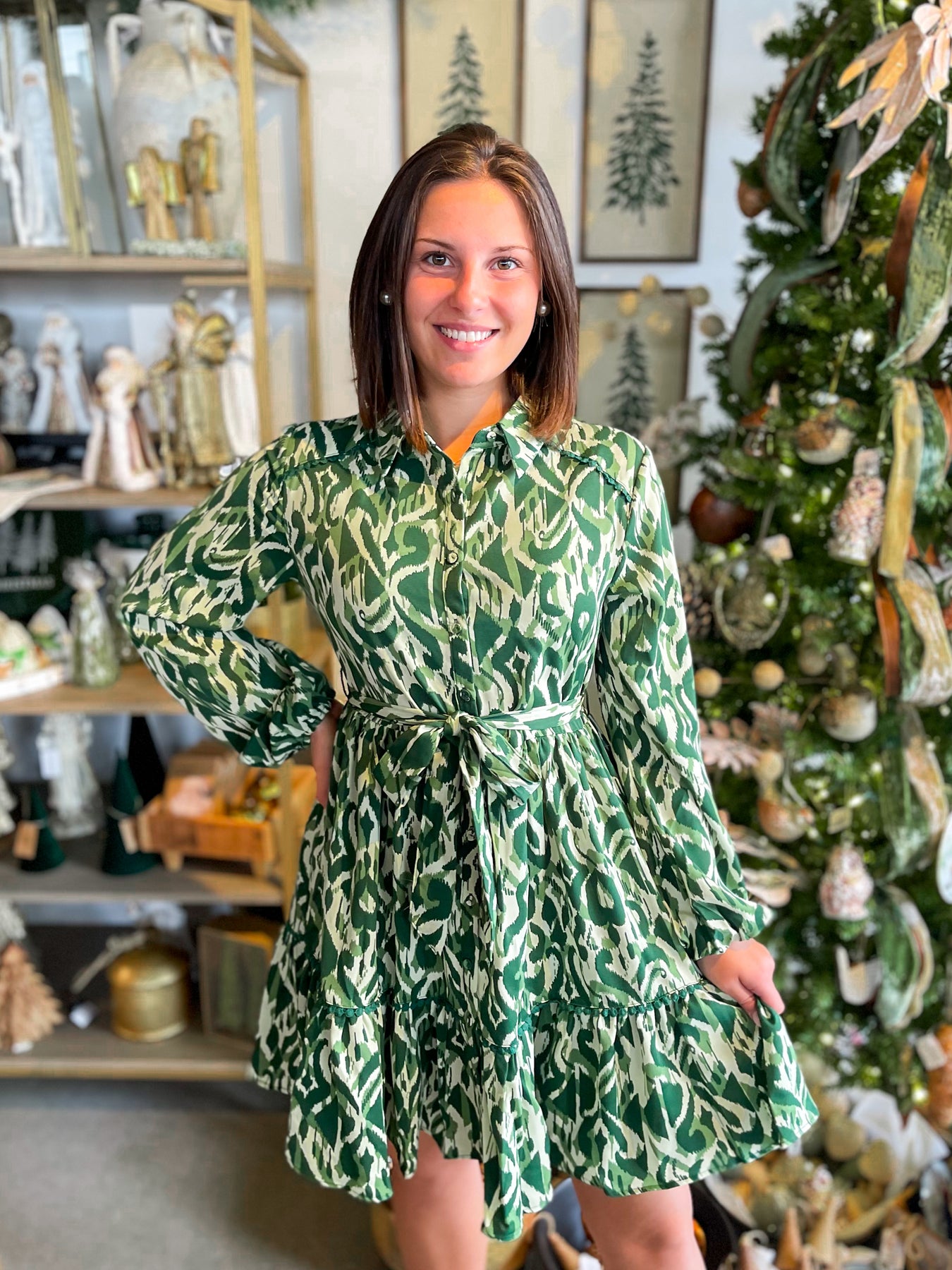 The Umgee Green Callie Dress brings botanical beauty to your fall and winter rotation. This stunning green and white floral design feels fresh yet cozy, perfect for layering through the cooler months. A flattering tie waist cinches your silhouette beautifully, while a subtle collar detail adds refined charm. Long sleeves with elastic cuffs keep things comfortable and on-trend, and delicate eyelet detailing along the hem brings an extra touch of sophistication. Trendy, stylish, and endlessly versatile—this dress is the kind of piece you'll reach for again and again.