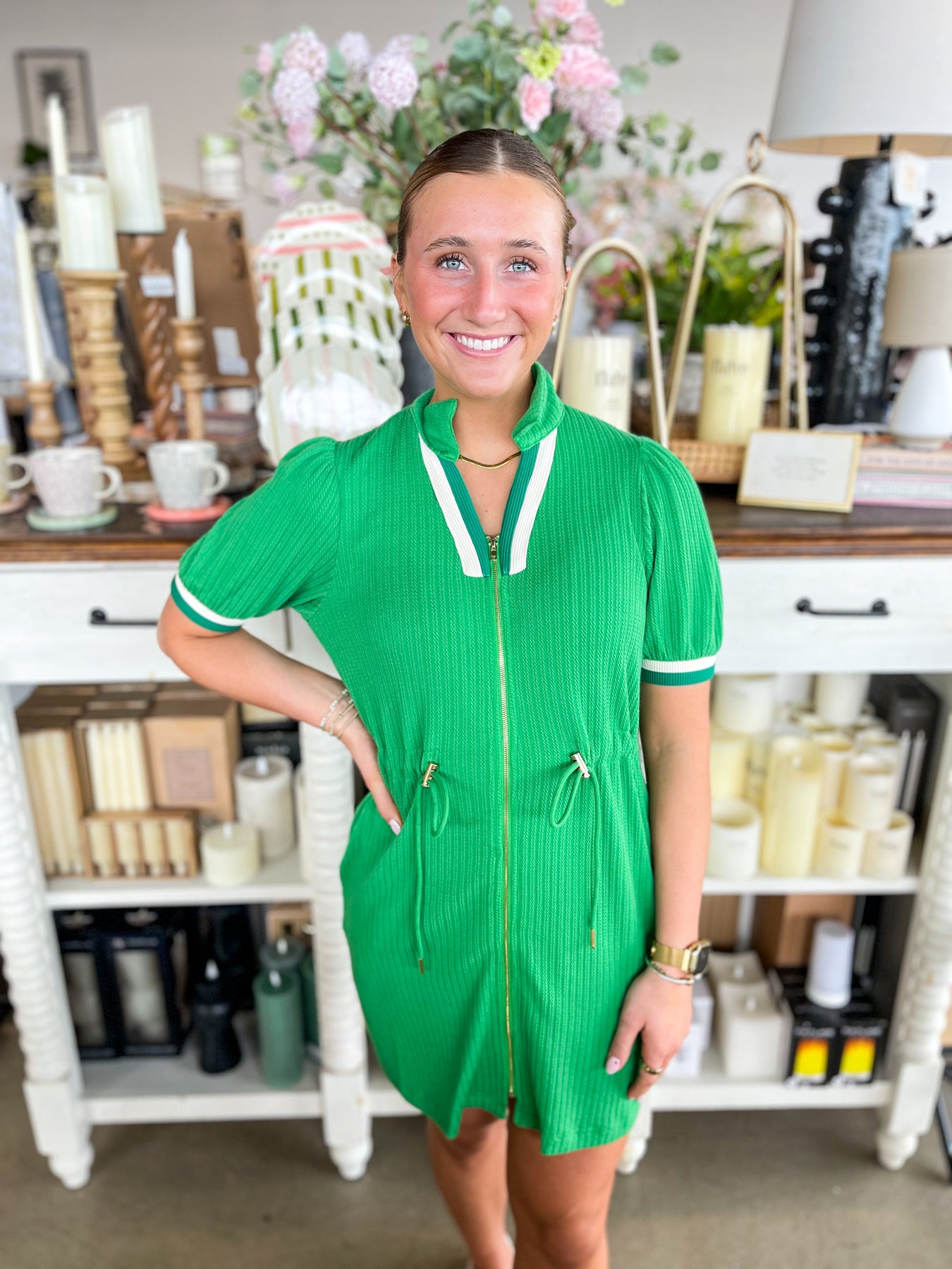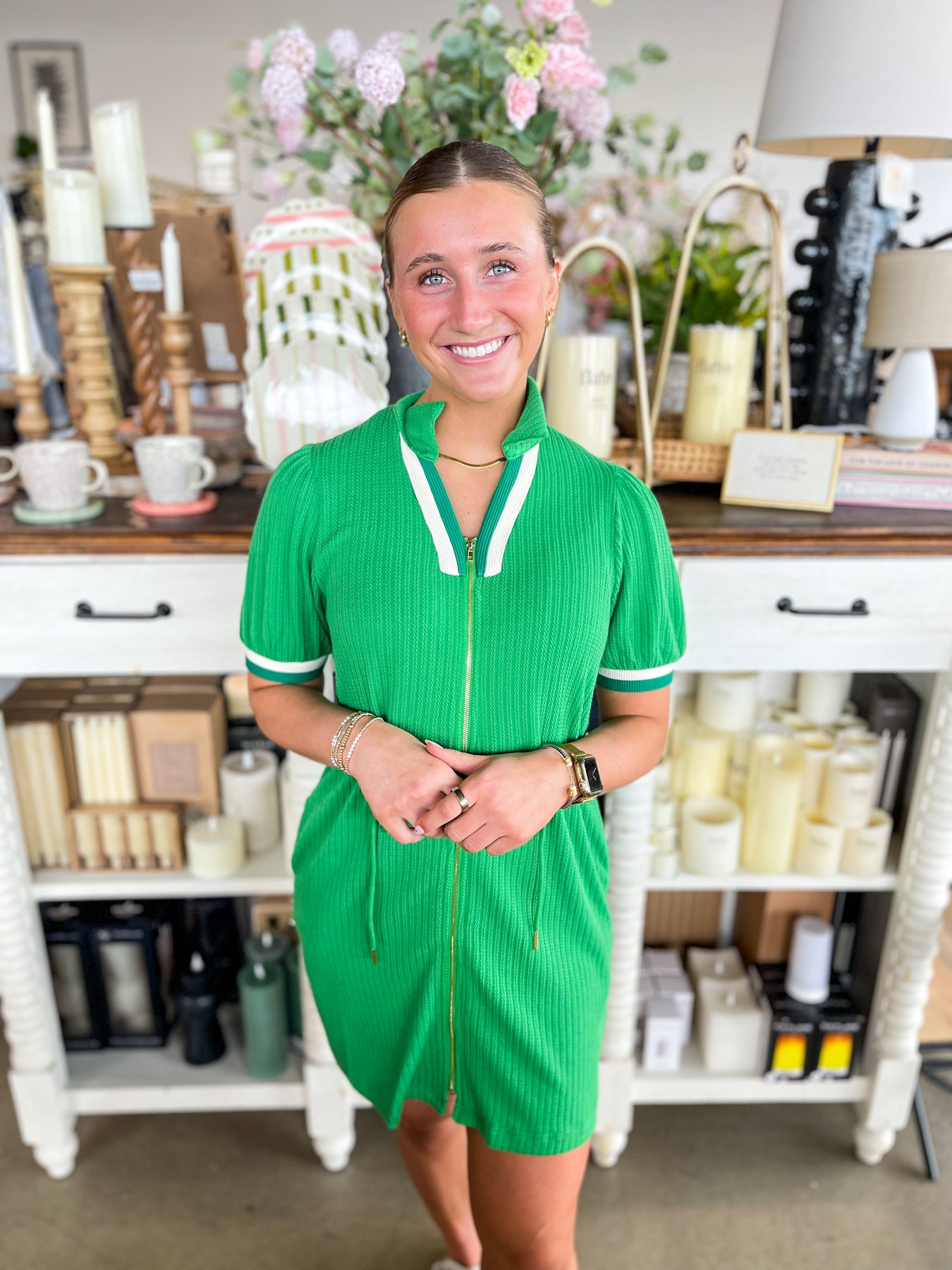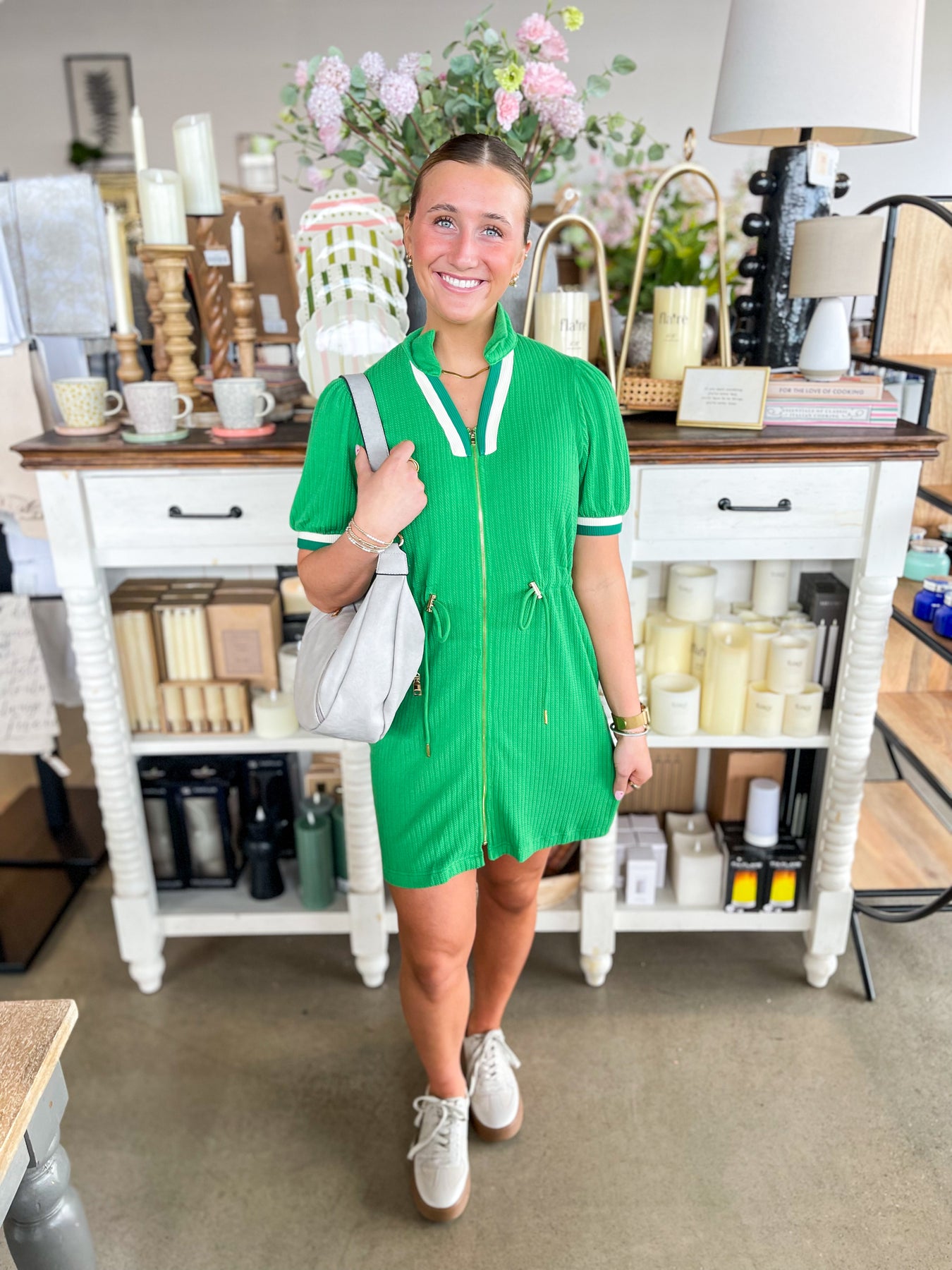 Say hello to the Umgee Green Stella Dress—a stunning piece that proves green is always a good idea. This trendy, stylish dress features a soft, stretchy knit texture that feels as good as it looks, moving with your body for all-day comfort. The eye-catching white contrast at the neckline adds visual interest, while the functional zipper makes getting dressed a breeze. A clever scrunch detail at the waistband cinches you in all the right places, creating a flattering silhouette that works for any occasion. From casual outings to special moments, this dress is your go-to for looking effortlessly fabulous.