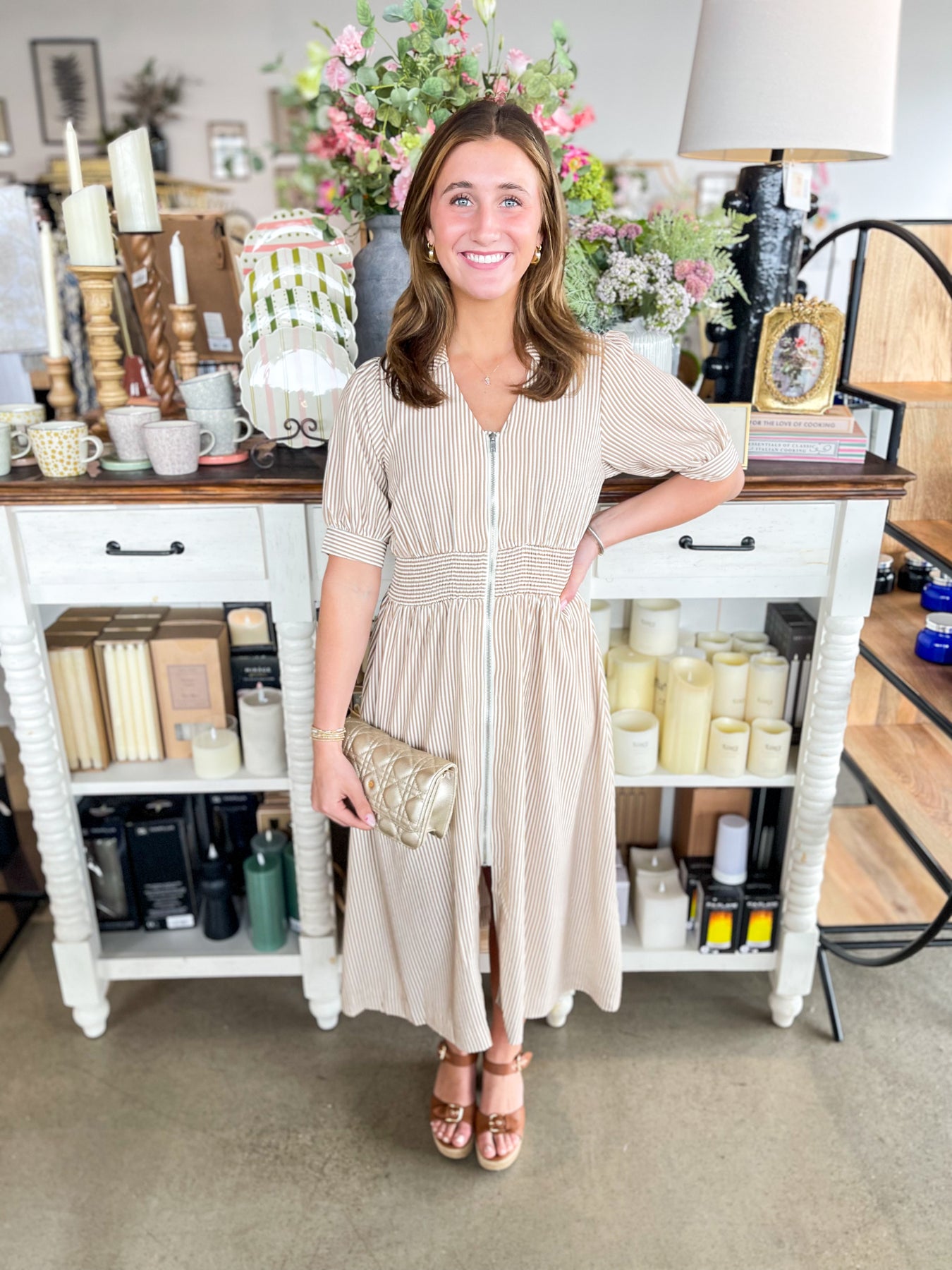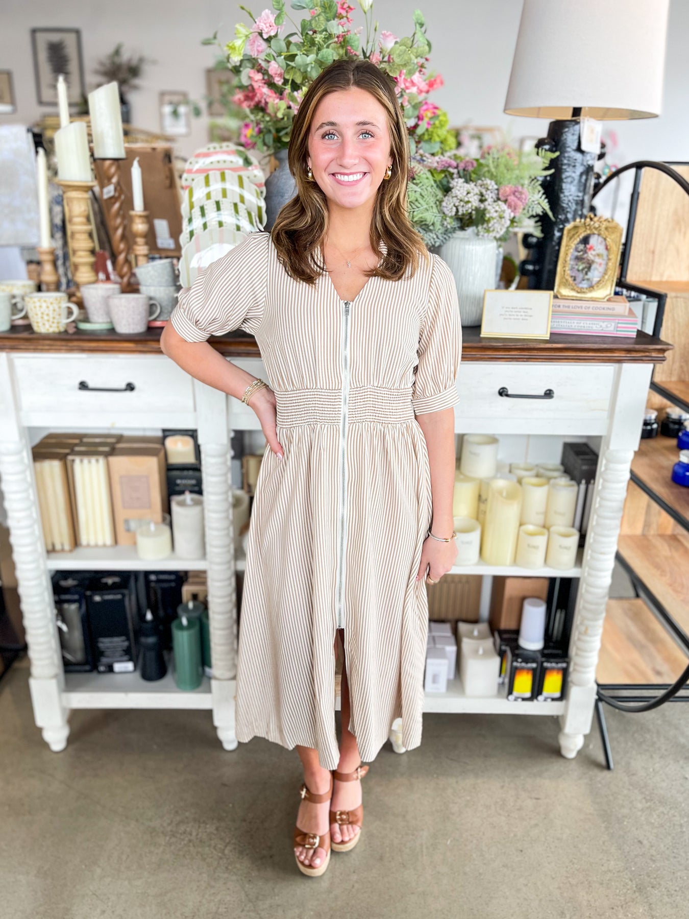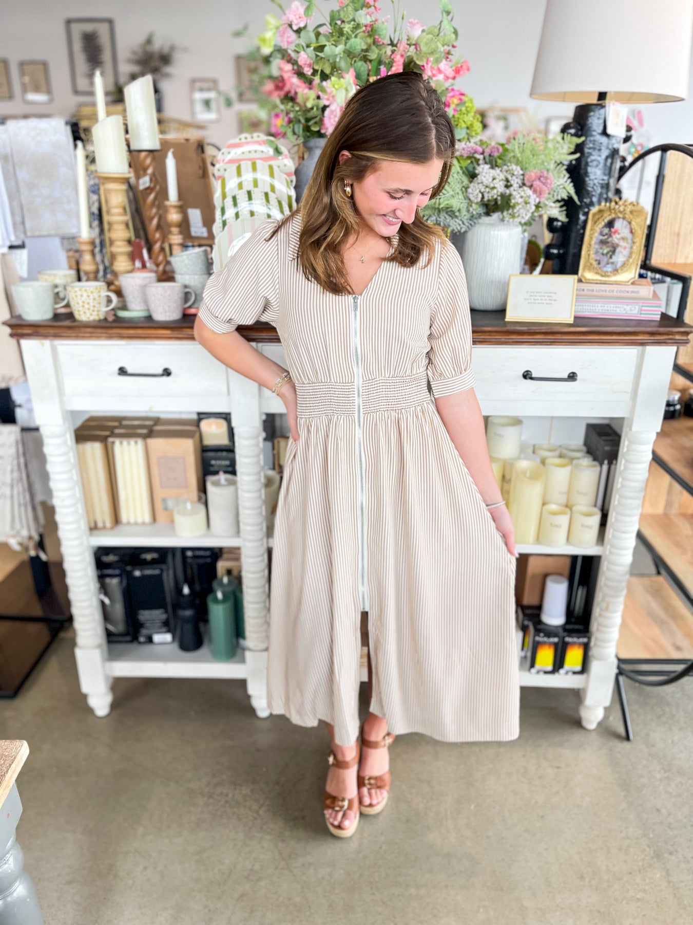 Slip into effortless elegance with this stunning Umgee midi dress that's about to become your spring staple. The chic nude and white palette pairs beautifully with a charming collar detail that adds polish and personality. A full-length zipper down the front makes dressing a breeze, while the smocked waistband creates a flattering silhouette that's both comfortable and on-trend. Lightweight and versatile, this beauty works from day to night with playful, understated style.