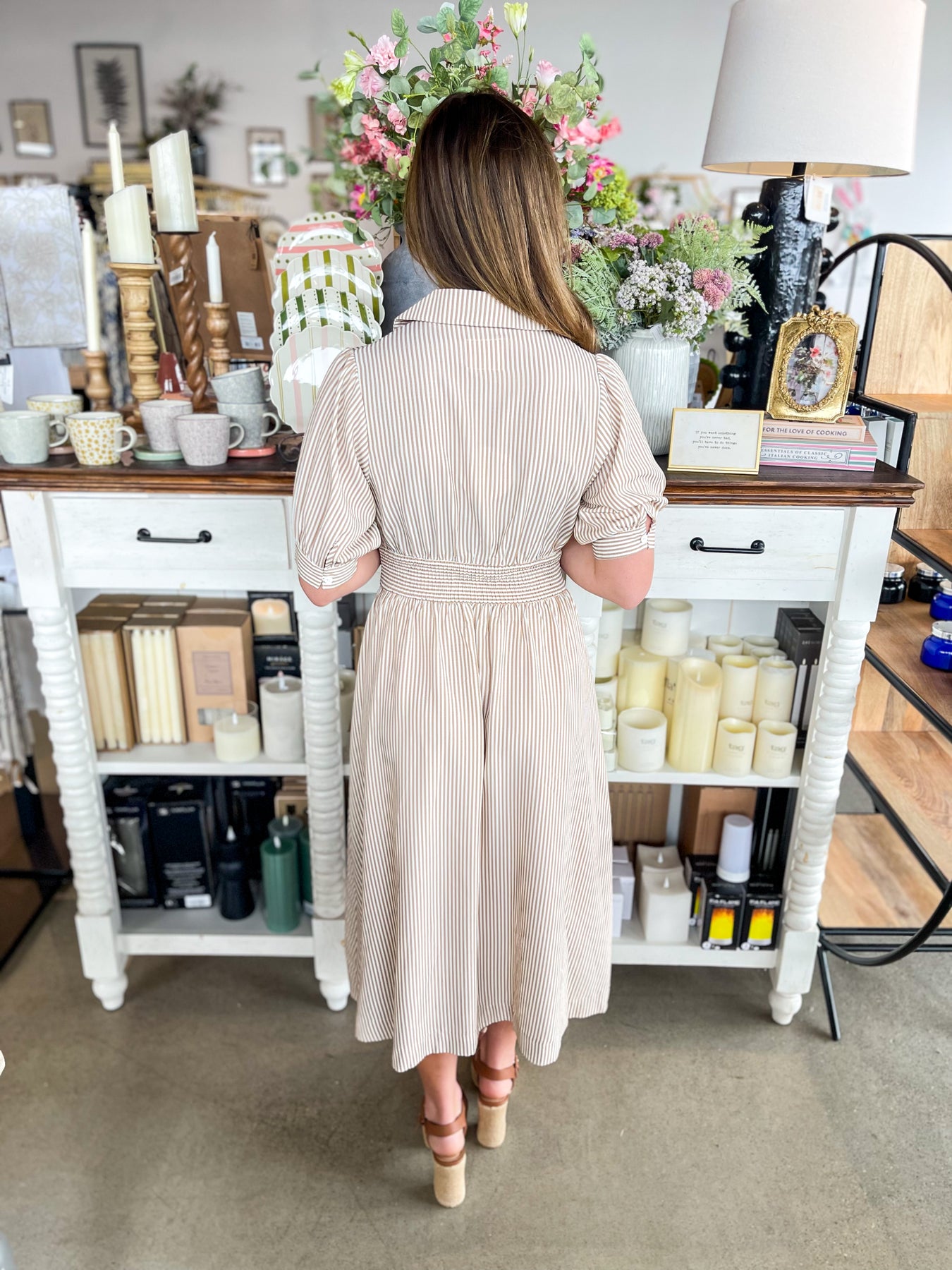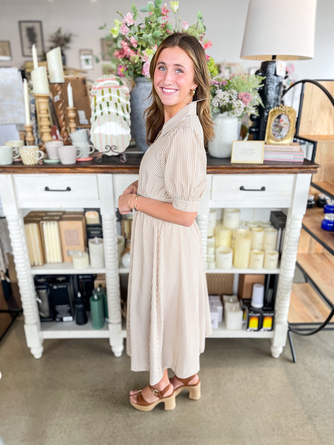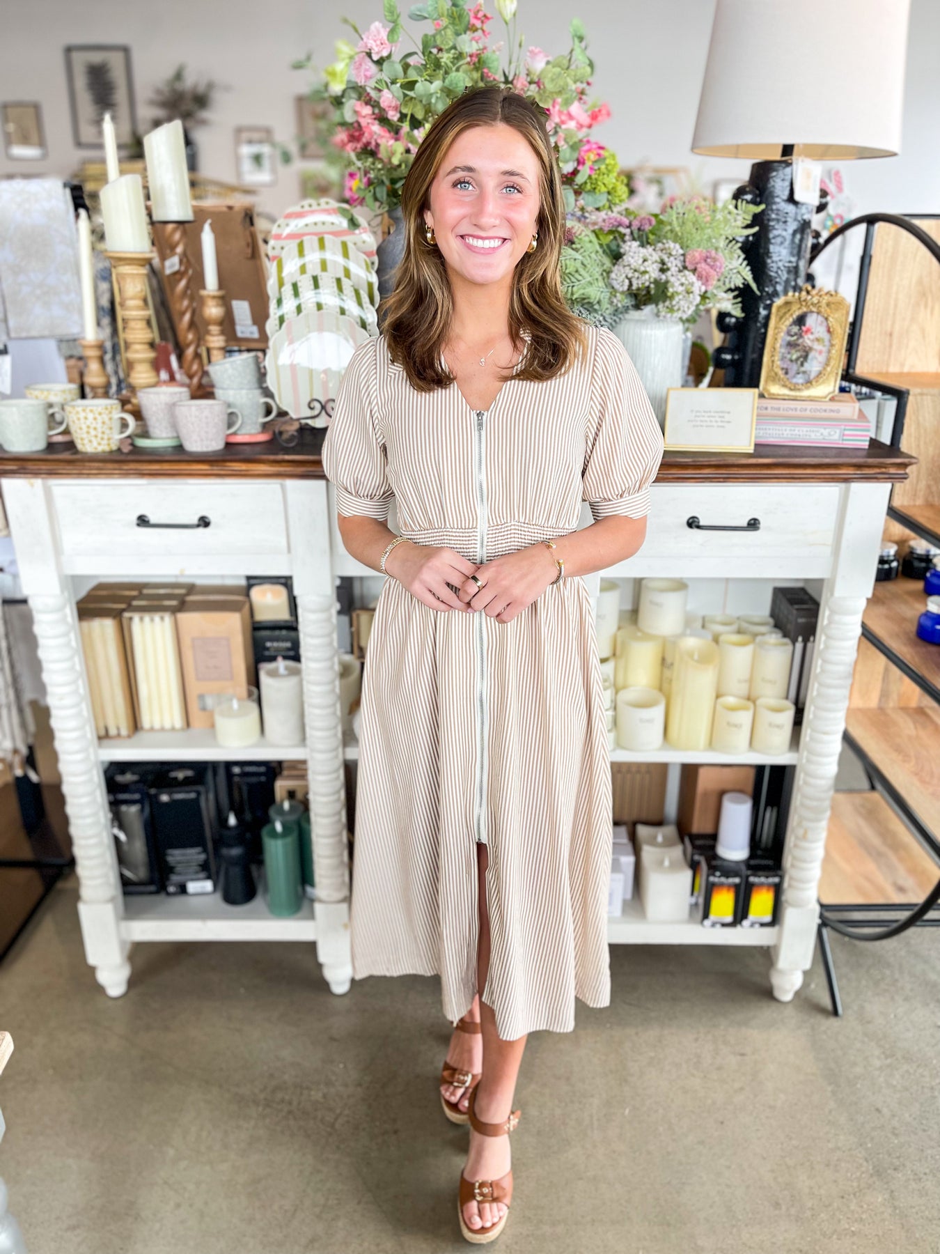 Slip into effortless elegance with this stunning Umgee midi dress that's about to become your spring staple. The chic nude and white palette pairs beautifully with a charming collar detail that adds polish and personality. A full-length zipper down the front makes dressing a breeze, while the smocked waistband creates a flattering silhouette that's both comfortable and on-trend. Lightweight and versatile, this beauty works from day to night with playful, understated style.