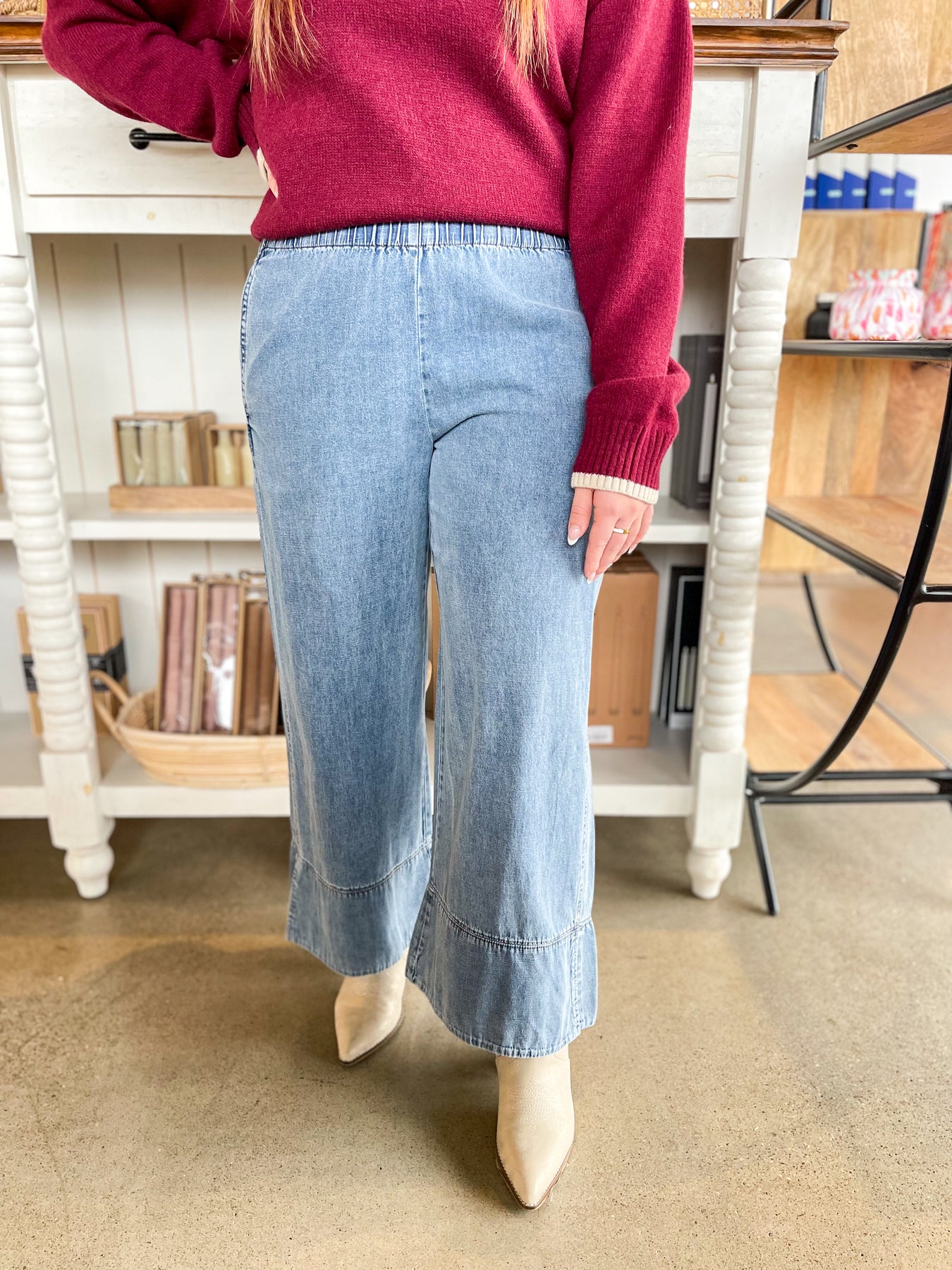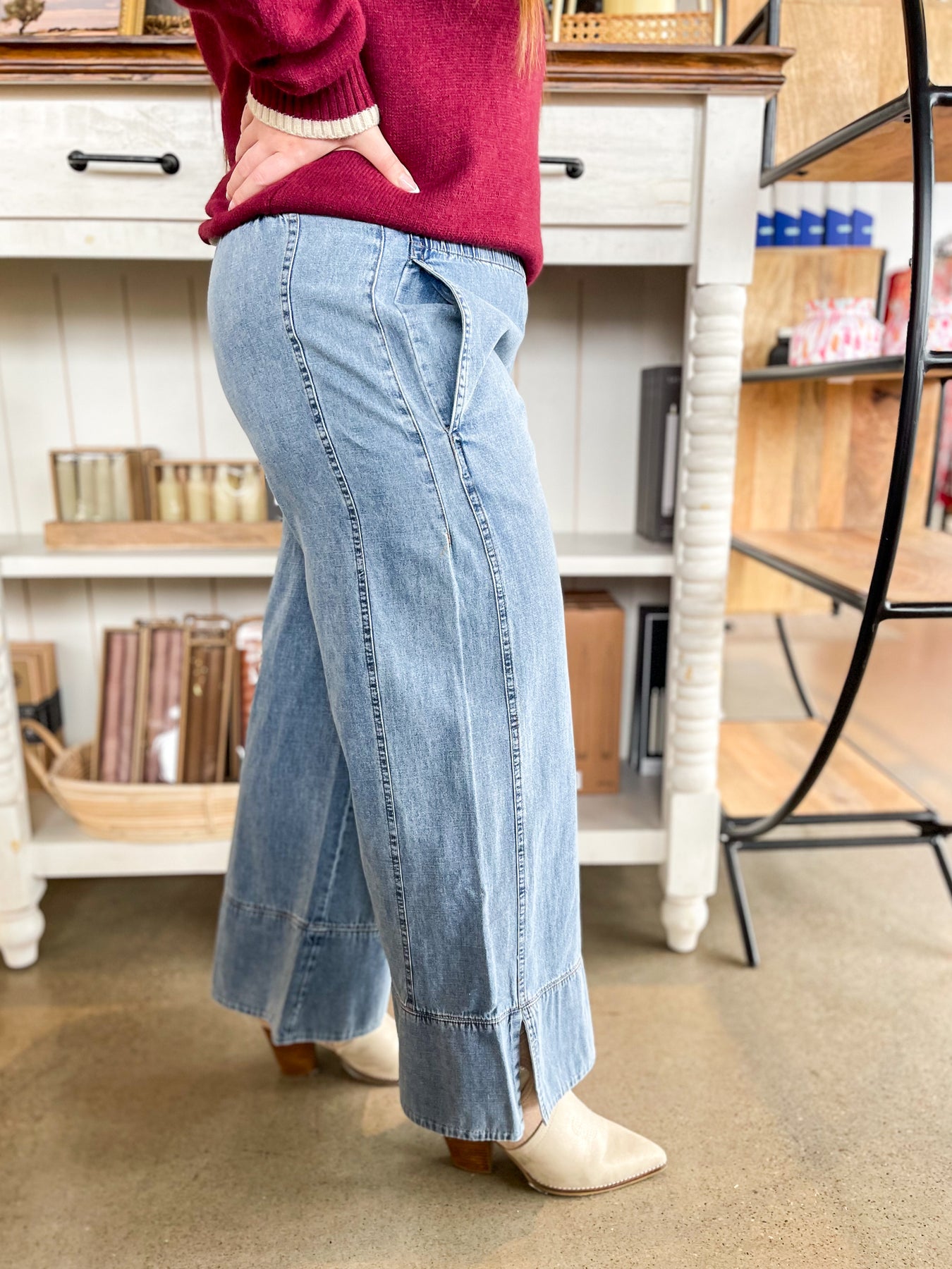 Say hello to effortless style! These light denim Jara pants feature a loose, flowy silhouette that moves with you throughout the day. The elastic waistband keeps things comfortable while the slightly cropped length hits just right. Practical side pockets mean you've actually got somewhere to stash your essentials, and the subtle side slit adds a trendy touch. Whether you're running errands or meeting friends, these pants deliver that laid-back, put-together vibe every single time.