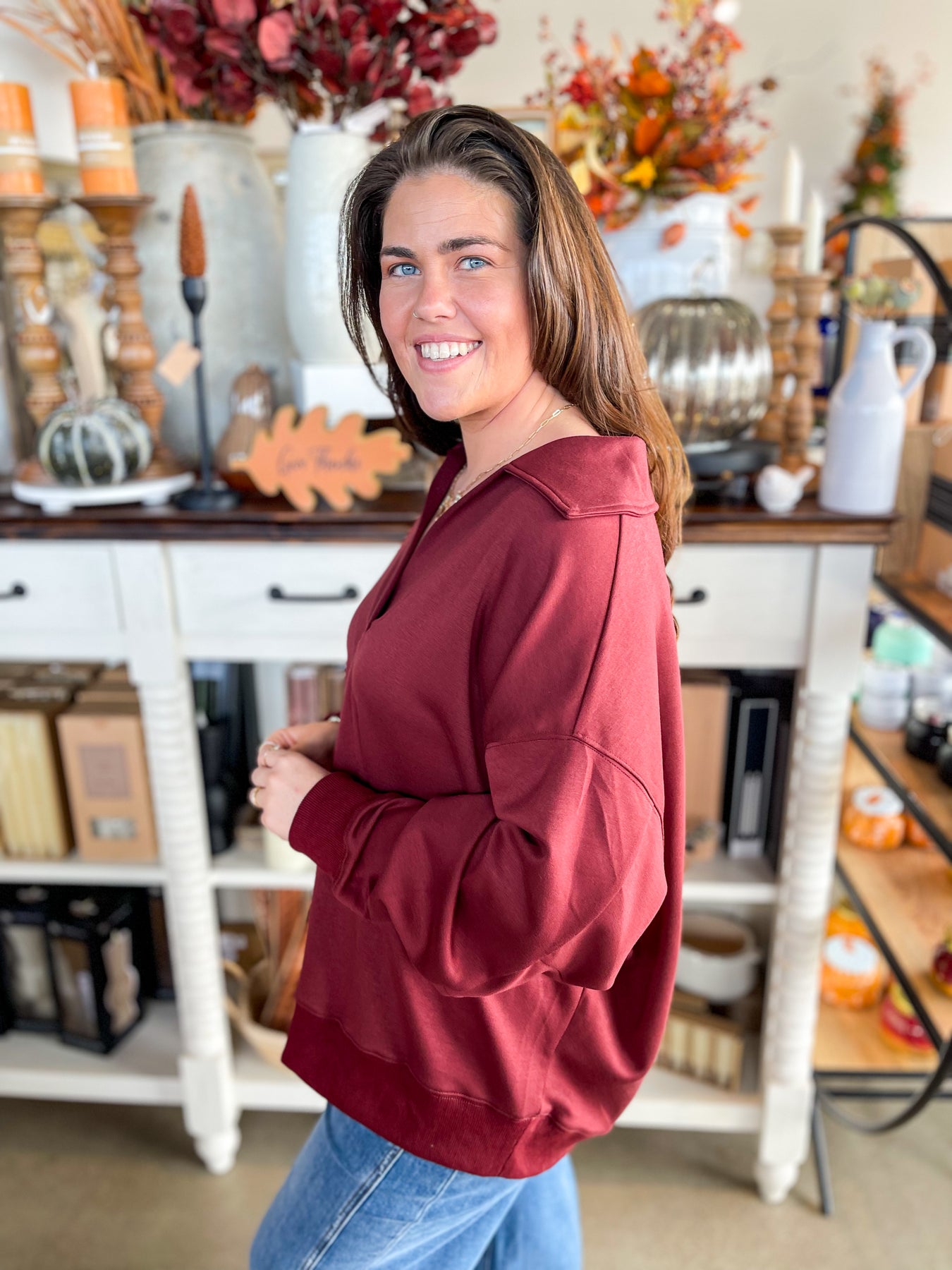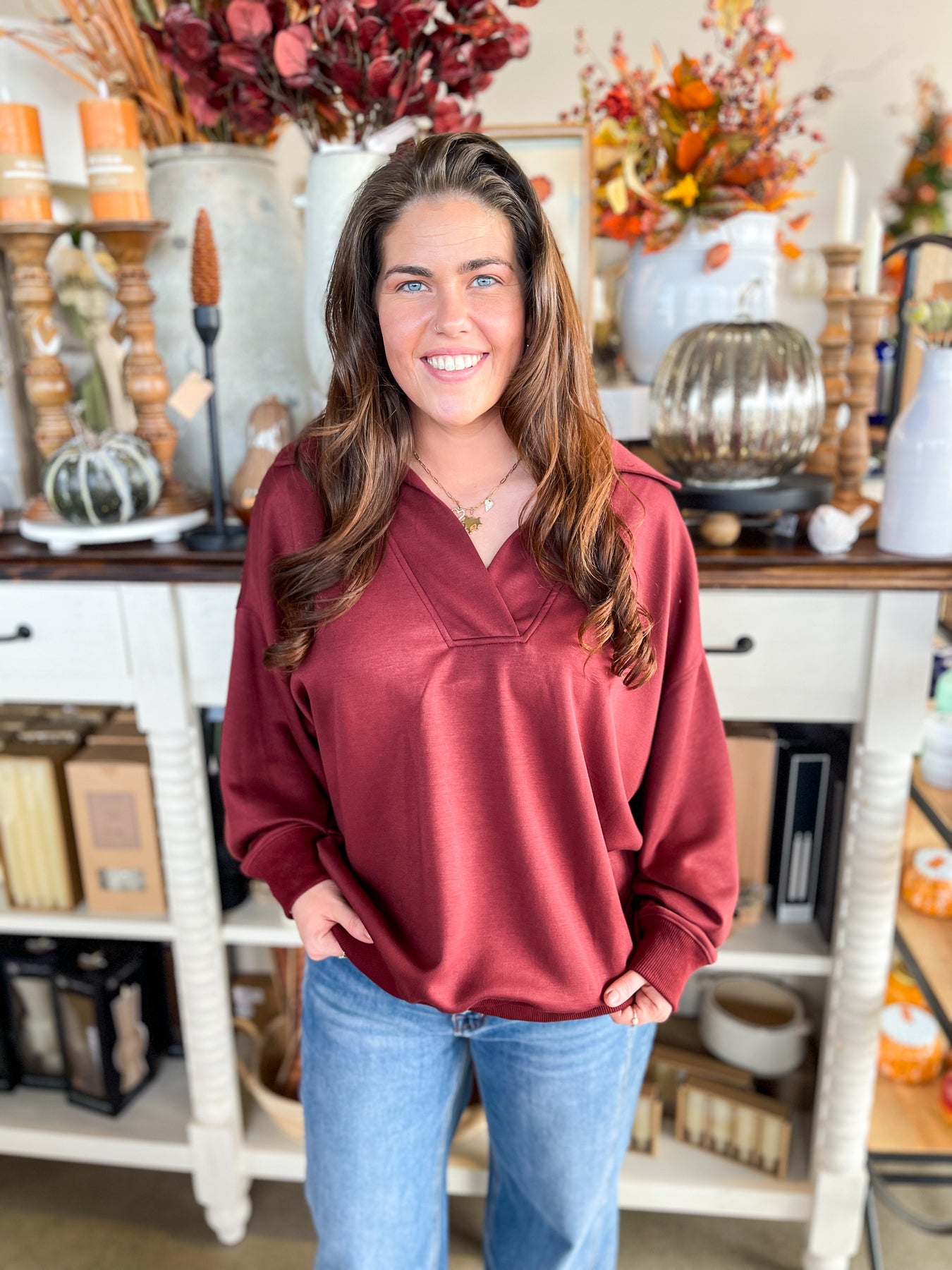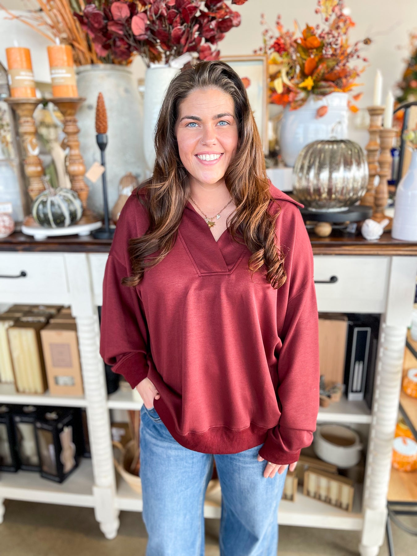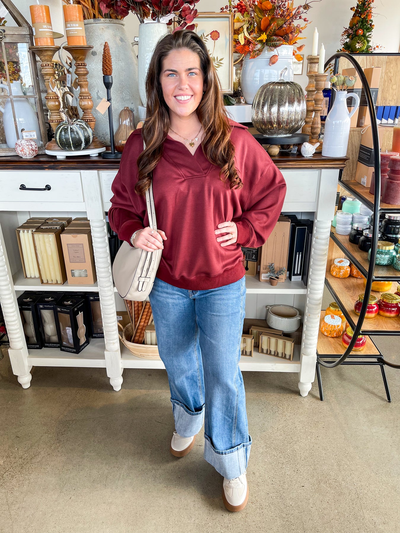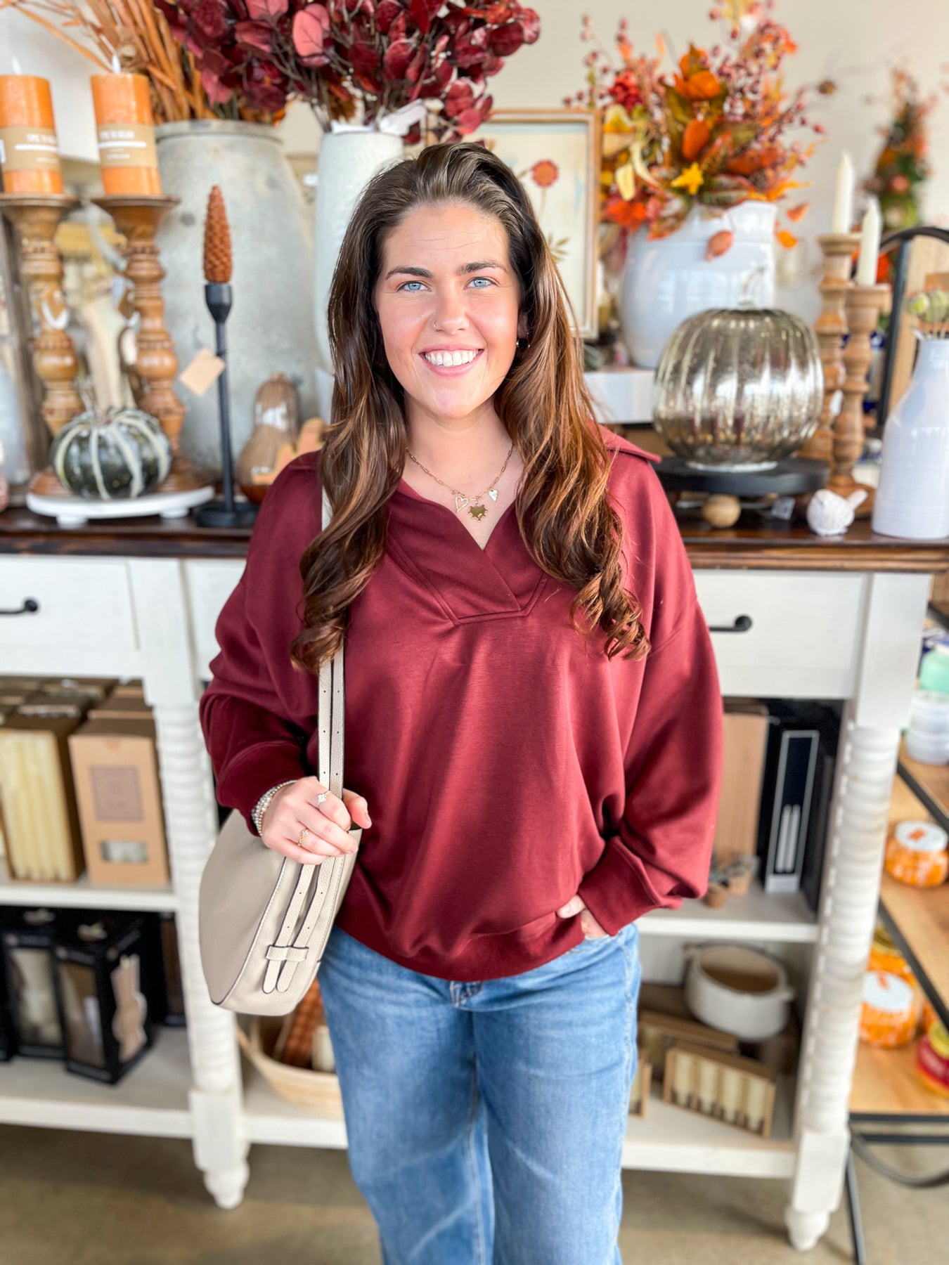 The Umgee Marsala Willow Pullover is your new fall obsession. Stunning red color that is super soft and slouchy, it’s designed for ultimate comfort with a loose fit that feels like a cozy hug. The collared detail and v-neckline add a stylish twist to this stunning piece, making it perfect for layering or wearing on its own. Embrace the season in this effortlessly chic go-to!