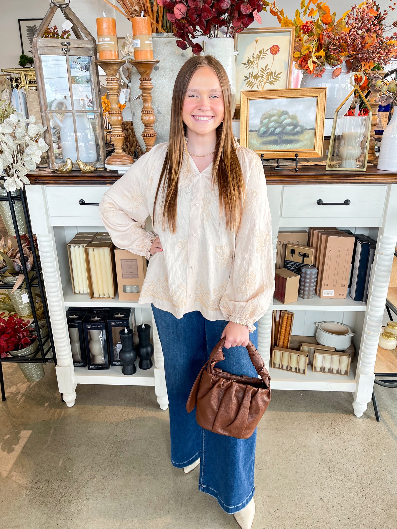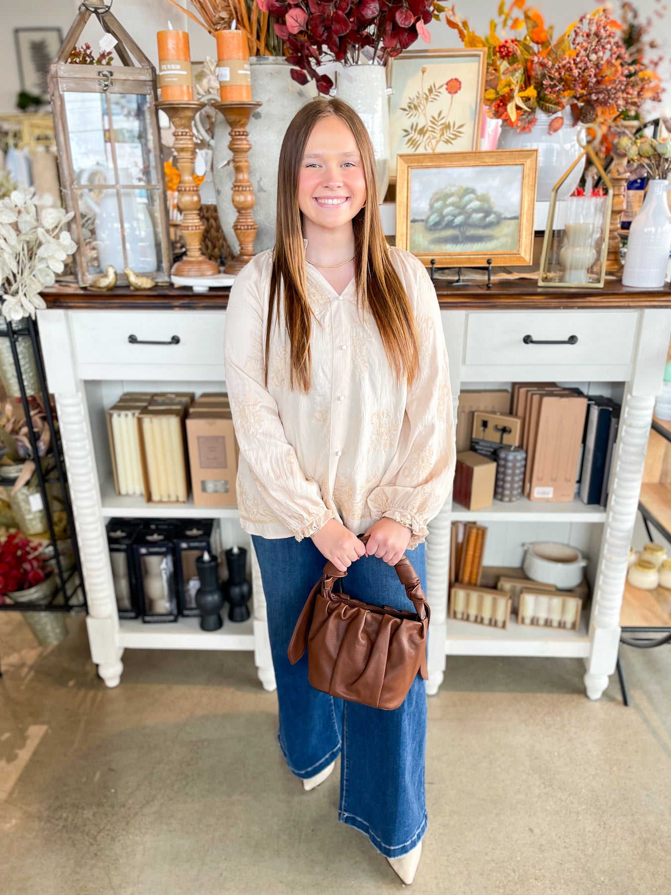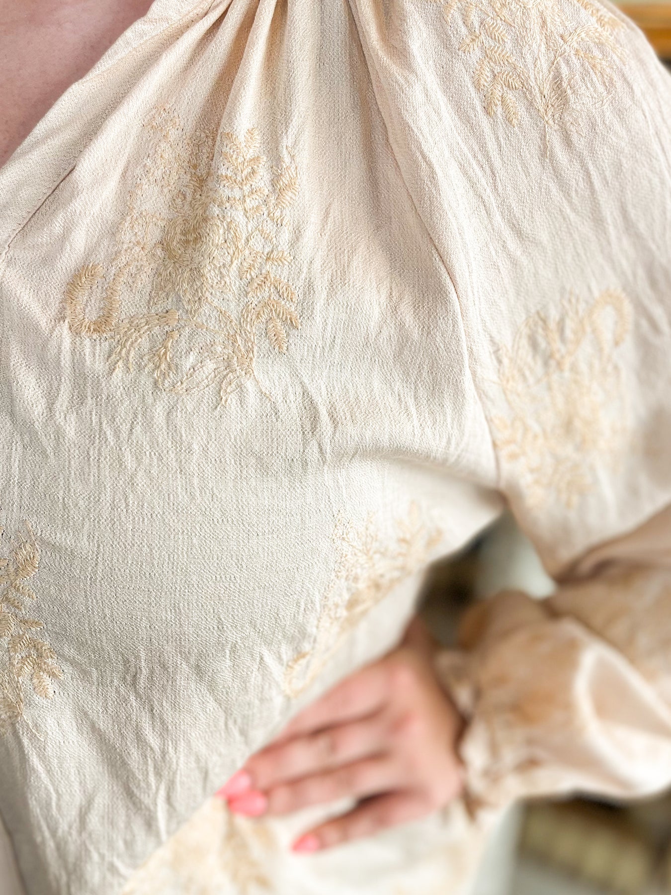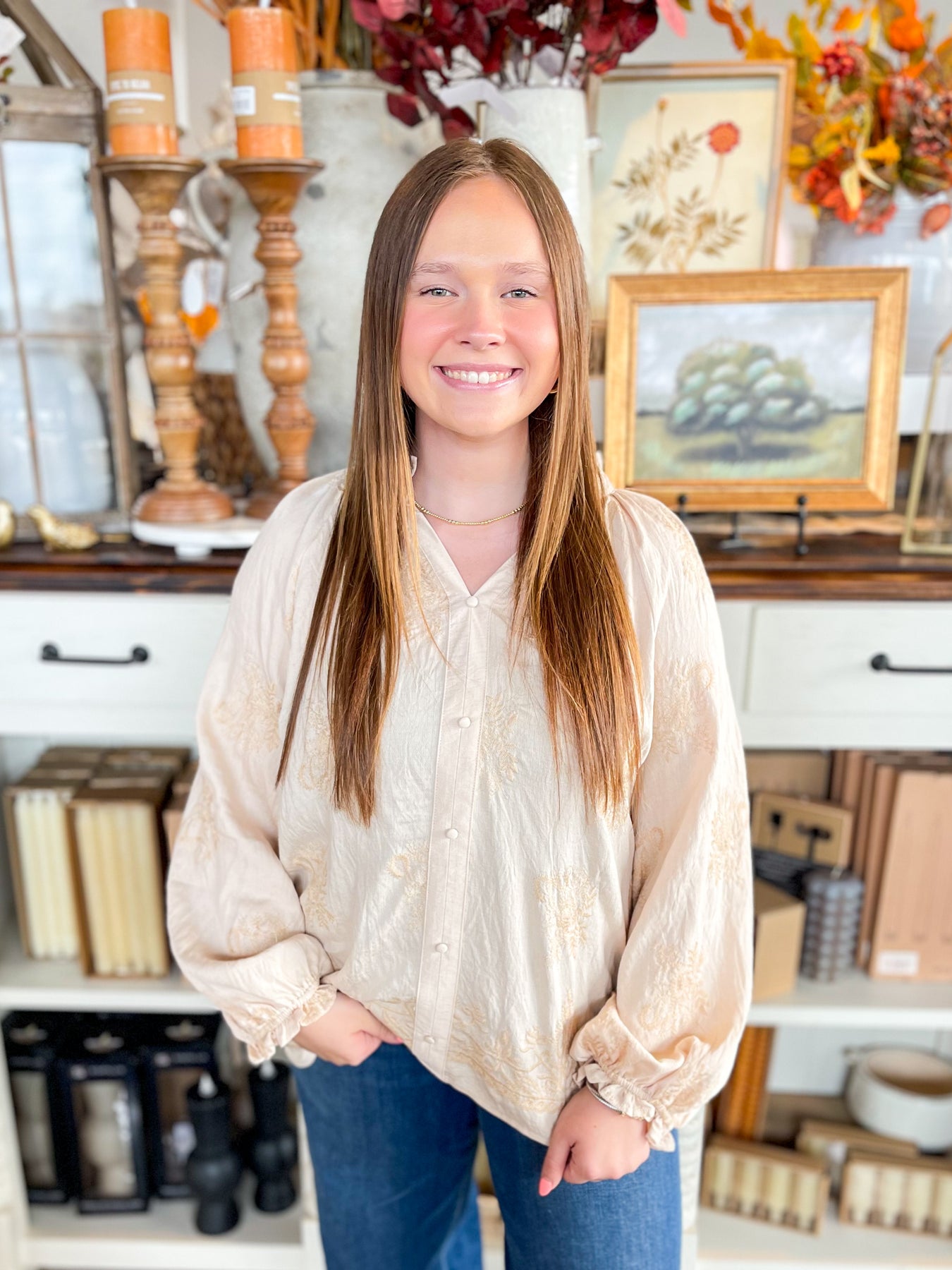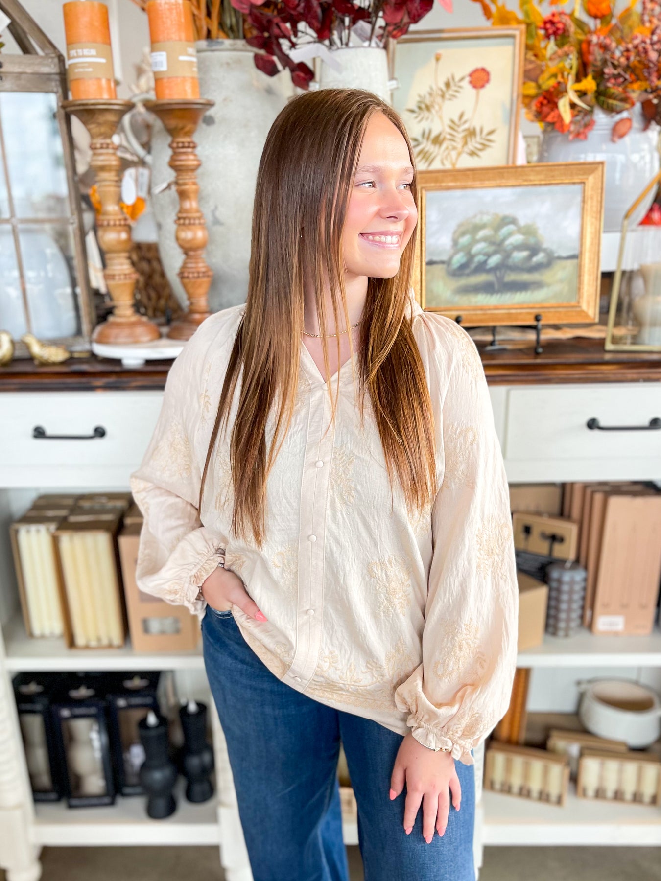This stunning cream blouse is your go-to for fall, featuring delicate embroidered floral textures that add a touch of whimsy. The flattering v-neck and button accents bring classic charm, while elastic sleeves with playful ruffles keep things trendy and comfy. Perfect for layering or wearing on its own, it’s a stylish pick for crisp autumn days.