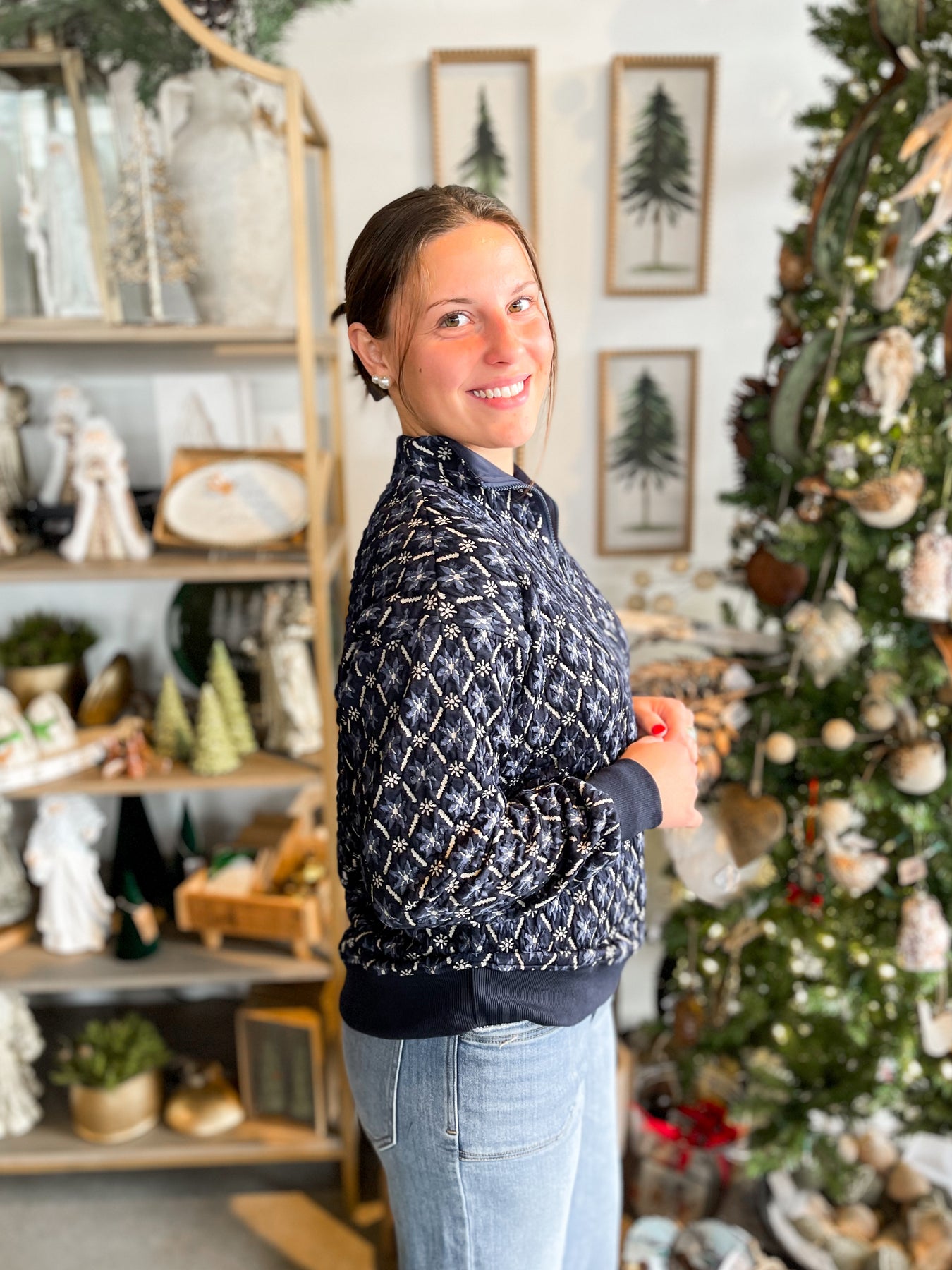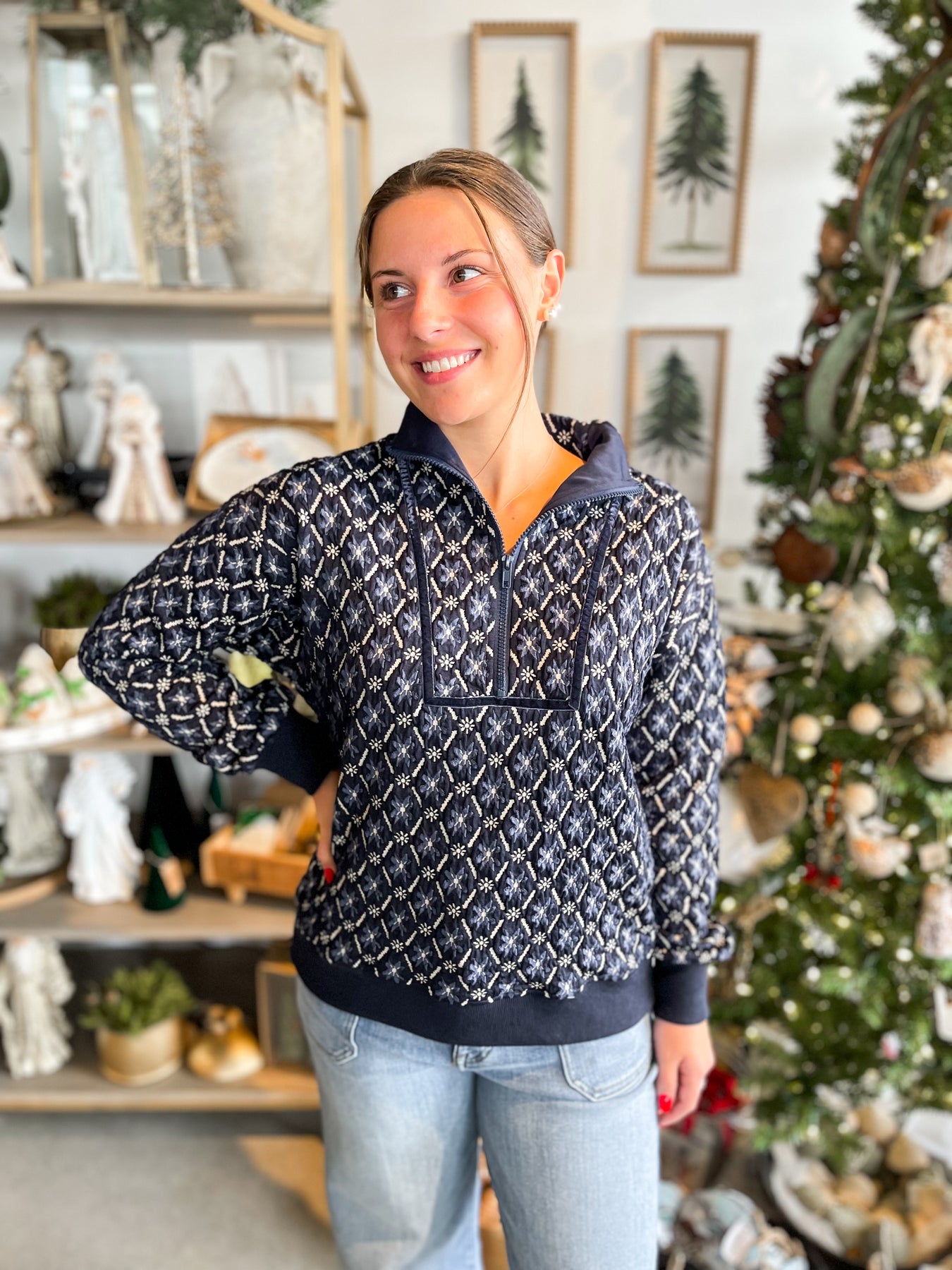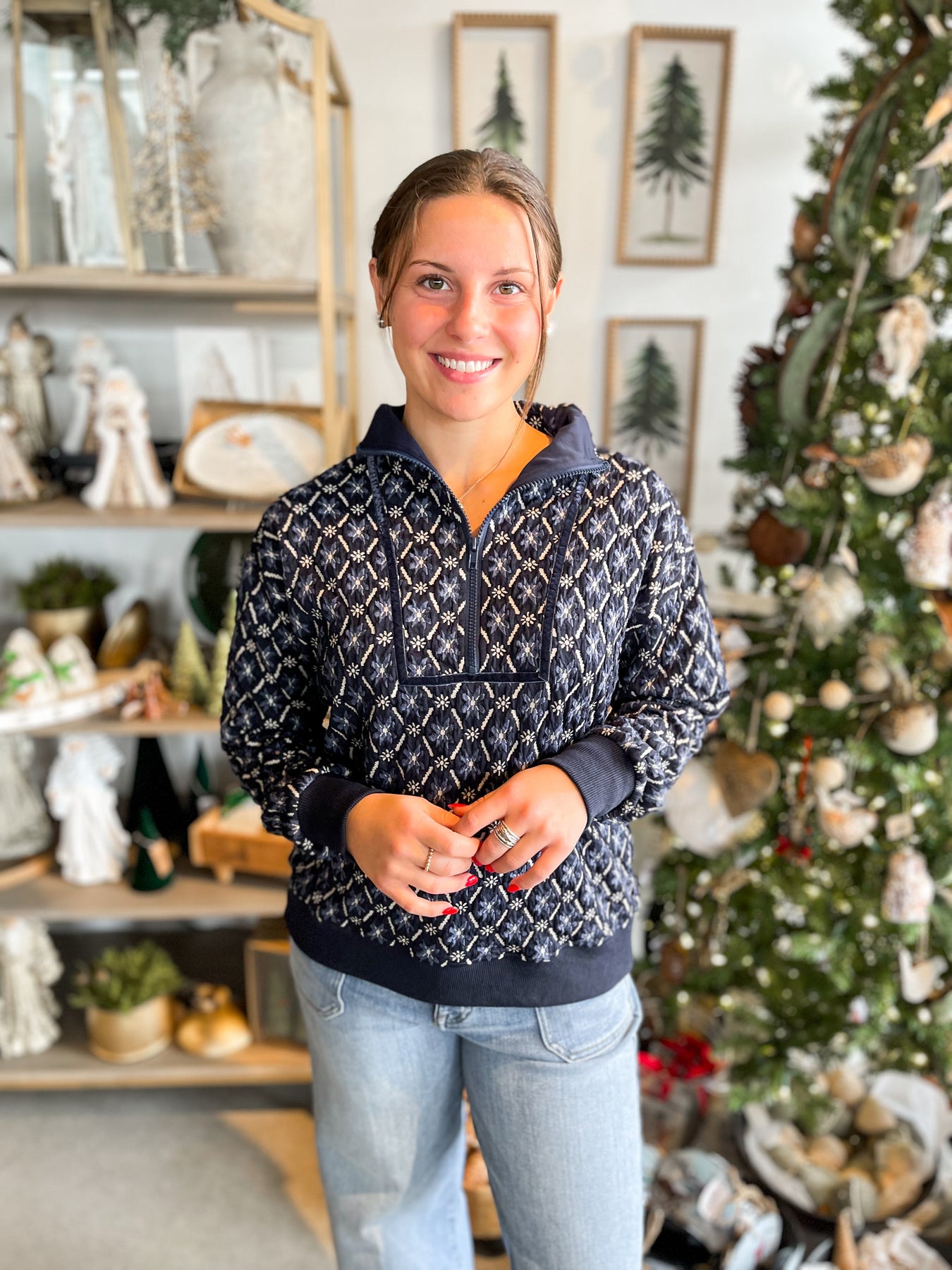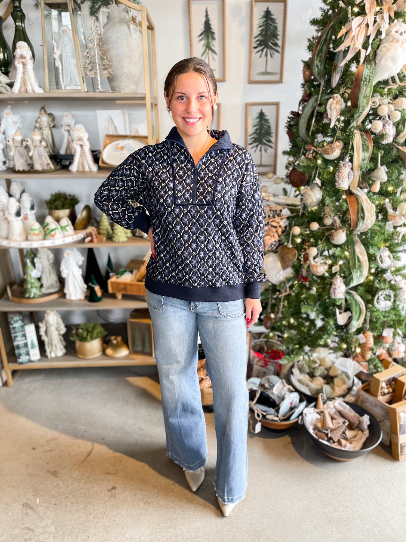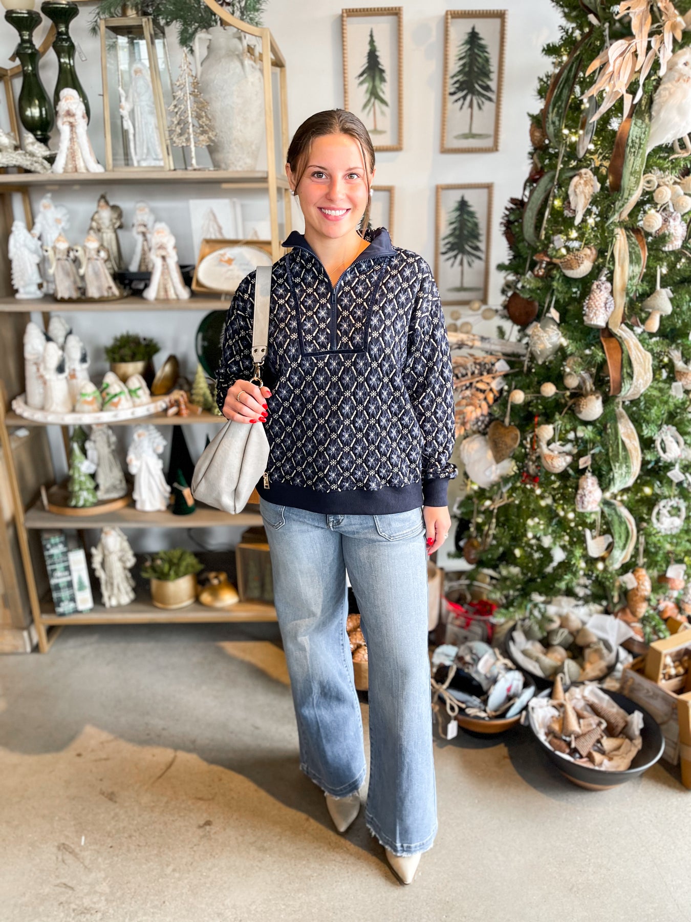 Introducing the Umgee Navy Kylie Top—a stunning pullover that's bursting with charm! This playful piece showcases a gorgeous navy and white floral design that's sure to turn heads. Crafted from super soft fabric with luxe navy velvet lining, it feels as amazing as it looks. Long sleeves and a classic collar provide timeless appeal, while the sleek metal zipper adds a modern touch. The beautiful color and texture combination makes this top an instant wardrobe essential that works for any occasion.