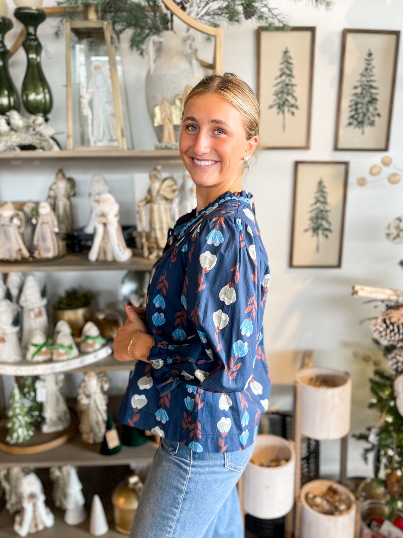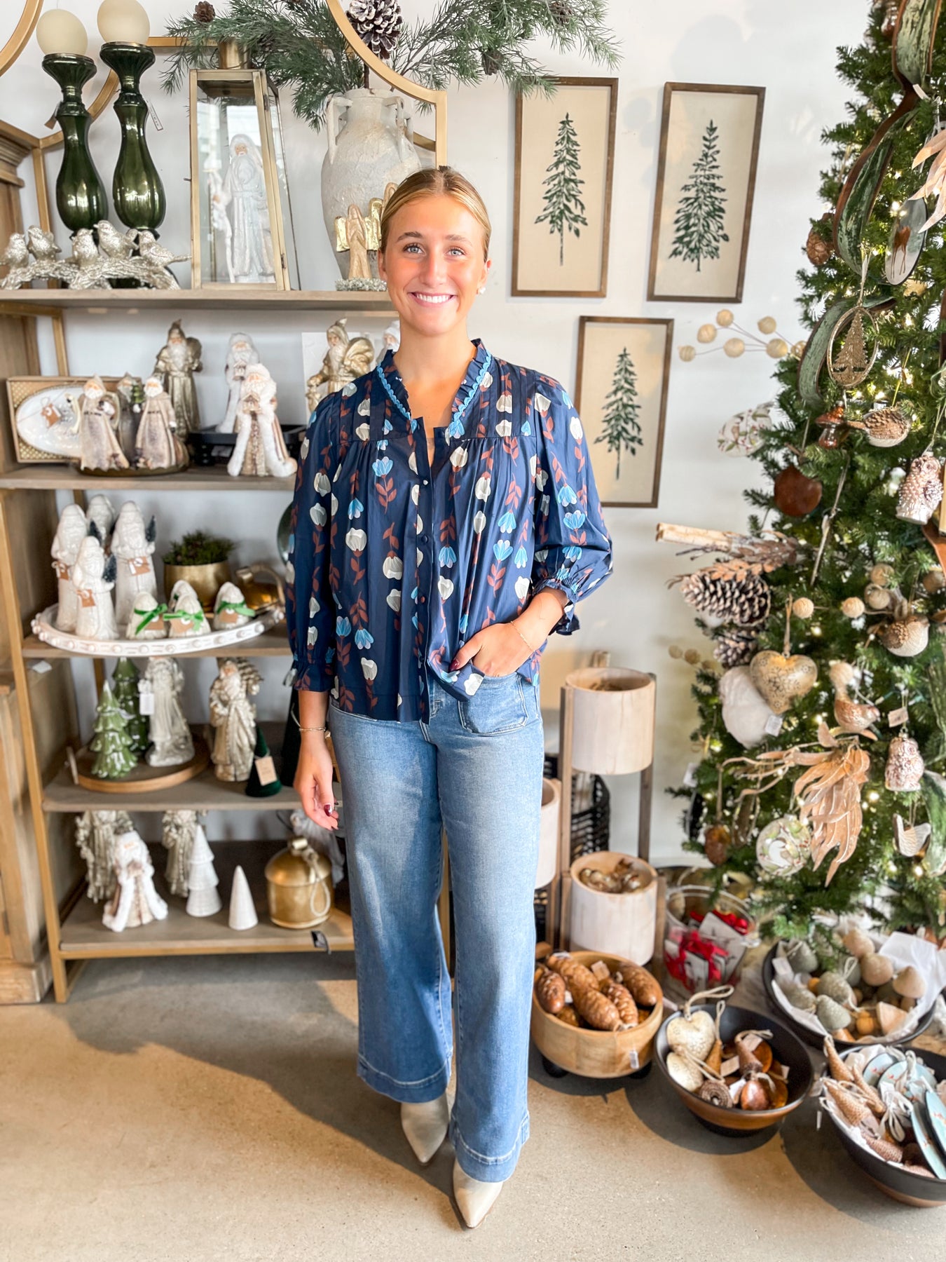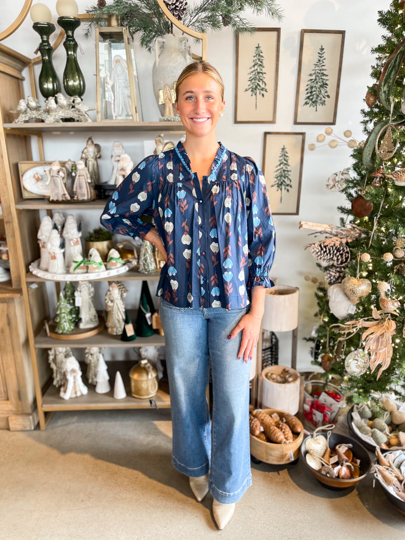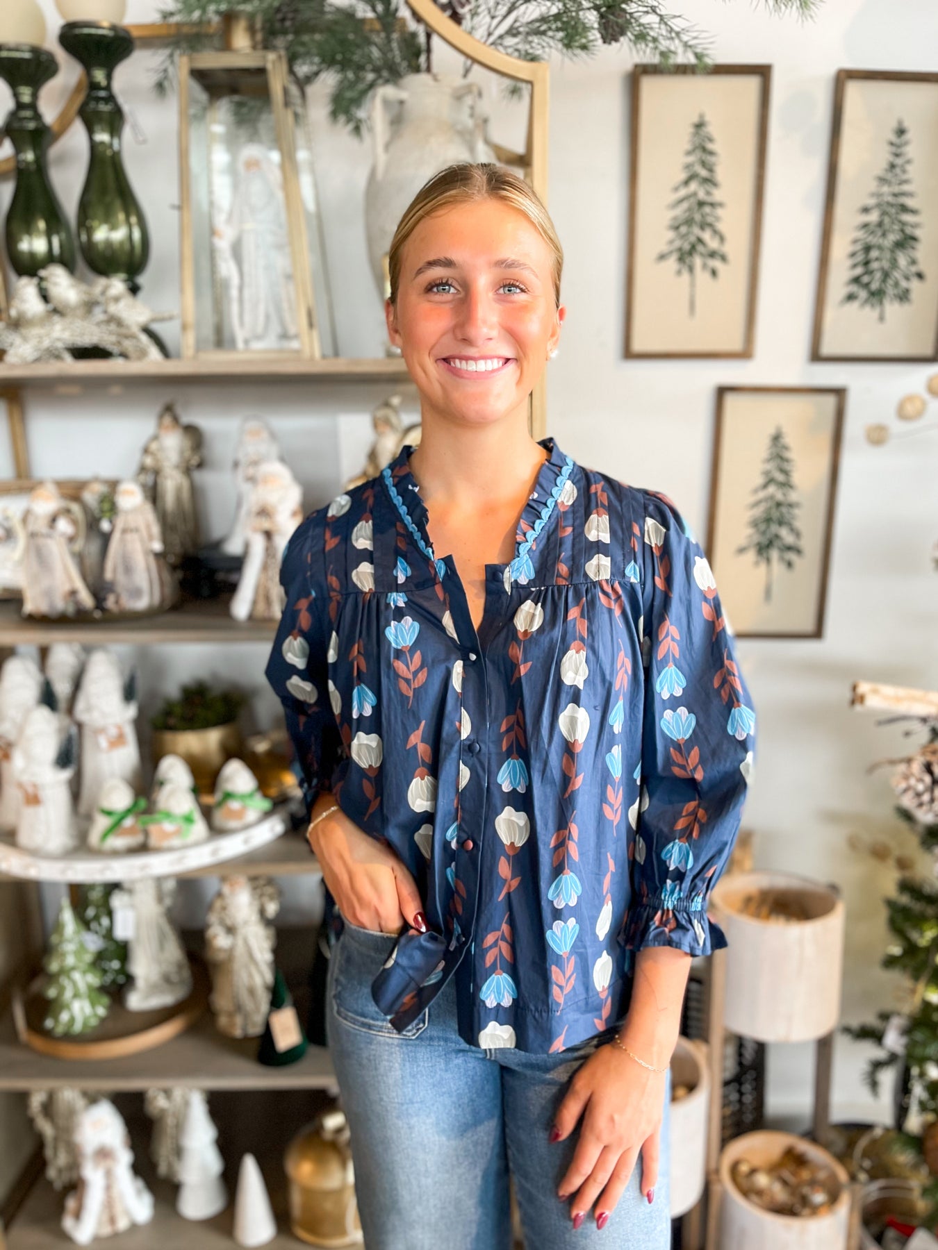 This stunning navy top is a floral dream! Vibrant red and grey printed florals dance across the fabric, creating visual interest and charm. The delicate scalloped neckline adds feminine elegance, while the pleated bust creates beautiful dimension and flattering structure. Lightweight and breathable, it's perfect for layering or wearing solo, and the elastic wristband with a playful ruffle detail keeps things fun and trendy. Stylish enough for brunch, casual enough for everyday wear—this top is your ticket to looking effortlessly put-together no matter the occasion!