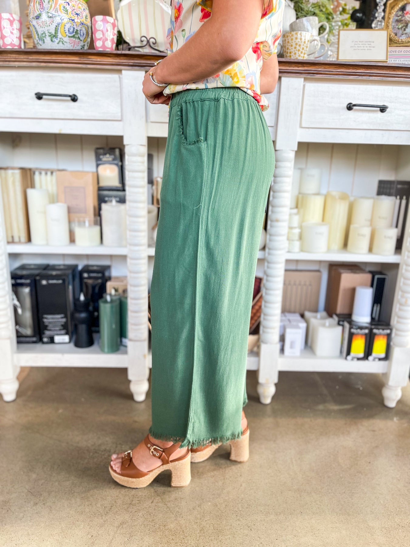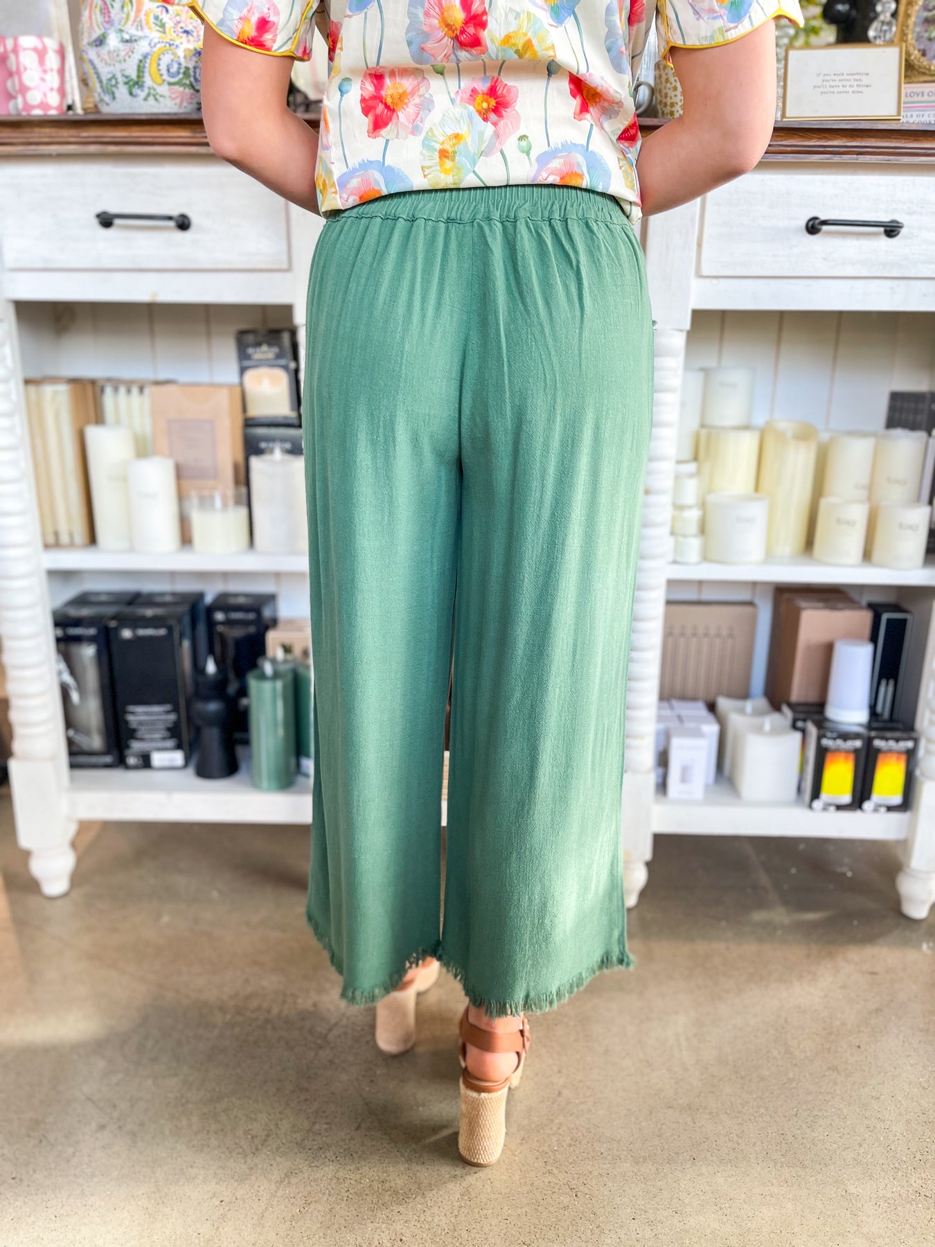 Don't let this old favorite slip away! The Umgee Palm Green Wide Leg Pant is back and better than ever. Stunning in a neutral green shade, these lightweight pants are your spring essential with a comfy elastic waistband and practical pockets. The trendy raw hem adds an effortless, modern touch that elevates any look. Comfortable, stylish, and oh-so-easy to wear—grab yours before they're gone!