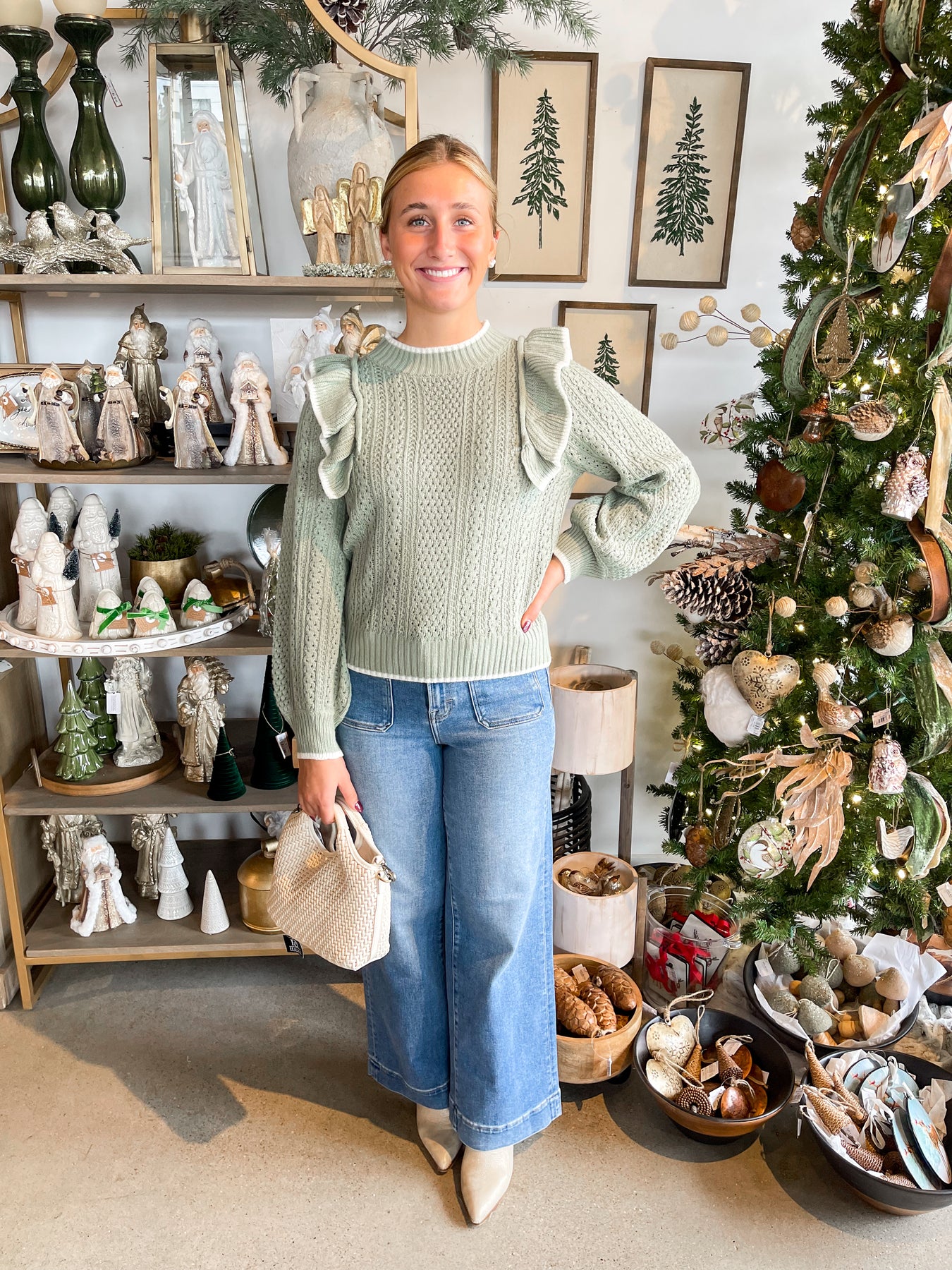 Embrace the season in this gorgeous sage green sweater that's equal parts cozy and chic! Crafted from chunky knit fabric, it delivers serious texture and warmth while the delicate white ruffle accents add a feminine, dressy touch. The fitted silhouette flatters your figure beautifully, making it perfect for elevating your everyday look or dressing up for special occasions. Trendy and timeless, this sweater transitions seamlessly from fall into winter, becoming your go-to piece for looking effortlessly stylish when the temperatures drop. Pure seasonal perfection!