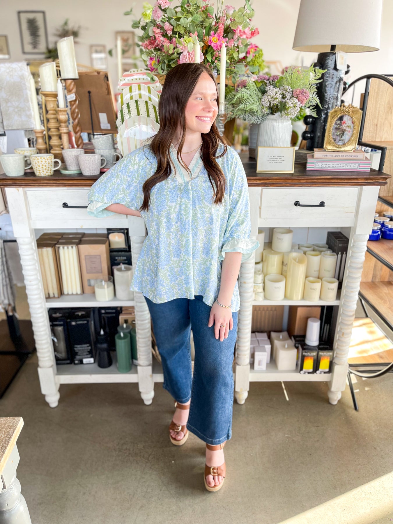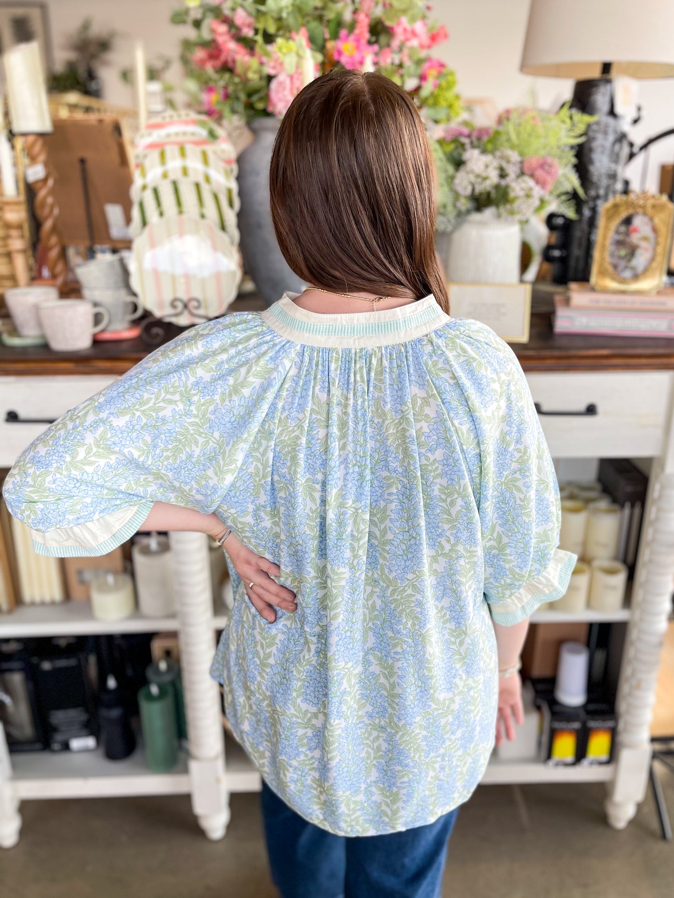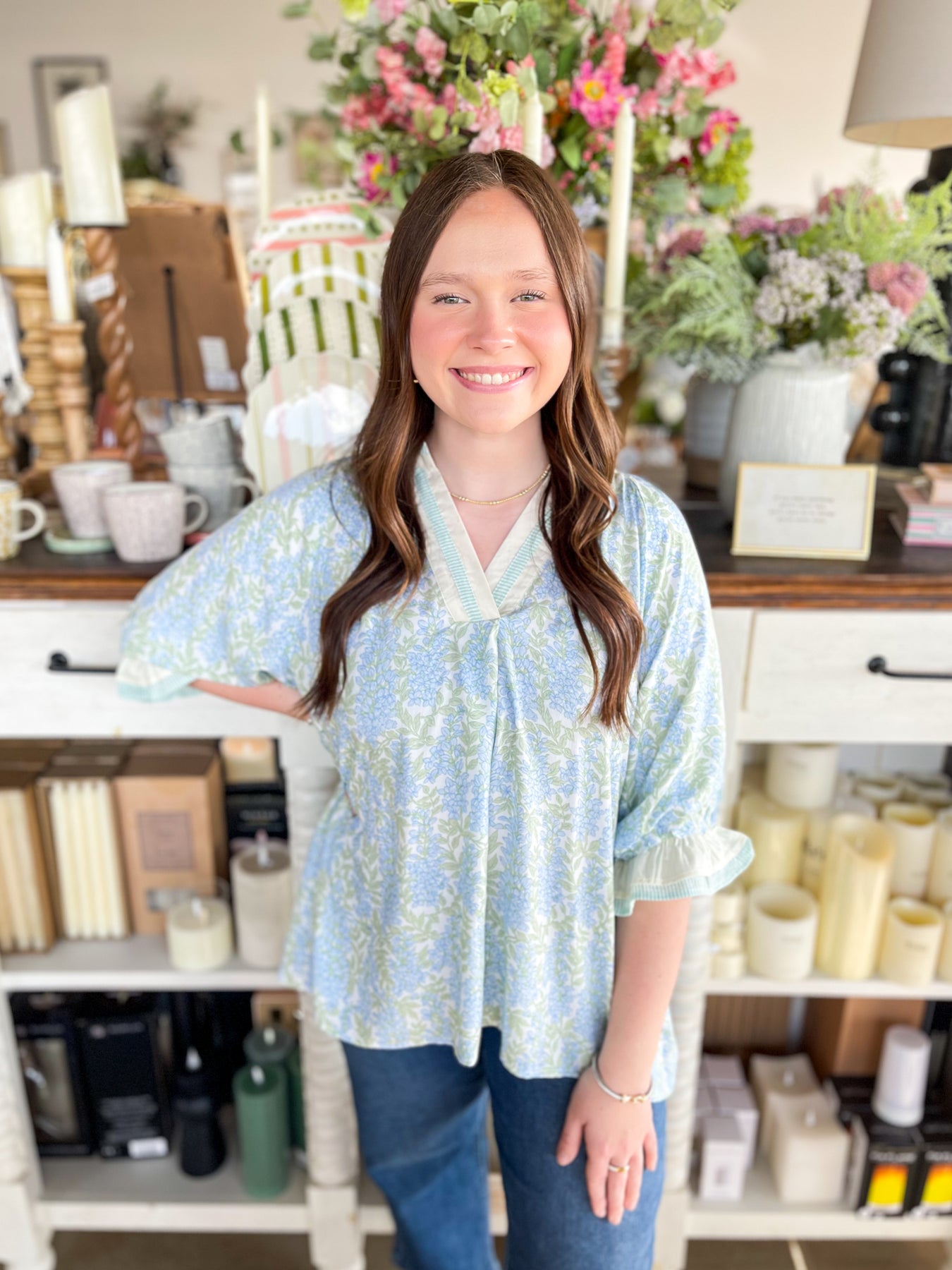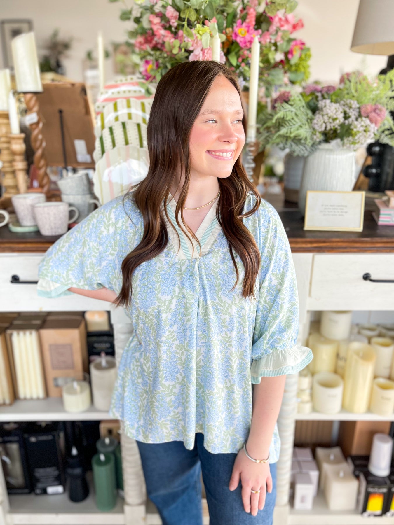Fall head over heels for the Umgee Sky Mix Isla Top—your new spring essential! Super soft and wonderfully oversized, this lightweight beauty drapes just right for maximum comfort and style. The dainty blue and green floral print brings a fresh, trendy vibe that screams seasonal perfection. A charming varsity neckline pairs beautifully with three-quarter sleeves finished with elastic and ruffles for that extra touch of playful detail. Slip it on and feel the difference—this top is pure comfort wrapped in stunning style!